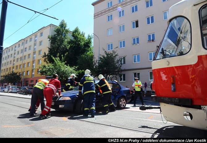 Nehodu tramvaje a osobního auta před polednem v Praze 10 likvidovaly dvě jednotky hasičů