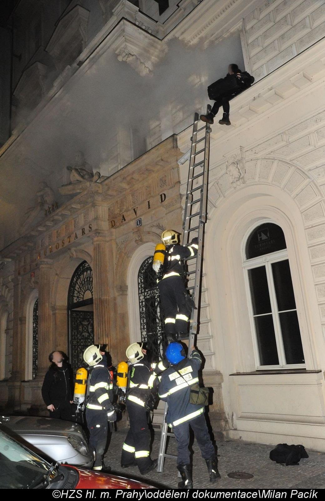 Celý objekt byl silně zakouřen, bylo nutné klienty hotelu evakuovat a z důvodu členitého prostoru uvnitř objektu hrozilo nebezpečí ztráty orientace. Hasiči zasahovali ve dvou bojových úsecích. Krajské operační a informační středisko na místo postupně vyslalo celkem 17 jednotek - 10 profesionálních jednotek pražských hasičů, chemickou jednotku z Petřin, jednotku Hasičského útvaru ochrany Pražského hradu a 6 jednotek dobrovolných hasičů. Zbylé pražské dobrovolné jednotky byly povolány k záloze na vlastních stanicích k pokrytí území hl.m. Prahy.