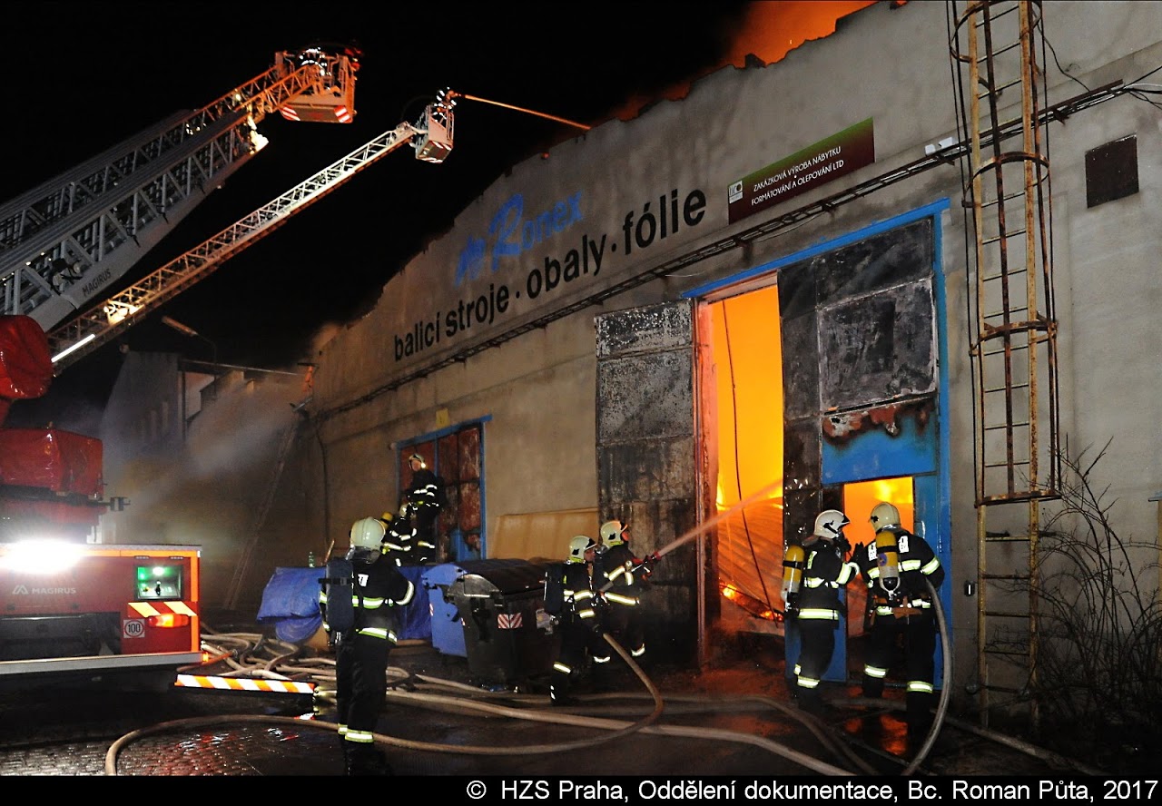 K požáru haly v Mladoboleslavské ulici v pražské Vinoři vyjelo v 19:01 hodin dne 05.12.2017  32  jednotek hasičů.