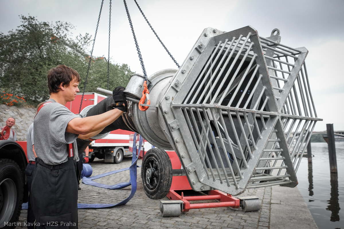 Cvičení hasičů na Smíchovské náplavce