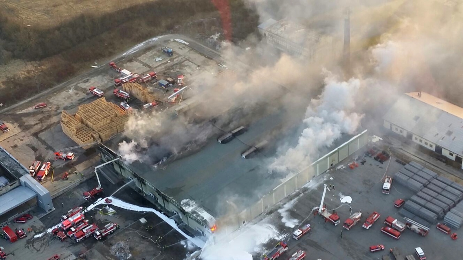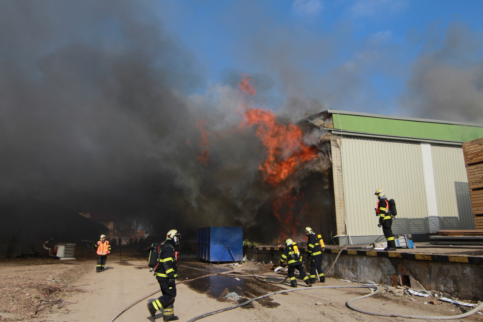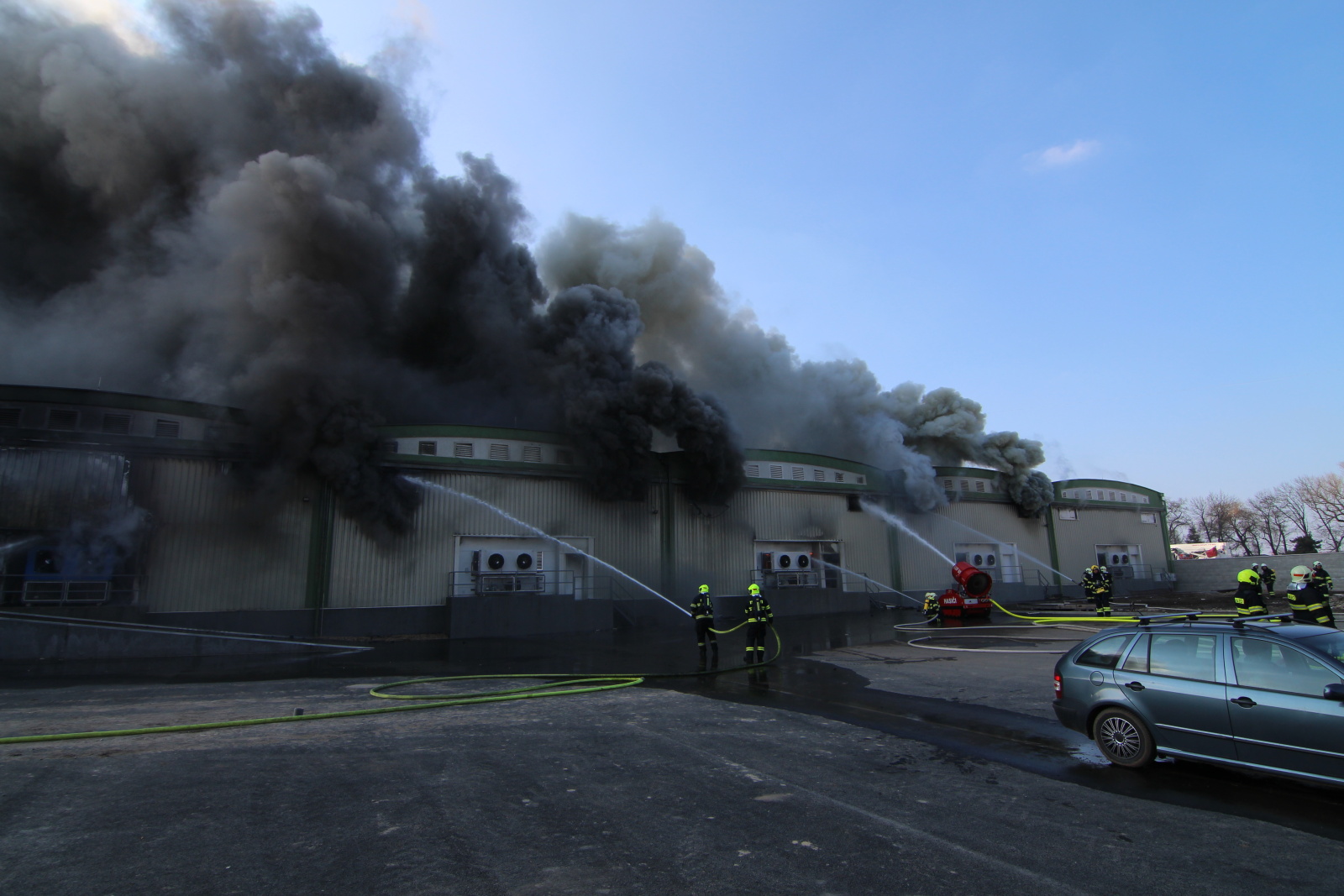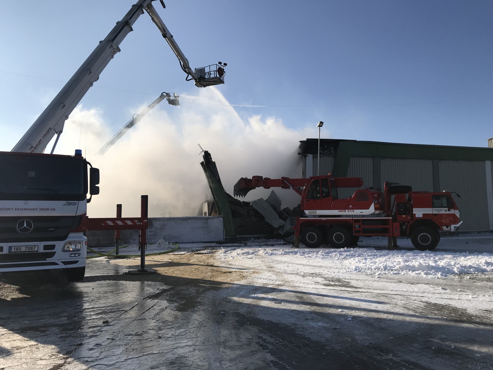 I přes veškerou snahu se hasičům stále nedařilo dostat požár pod kontrolu. Velitel zásahu proto rozhodl o vyhlášení zvláštního stupně požárního poplachu a požádal o další posily. Na místě se tak sjelo přes padesát jednotek hasičů. Požářiště bylo následně rozděleno do čtyř bojových úseků, kdy na jednom z nich byl nasazen i speciální hasicí robot LUF 60 podnikové jednotky Auto Škoda z Mladé Boleslavi. Požárem narušená hala byla poměrně nestabilní, proto probíhal zásah pouze z vnějšku a převážně z výškové techniky za pomoci mnoha C proudů. V odpoledních hodinách se zřítila část jedné z obvodových stěn a poté se propadl i kus střechy. O pomoc tak byla požádána Letecká služba Policie ČR, která pomocí bambi vaku provedla několik shozů vody dovnitř požářiště.