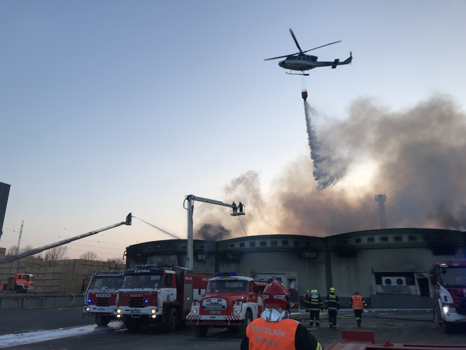 Kvůli nepříznivým povětrnostním podmínkám, poměrně silnému mrazu a dlouhotrvajícímu zásahu muselo častěji docházet ke střídání zasahujících hasičů, kterým bylo na místě zbudováno zázemí formou vyhřívaných nafukovacích stanů, kde byl zajištěn dostatečný přísun teplých nápojů a stravy. Ve večerních hodinách neměli hasiči požár stále ještě pod kontrolou, ale už nehrozilo, že by se dostal mimo vlastní budovu. Na poradě zřízeného štábu velitele zásahu bylo rozhodnuto o vyžádání Záchranného útvaru HZS ČR Zbiroh a Hlučín se speciální těžkou technikou a došlo k první redukci zasahujících jednotek. Práce za účasti asi stovky hasičů pokračovaly celou noc, kdy bylo nejprve nutné požářiště nasvítit osvětlovacími balony.