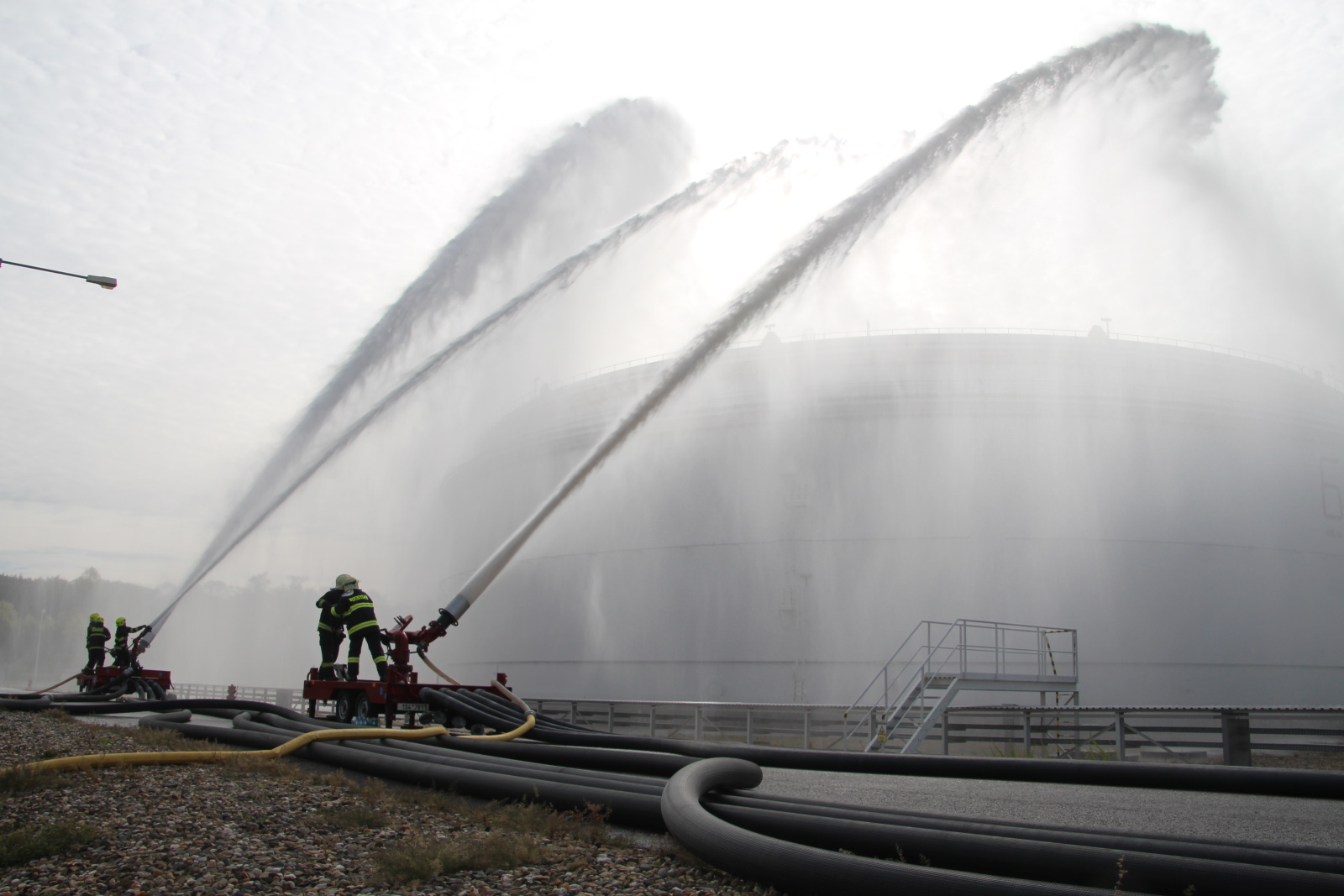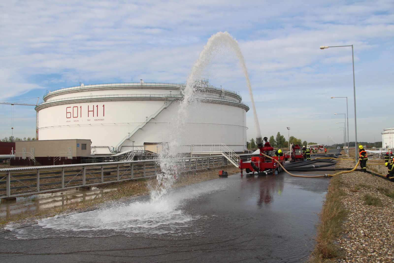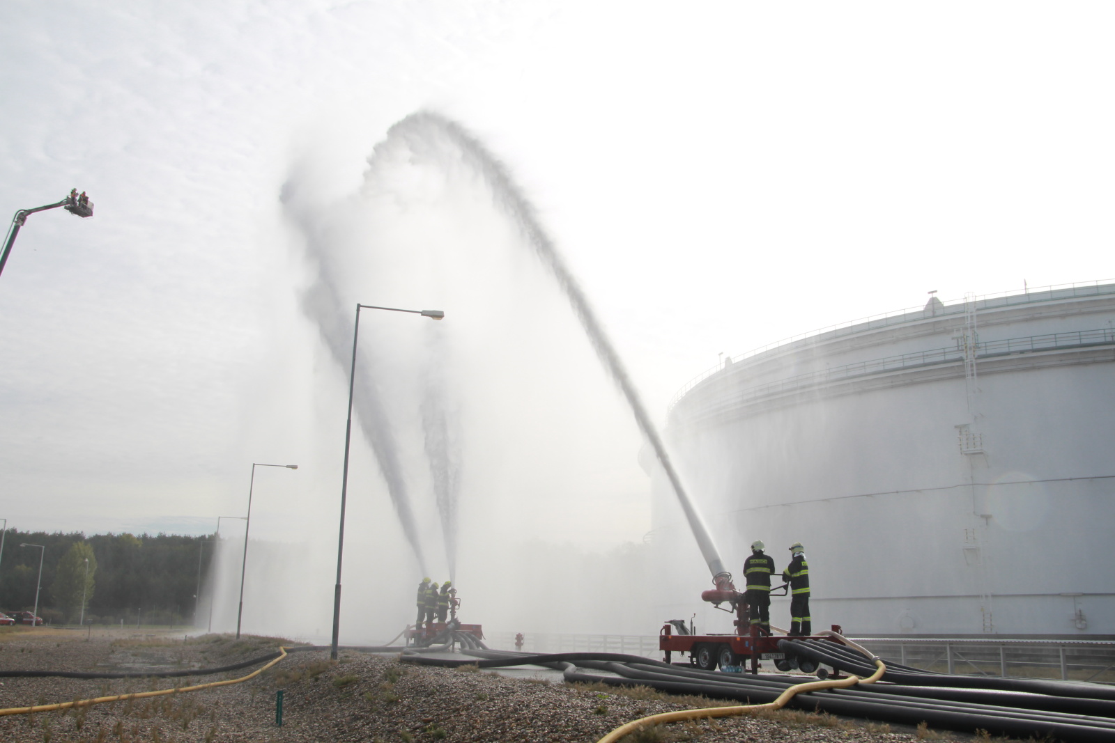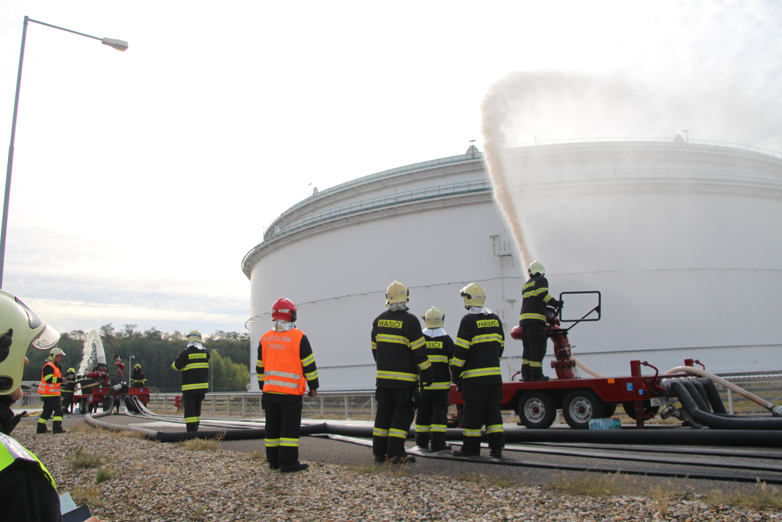 Po příjezdu hasičů na místo byl zřízen štáb velitele zásahu a následně požářiště rozděleno do několika úseků. Poté hasiči připravili přívodní vedení ke dvěma přívěsným monitorům Ambasador. Pak bylo celé vedení zavodněno a následně byl proveden cvičný výstřik na střechu nádrže. Poté bylo cvičení ukončeno. Na krátkém vyhodnocení poděkoval velitel zásahu všem zúčastněným jednotkám.