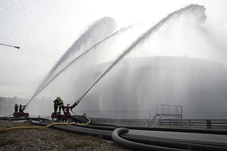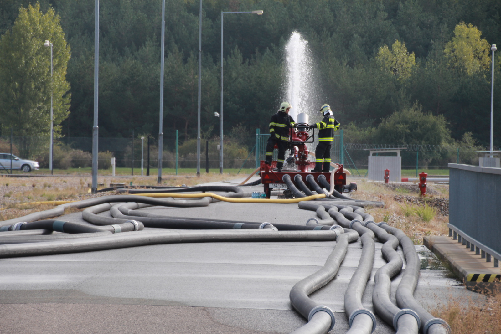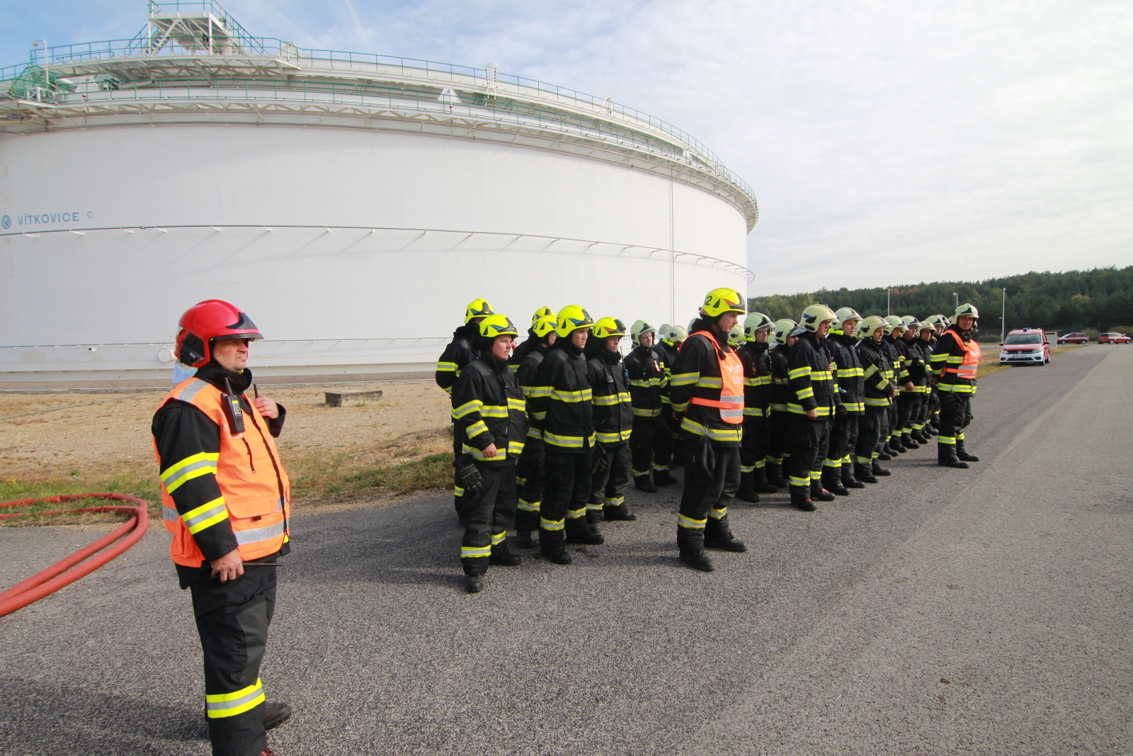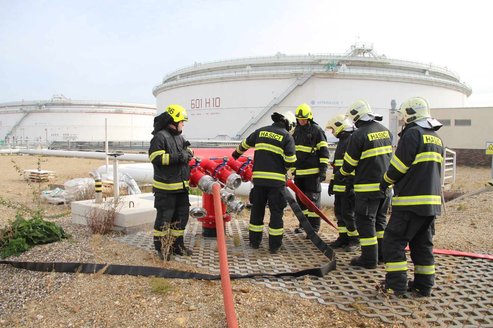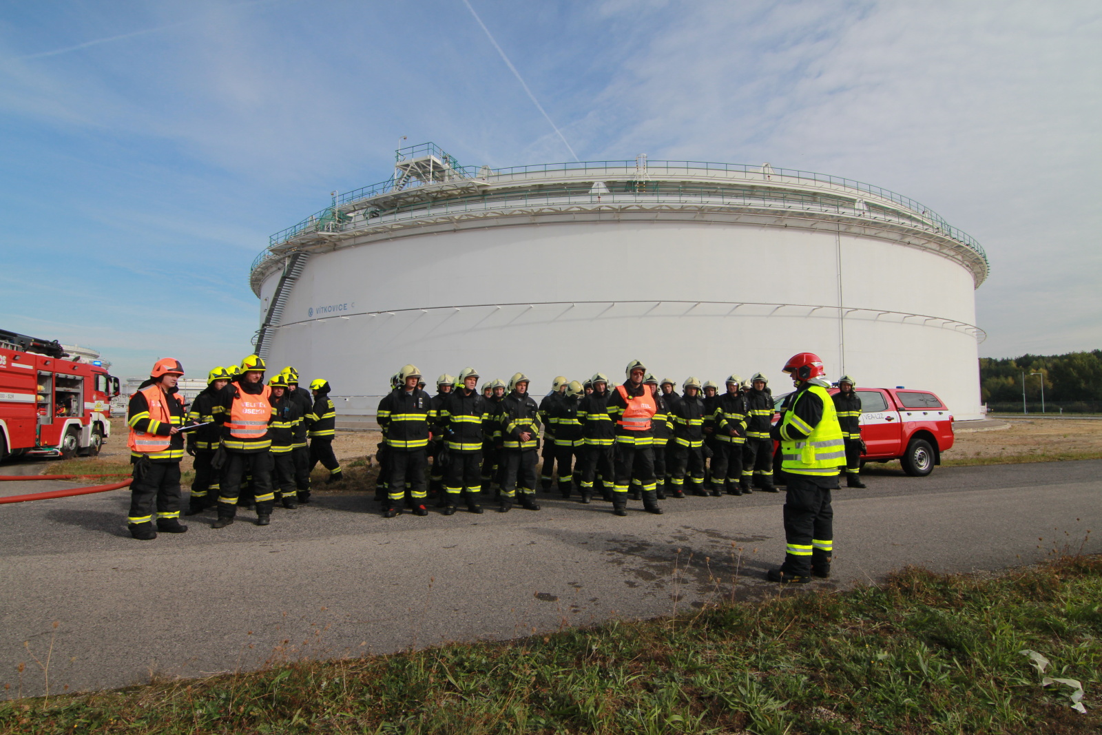 Po příjezdu hasičů na místo byl zřízen štáb velitele zásahu a následně požářiště rozděleno do několika úseků. Poté hasiči připravili přívodní vedení ke dvěma přívěsným monitorům Ambasador. Pak bylo celé vedení zavodněno a následně byl proveden cvičný výstřik na střechu nádrže. Poté bylo cvičení ukončeno. Na krátkém vyhodnocení poděkoval velitel zásahu všem zúčastněným jednotkám.