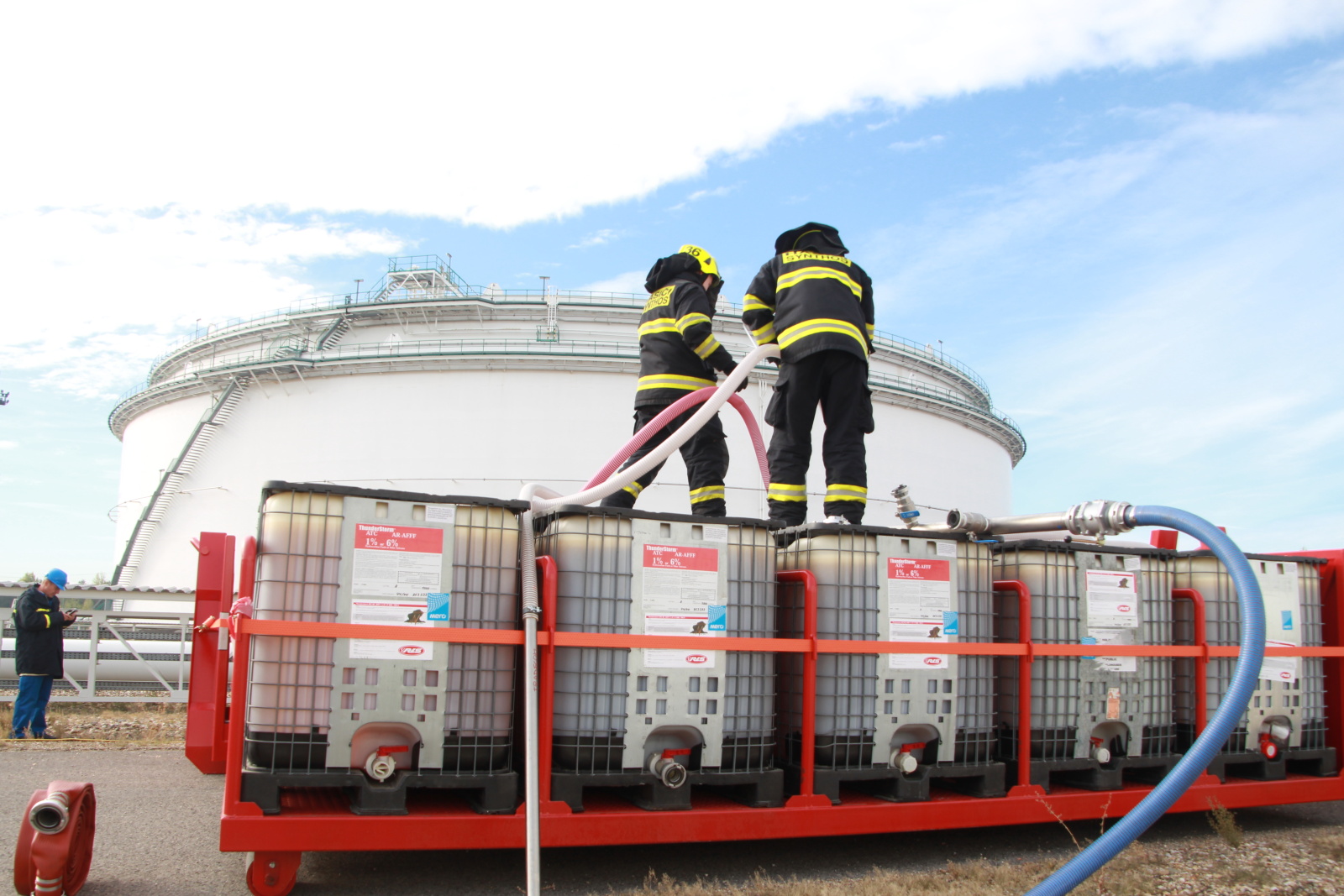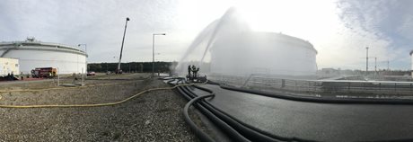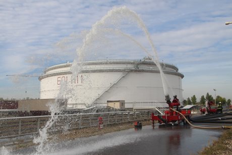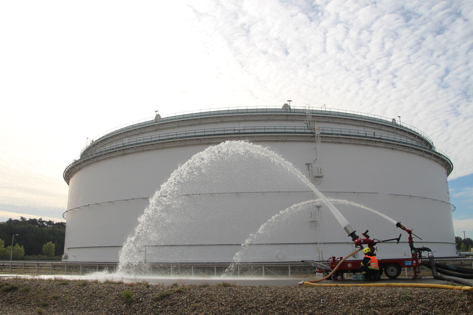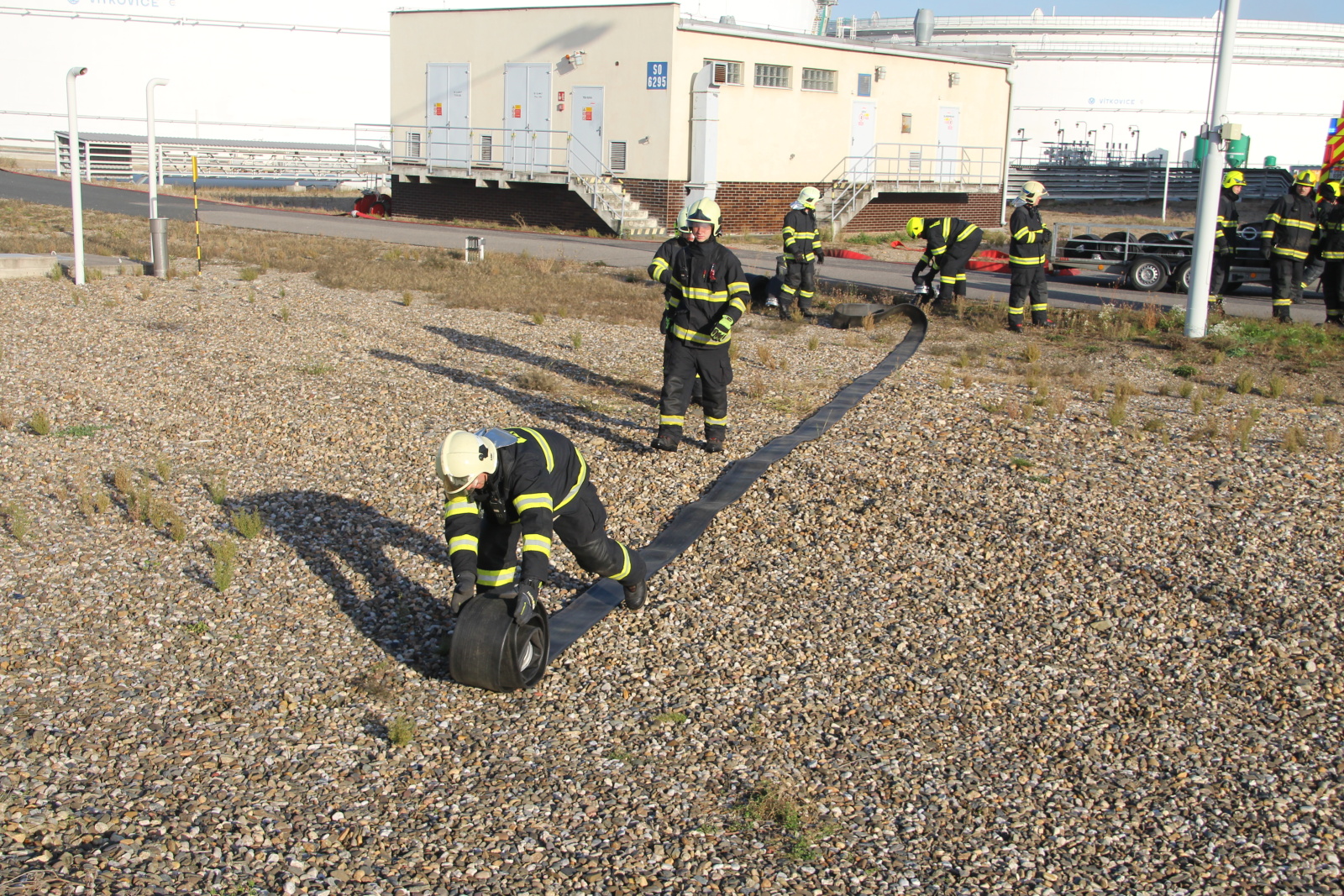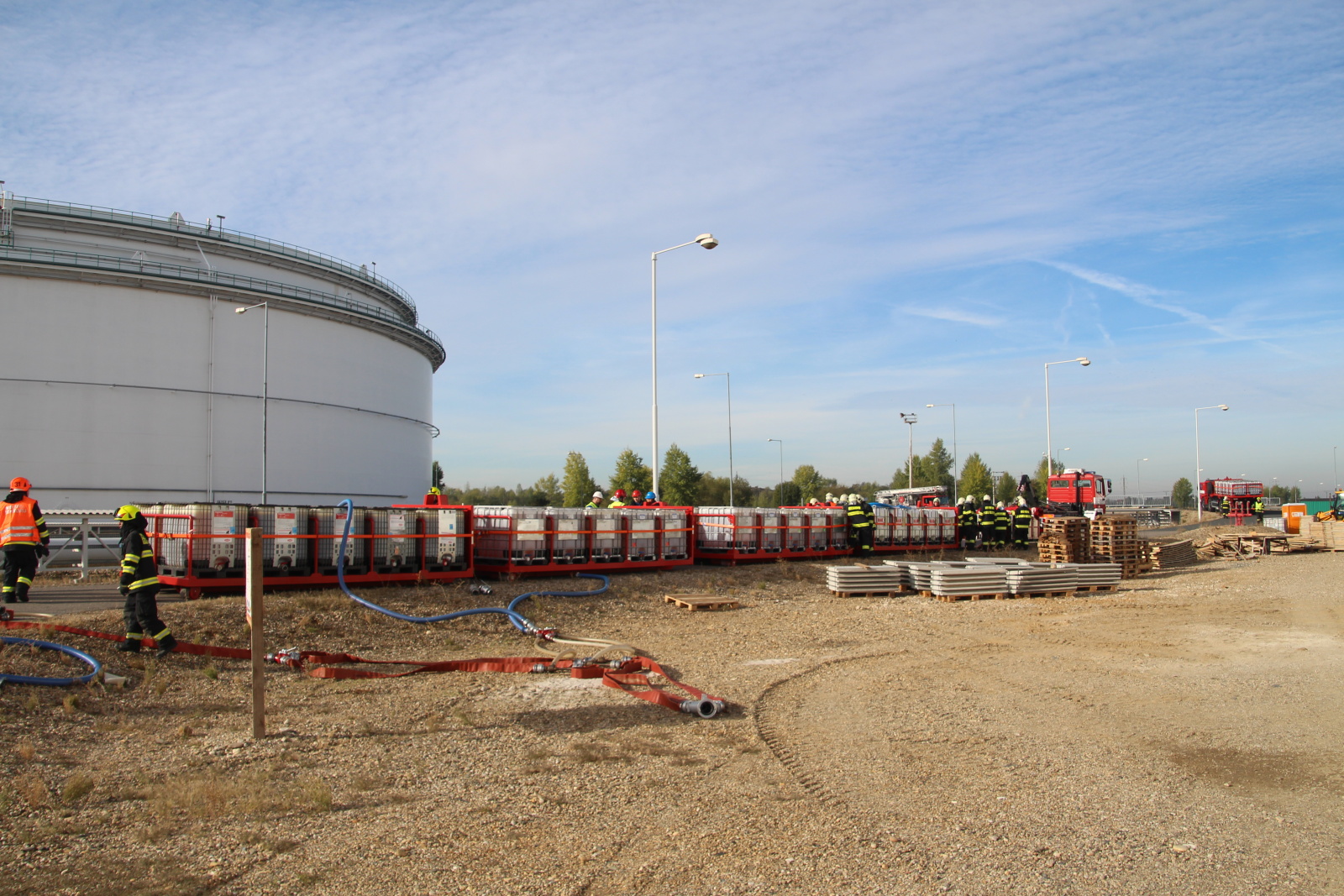 Po příjezdu hasičů na místo byl zřízen štáb velitele zásahu a následně požářiště rozděleno do několika úseků. Poté hasiči připravili přívodní vedení ke dvěma přívěsným monitorům Ambasador. Pak bylo celé vedení zavodněno a následně byl proveden cvičný výstřik na střechu nádrže. Poté bylo cvičení ukončeno. Na krátkém vyhodnocení poděkoval velitel zásahu všem zúčastněným jednotkám.