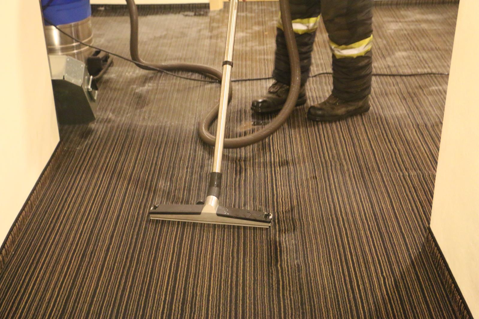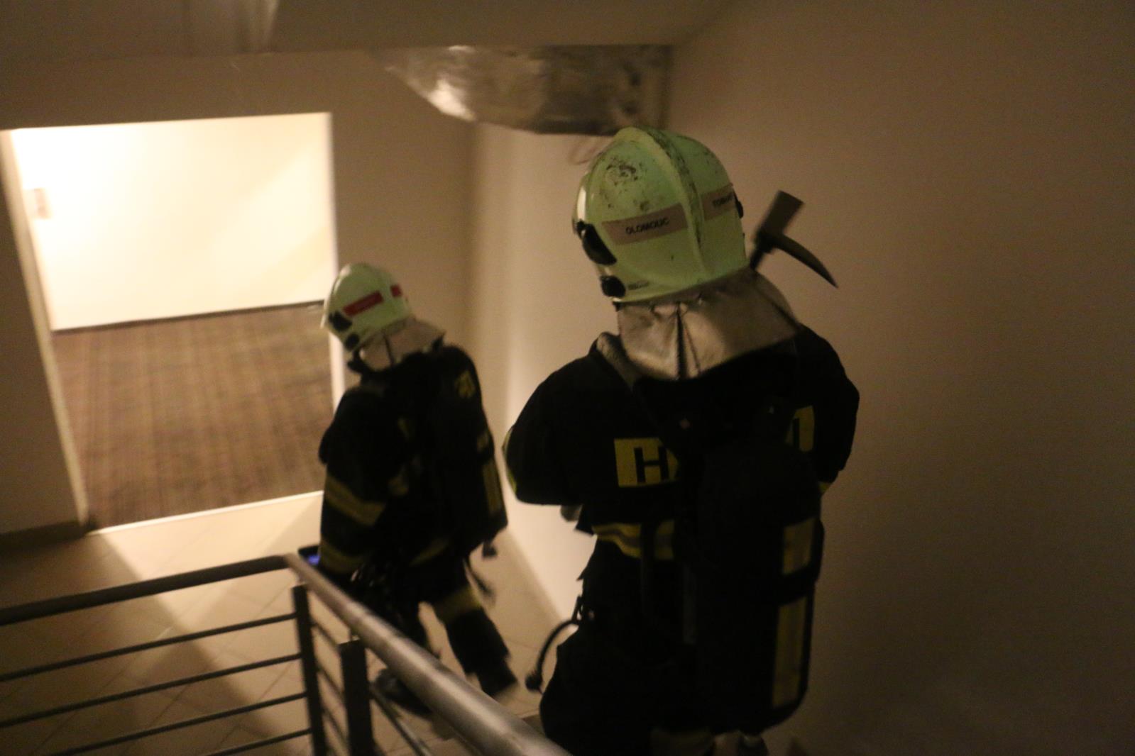 Hasiči provedli průzkum v podlaží po požáru, prostory nebyly nijak výrazně zakouřeny. Po celkové kontrole a vyloučení možných skrytých ohnisek jednotky zahájily odčerpání vody z chodeb, poté co zde účinně zafungovalo automatické hašení.