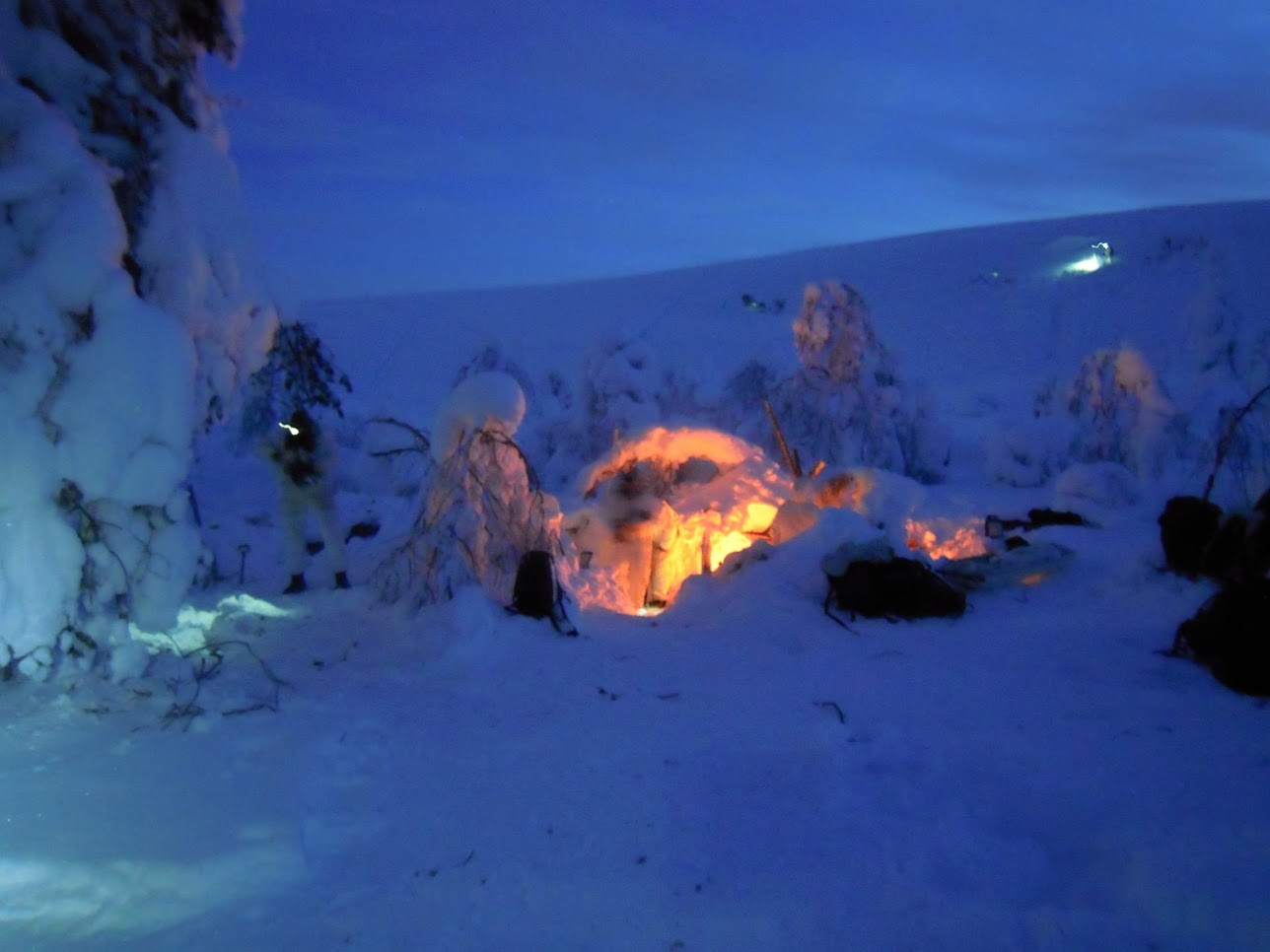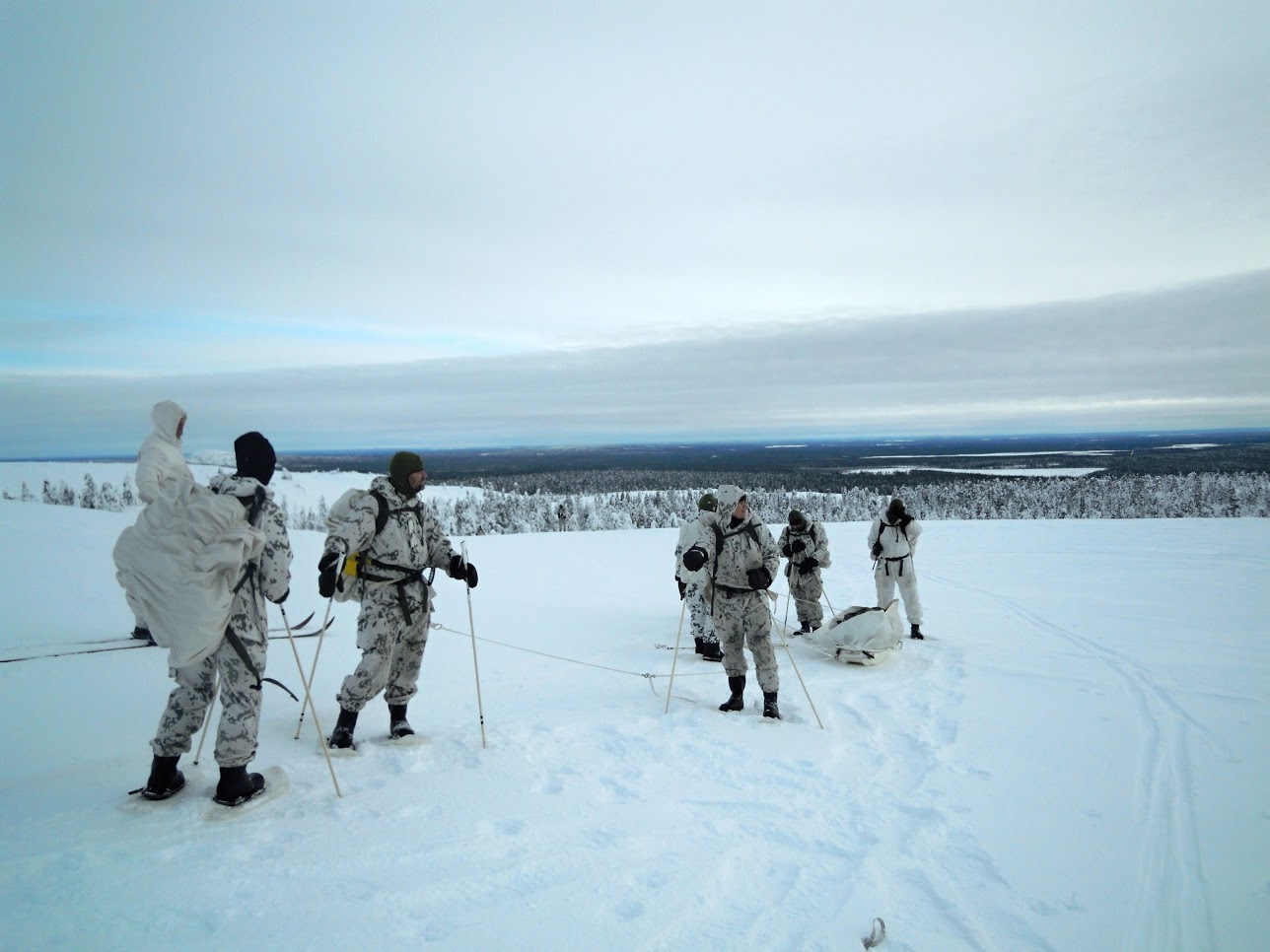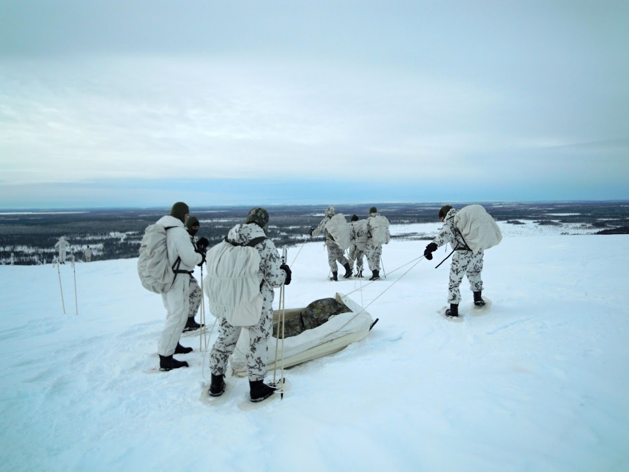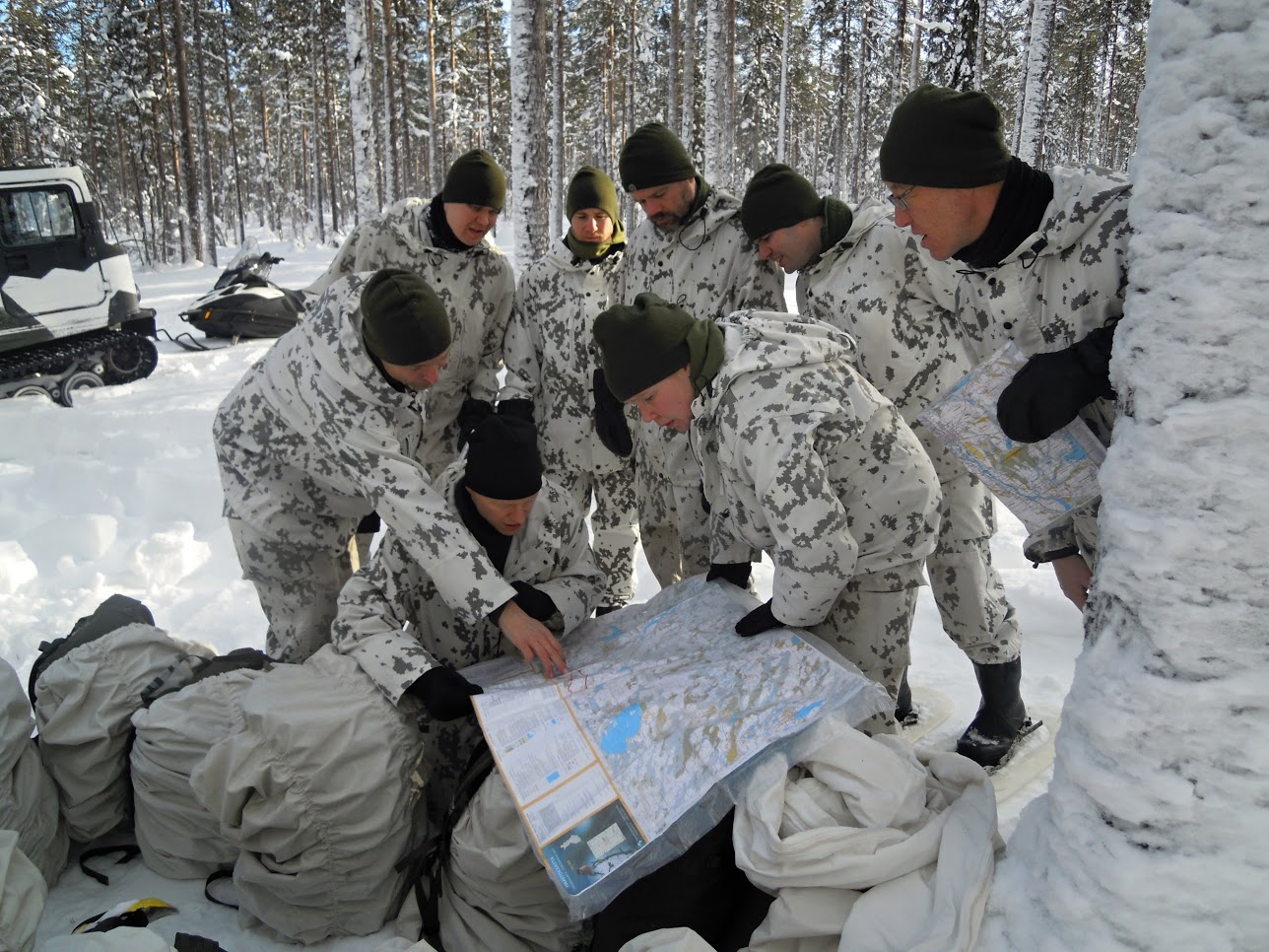 Dále si vyzkoušeli navigaci v neznámém terénu za pomocí map a kompasu s hromadným 5 kilometrovým přesunem hlubokým sněhem za pomocí sněžnic, kdy si veškerý materiál nutný pro přežití nesli v batozích na zádech nebo táhli na saních.