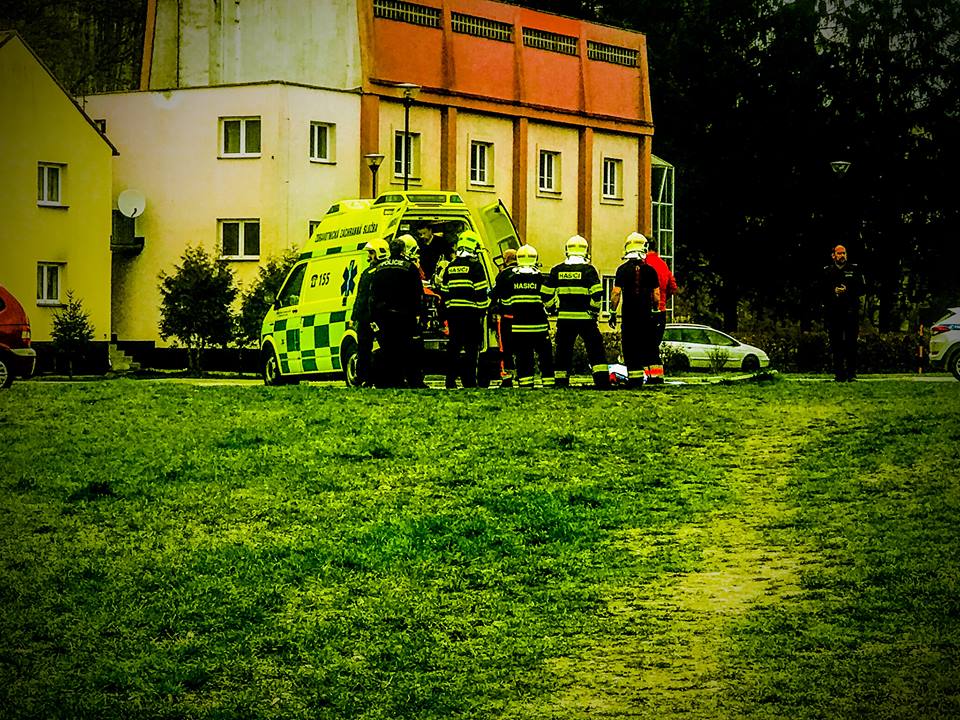Po otevření bytu proběhl transport pacienta do sanitky a následně do vrtulníku LZS.