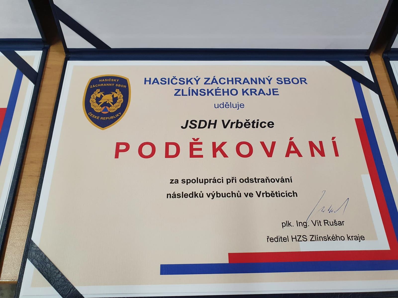 Ocenění zároveň převzali poděkování ředitele HZS Zlínského kraje plk. Ing. Víta Rušara „Za spolupráci při odstraňování následků výbuchů ve Vrběticích".