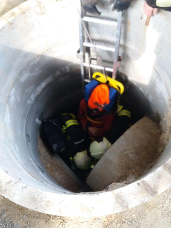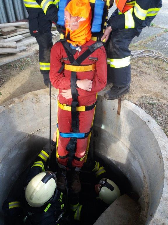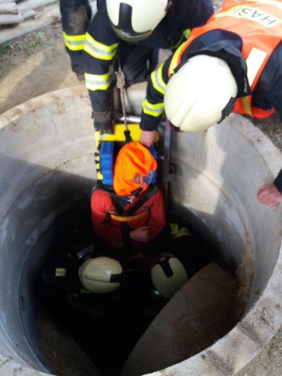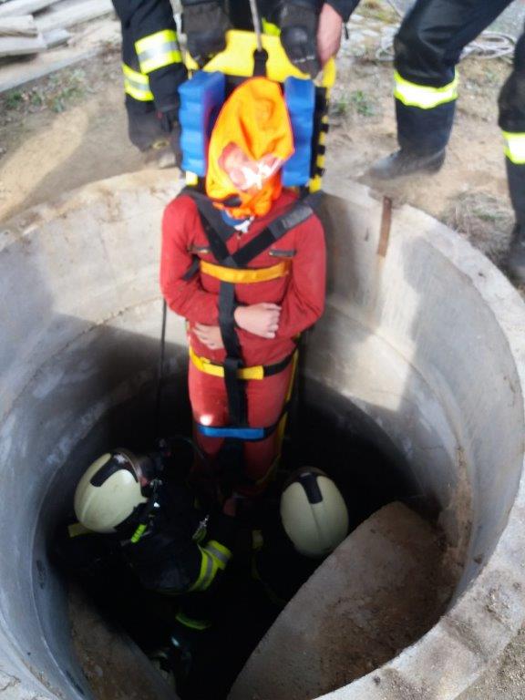 Družstvo z cisterny provedlo průzkum a vyhledalo osobu v šachtě. Během záchranných prací, které hasiči prováděli v podzemním labyrintu v dýchací technice, se družstvo z druhé cisterny připravilo na vytažení osoby ze šachty.