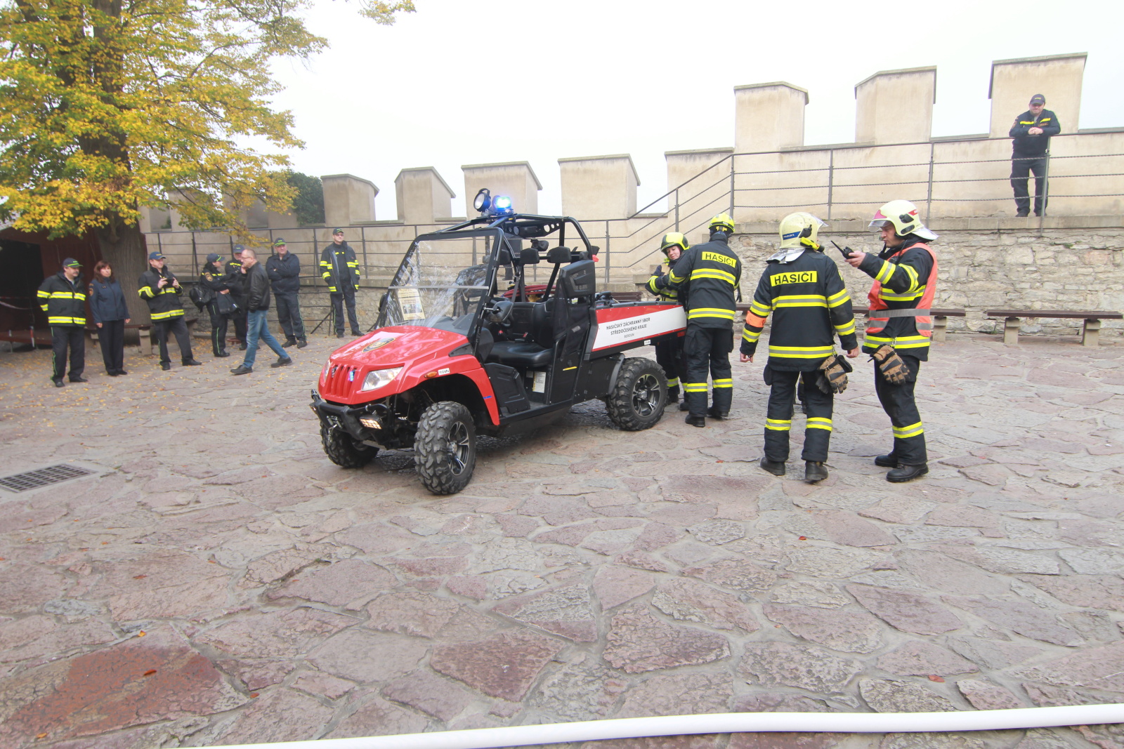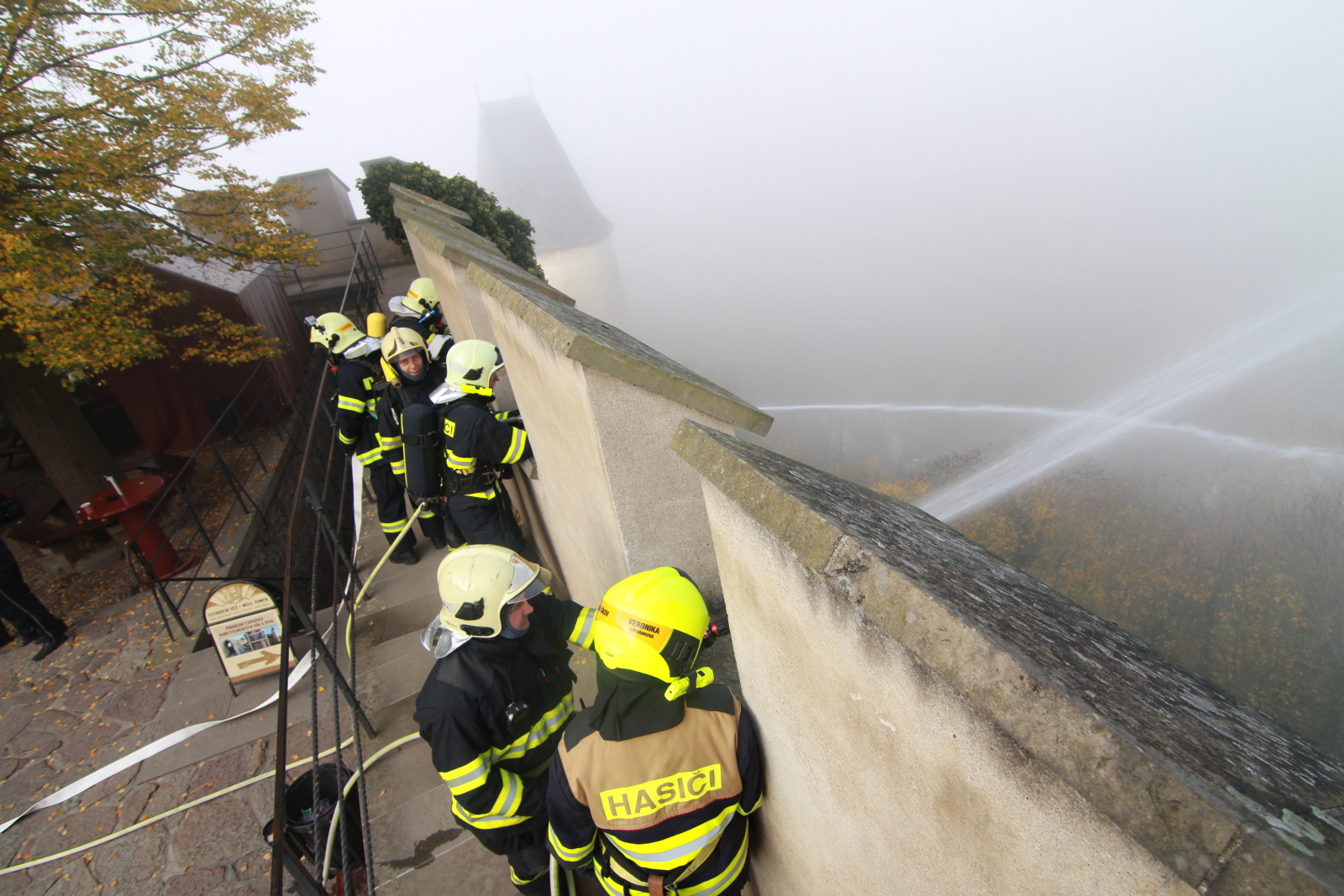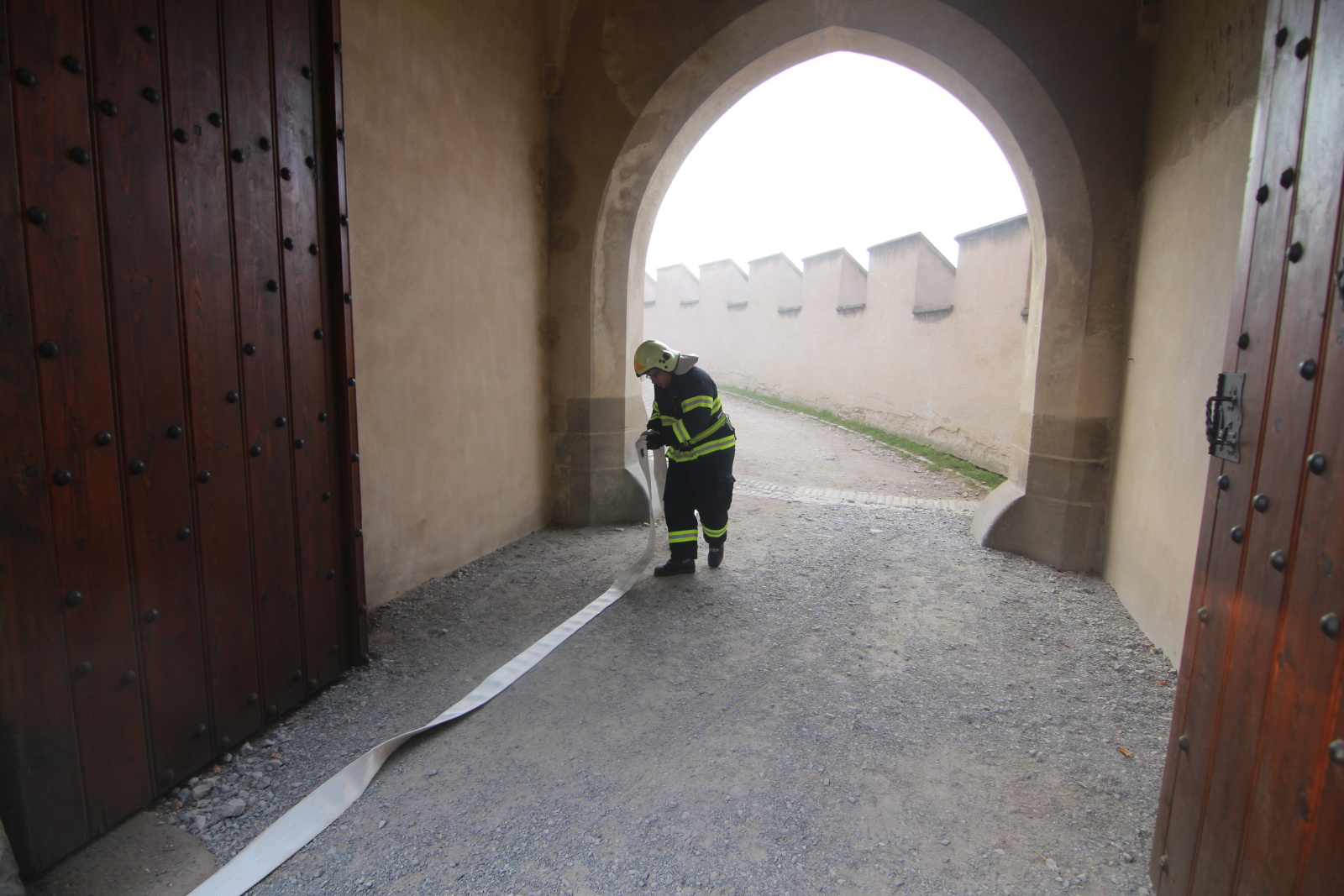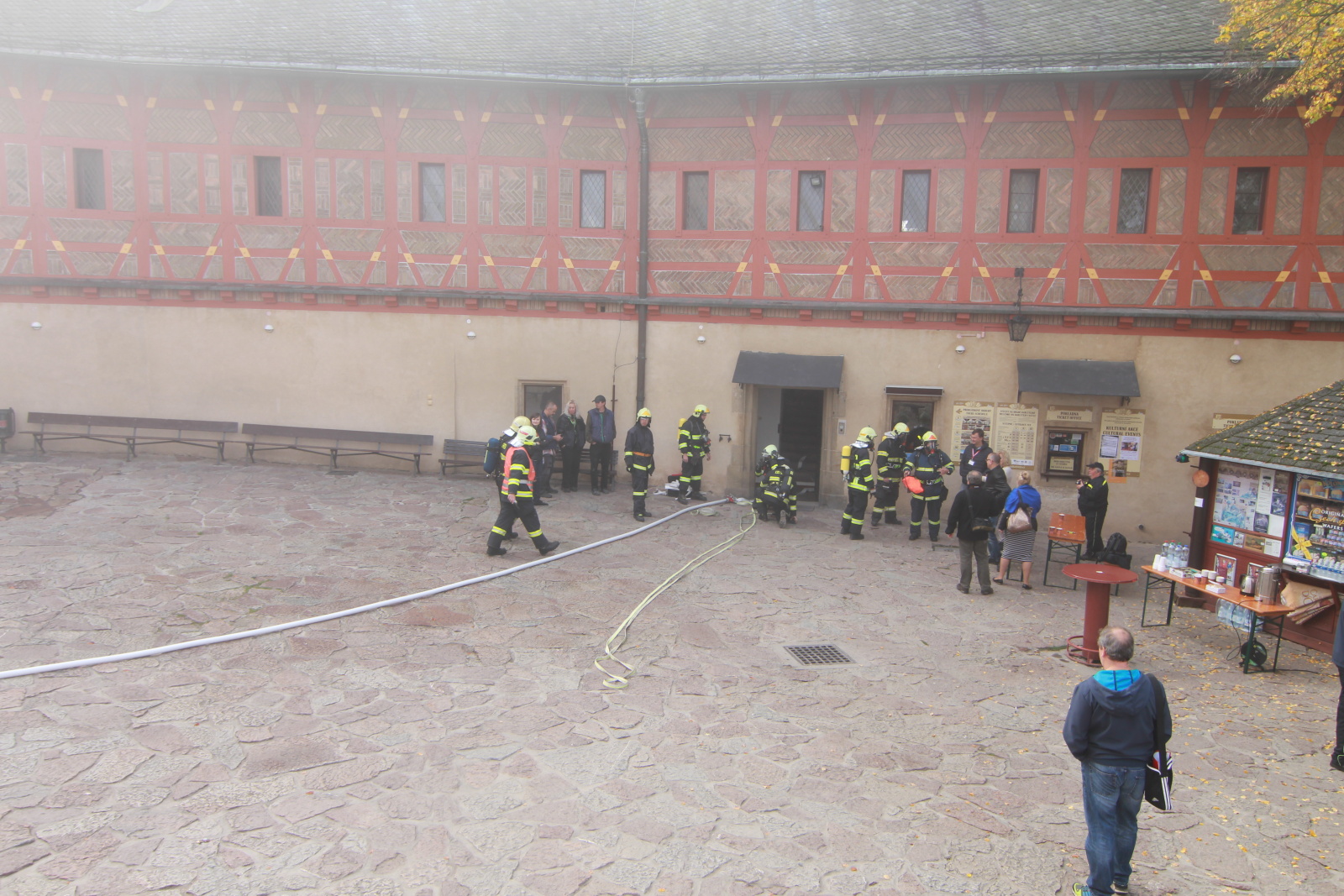 Součástí cvičení bylo i otestování suchovodu (je součástí požárně bezpečnostního zařízení hradu) na Velké věži, kam byla pomocí cisternové automobilové stříkačky vytlačena voda až do půdního prostoru.