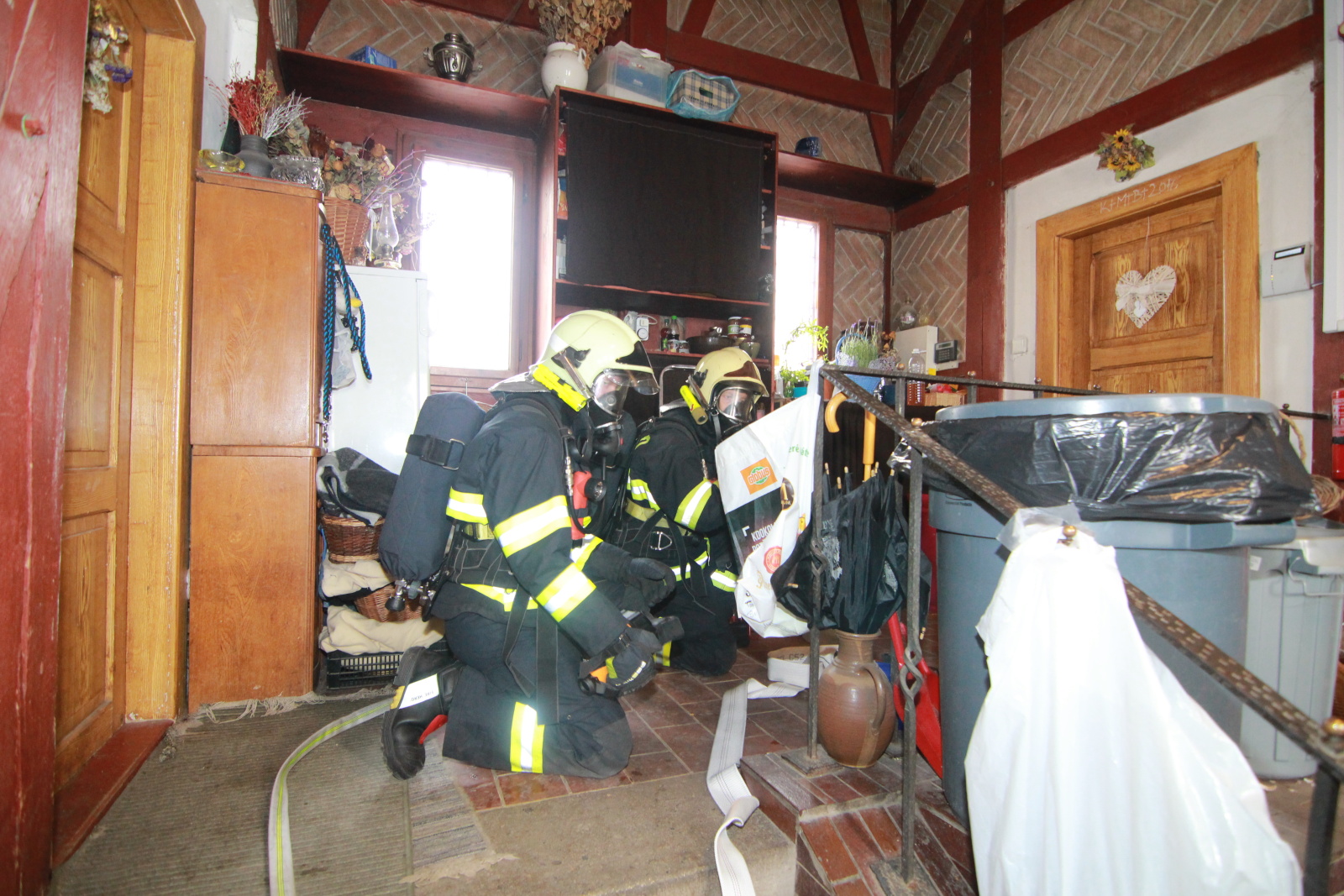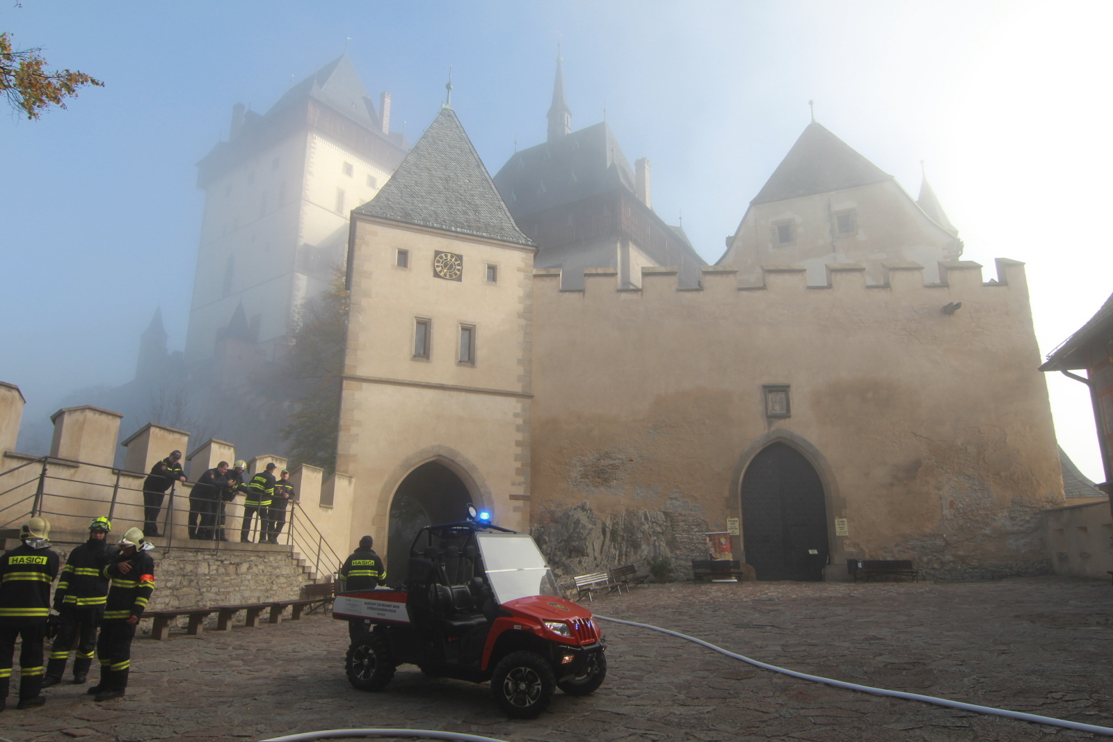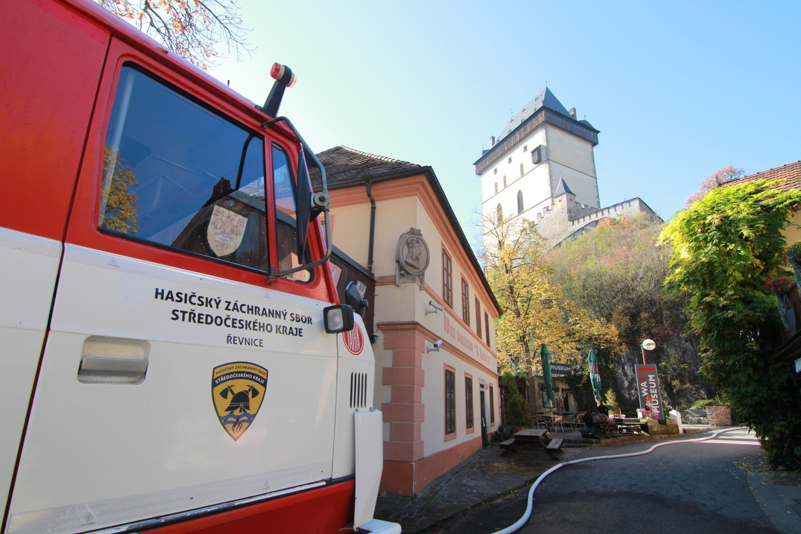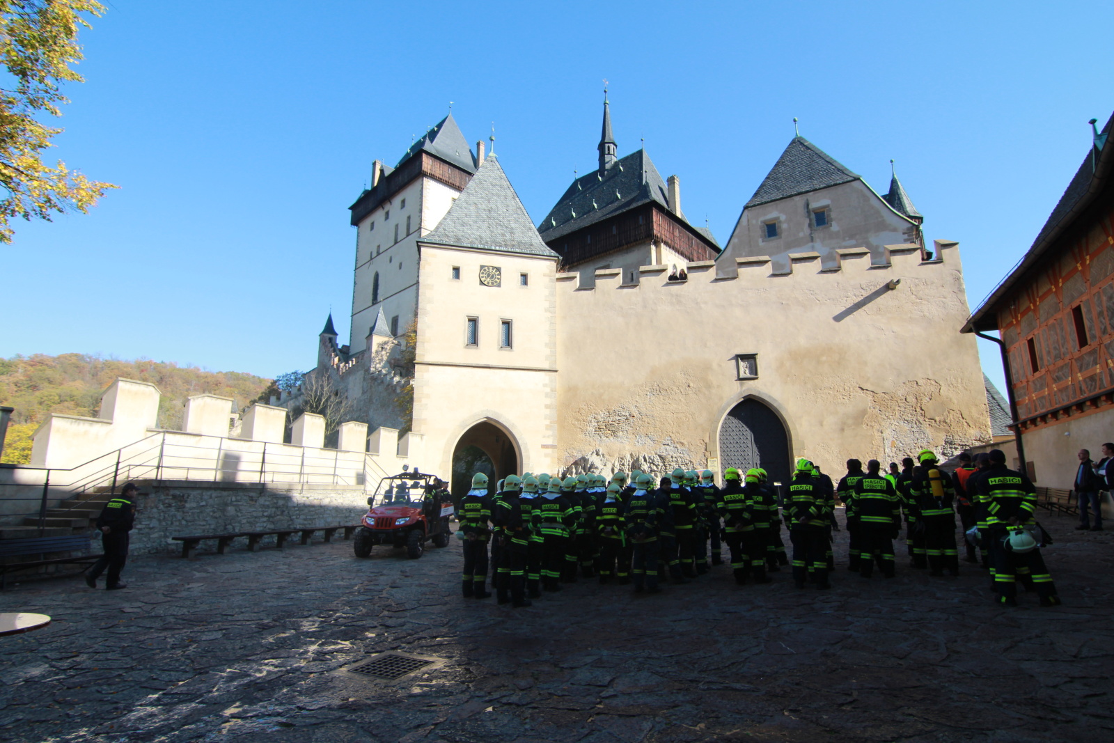 Jako první se k místu události dostavil velitel čety z Řevnic, kterého následovala karlštejnská dobrovolná jednotka. Během několik málo minut bylo nataženo nejprve dopravní vedení, které pak bylo na nádvoří pomocí rozdělovače přetvořeno na útočné s jedním C a jedním D proudem. Hasičům se podařilo v krátké chvilce simulovaný požár zlikvidovat. Následovalo přesunutí proudů k hradbám s výstřikem vody. K dopravě materiálu na nádvoří hasiči využili čtyřkolku, která byla pořízena z Integrovaného operačního programu.