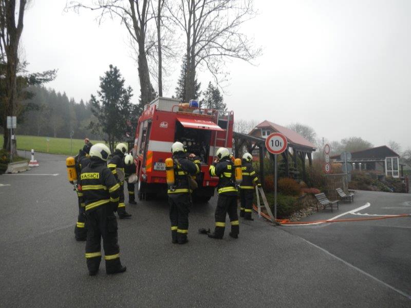 K likvidaci požáru vyjely se dvěma zásahovými vozy profesionální hasiči ze stanice Vimperk. Velitel zásahu po příjezdu jednotky na místo dostává od zaměstnanců domova základní informaci o požáru a o vypnutí přívodů elektrické energie a plynu do objektu. Současně vydává příkazy k natažení útočných proudů pro průzkum a likvidaci požáru a vytvoření dopravního vedení vody. Část jednotky vysílá k evakuaci. Osobám, které mohou jít samy, hasiči nasadili evakuační masky a vyvedli je ven. Těžko pohyblivé klienty jednotka evakuovala na evakuačních podložkách.
