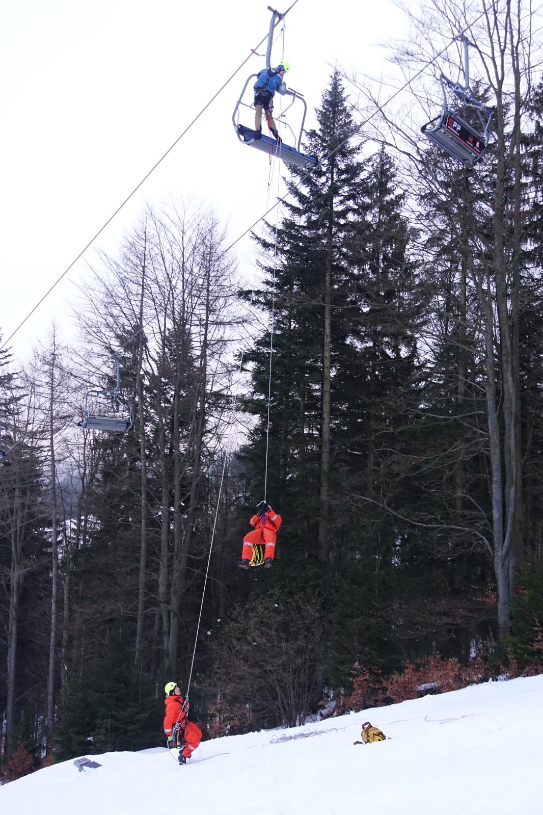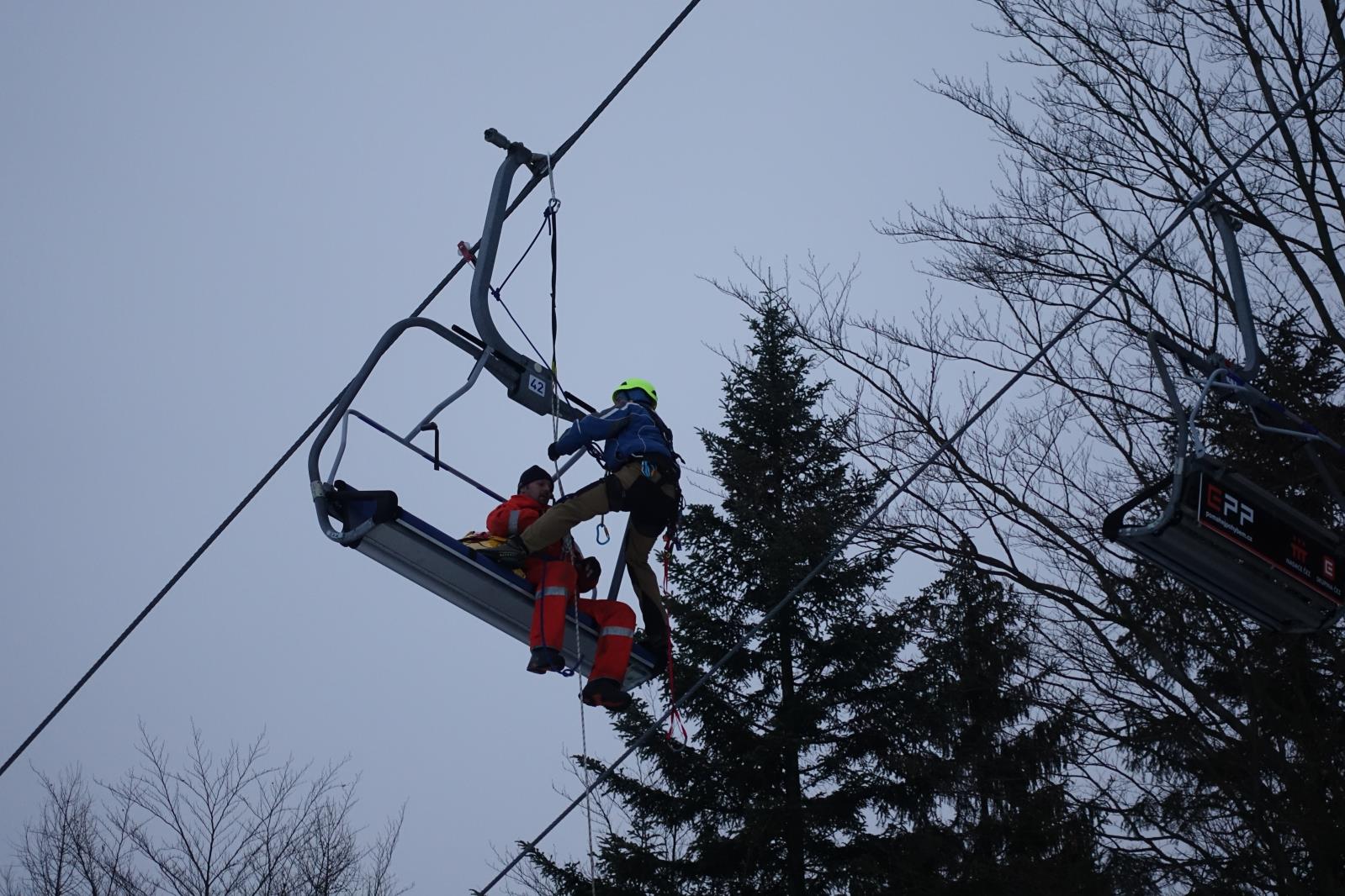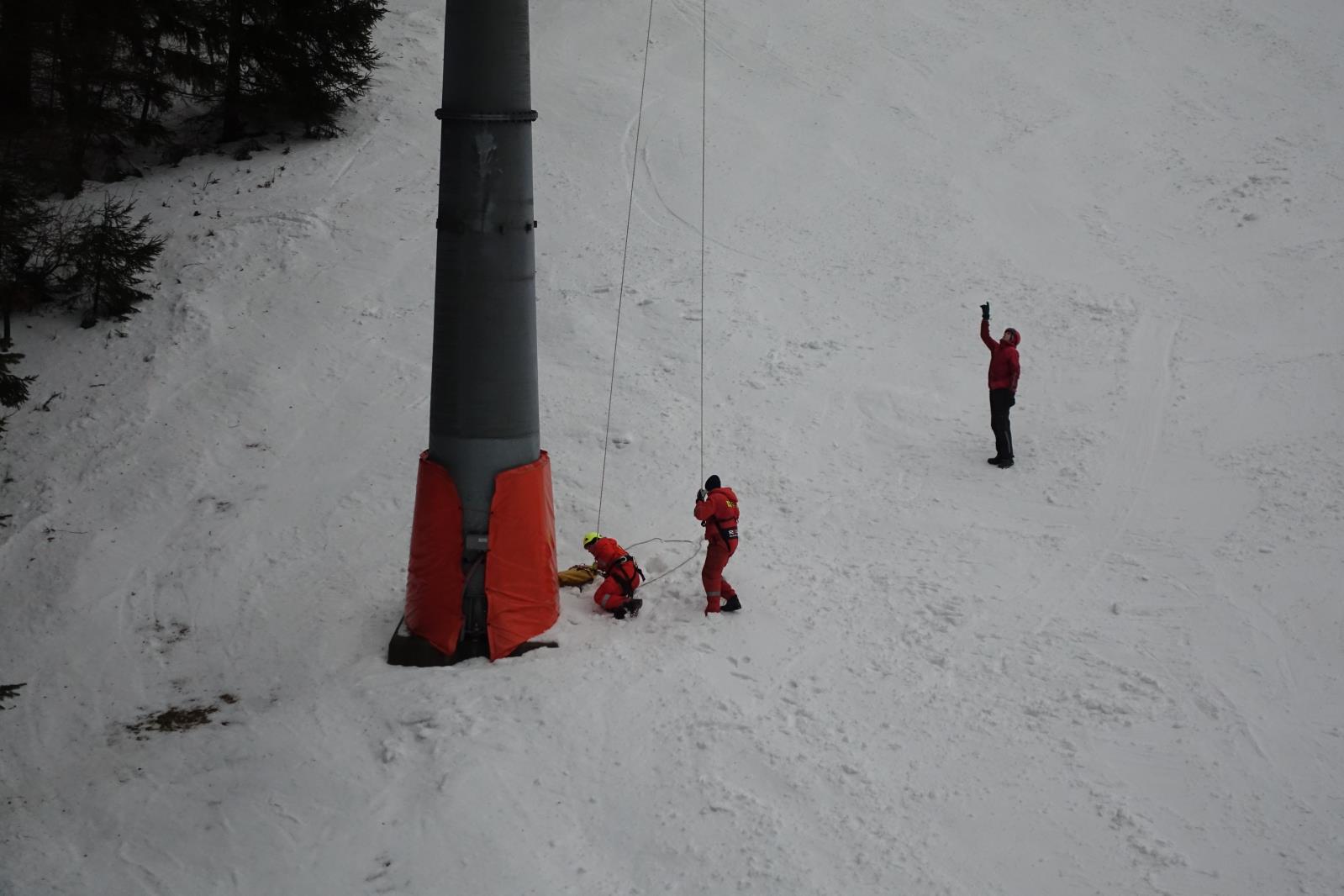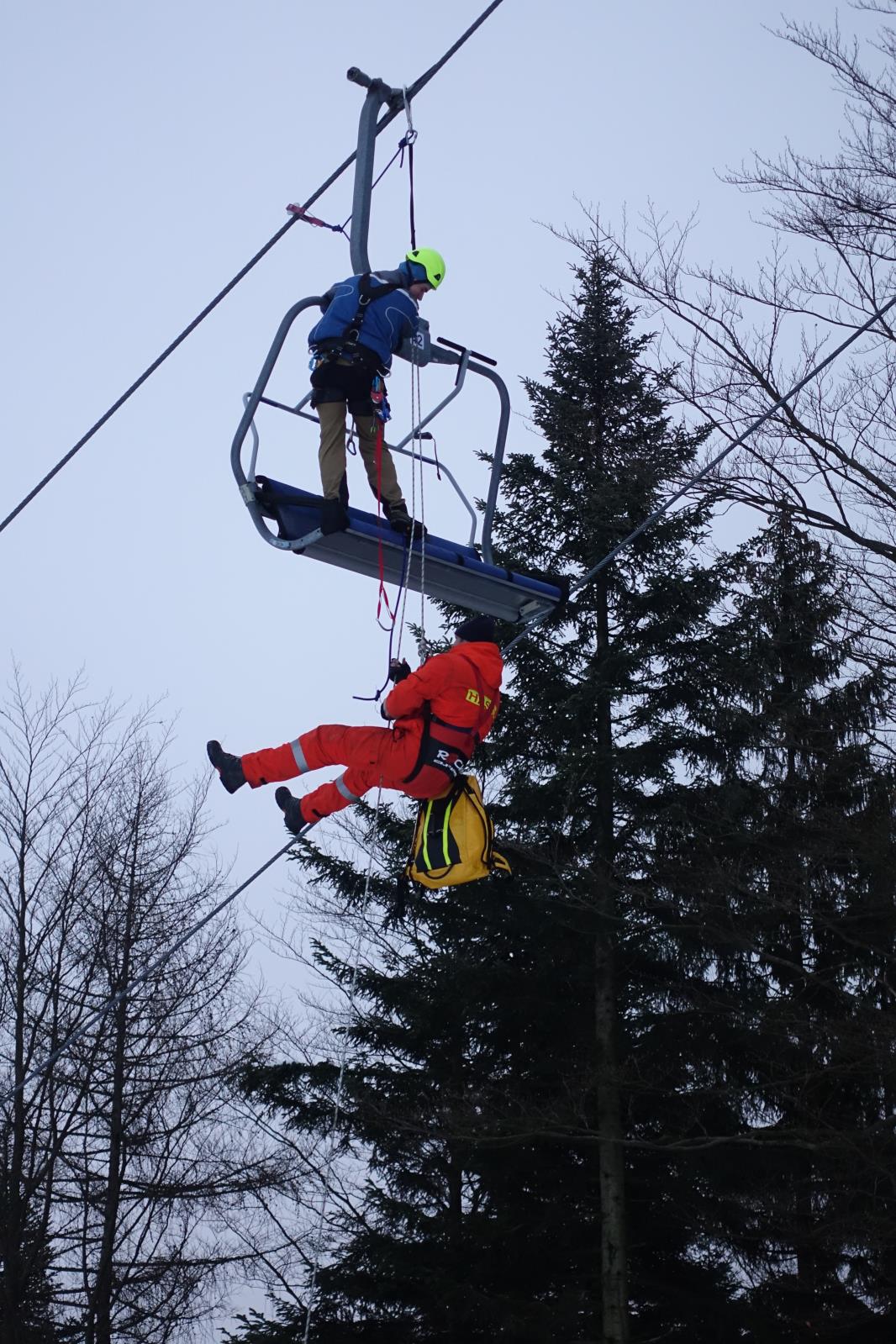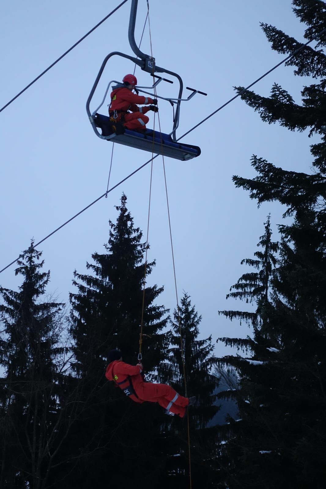 Hasiči si tak měli možnost vyzkoušet použití různých lanových technik při zdolávání prostoru mezi sedačkami a následné spouštění figurantů na zem, kde byla prochladlým osobám poskytnuta první pomoc a tepelný komfort.