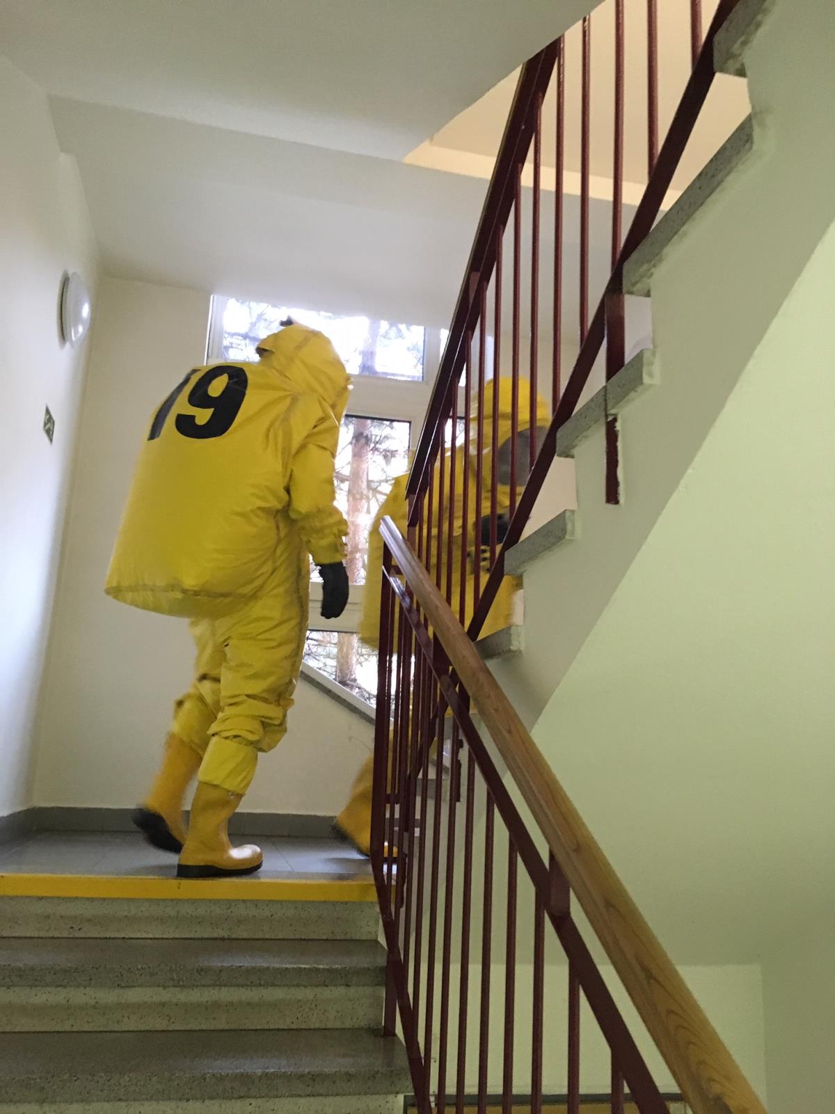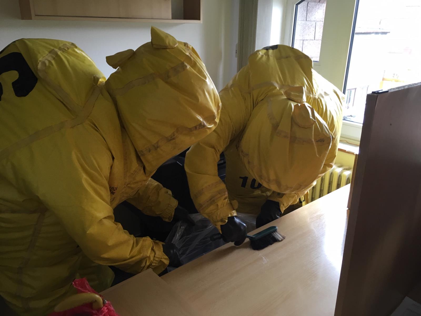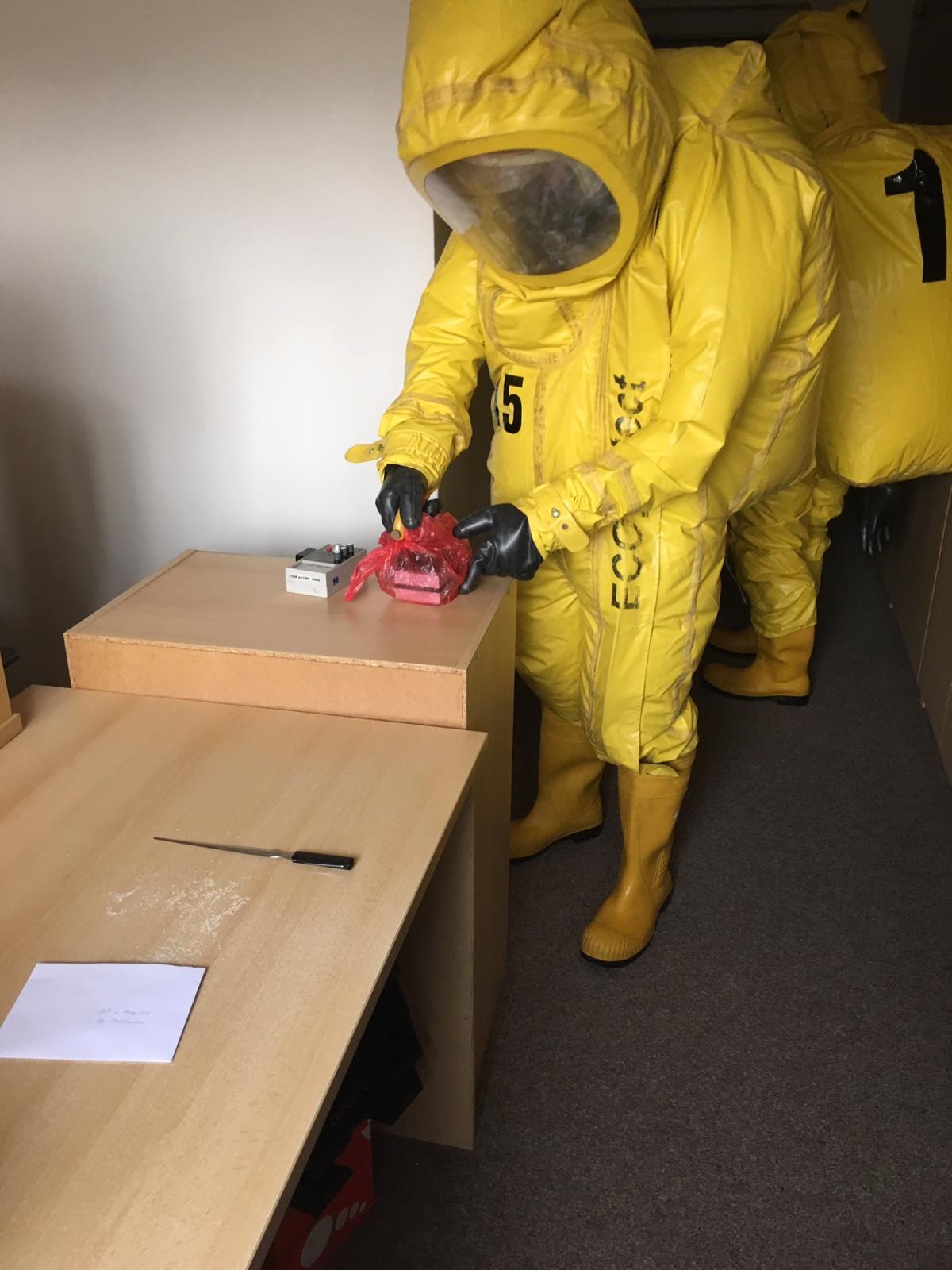 V Hranicích se zase cvičně na úřadě objevila obálka s neznámou látkou. Asistentka vedoucí obálku otevřela a zjistila, že obsahuje plastový pytlík s bílým práškem. Vlivem nešetrné manipulace se prášek rozsypal a potřísnil jí ruce. Přerovští a hraničtí profesionální hasiči vytvořili jednoduchou dekontaminaci, zkontrolovali evakuované osoby, které prostor úřadu opustily ještě před jejich příjezdem a obálku s nebezpečnou látkou zajistili a provedli její likvidaci. (prověřovací cvičení)