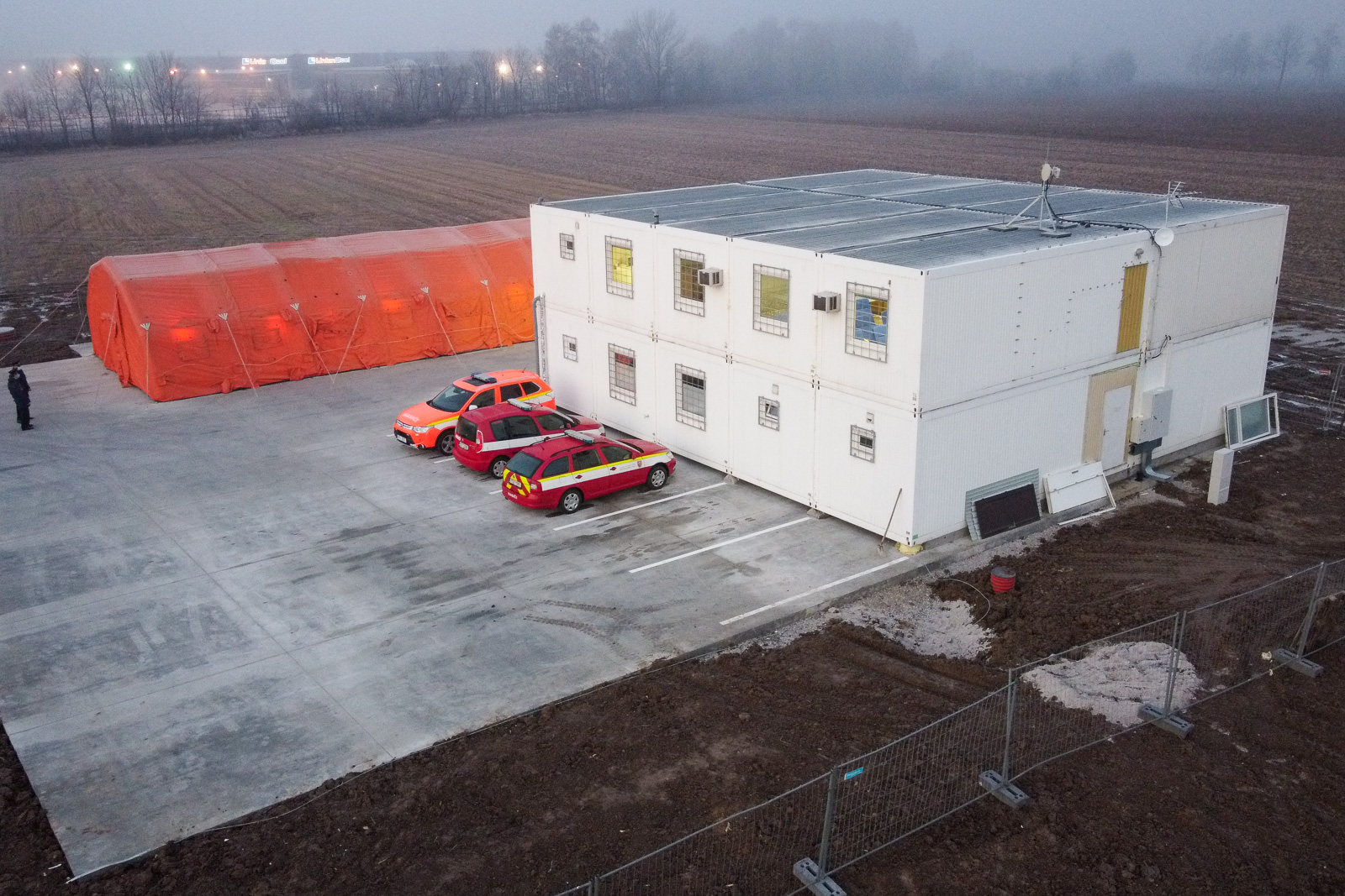 Hasičská stanice v Kopřivnici vyrostla v prozatímních provizorních podmínkách - stojí na zpevněné ploše a sestává z 20 velkých unimobuněk, částečně vlastních a částečně zapůjčených. Jako garáž pro techniku - prvovýjezdovou cisternovou automobilovou stříkačku Tatra Terra a automobilový žebřík se záchrannou výškou 30 metrů Renault Camiva - slouží nafukovací hala.