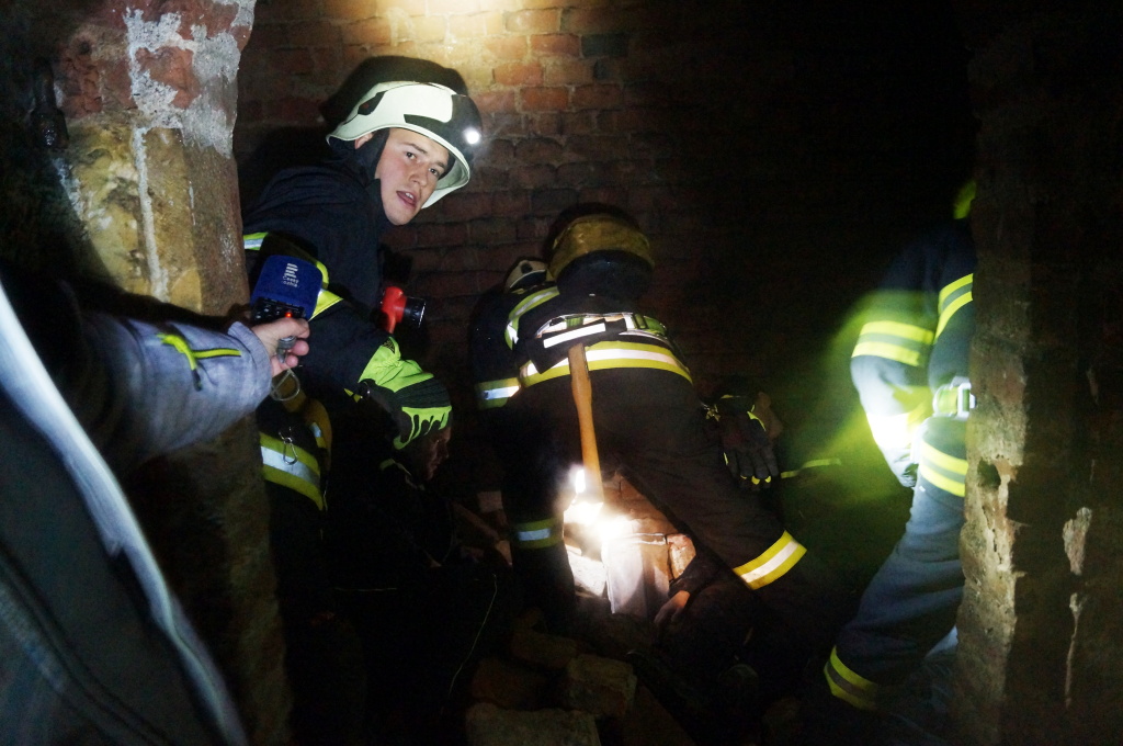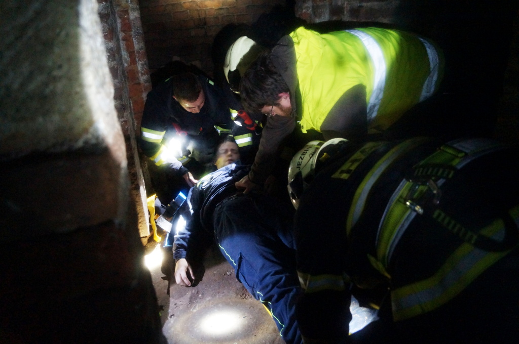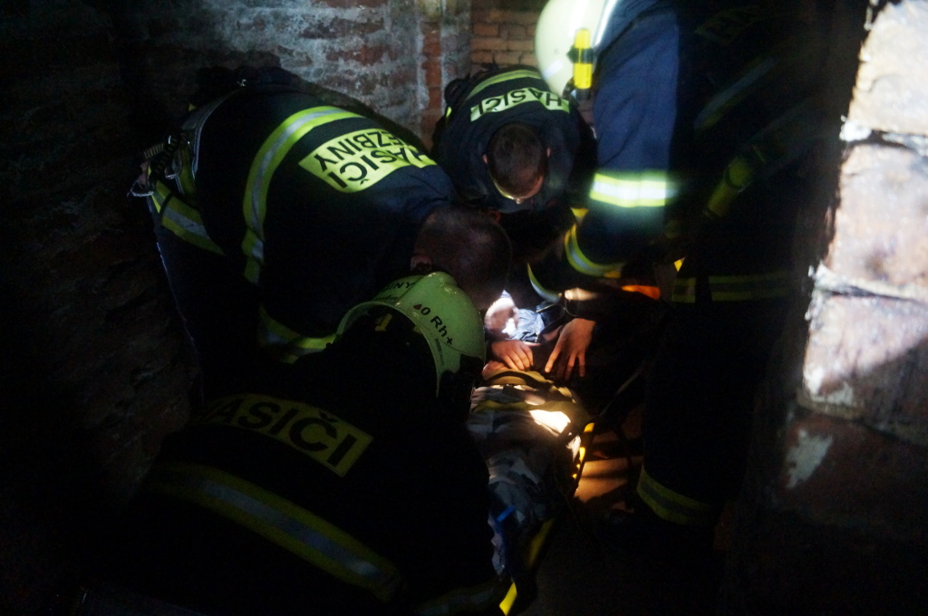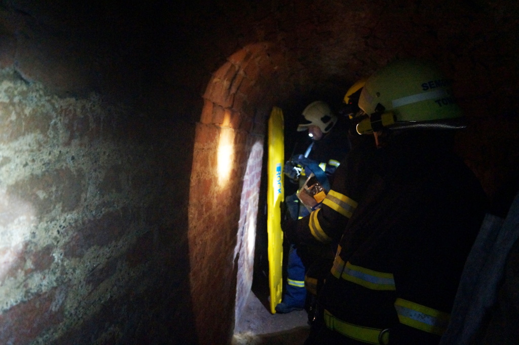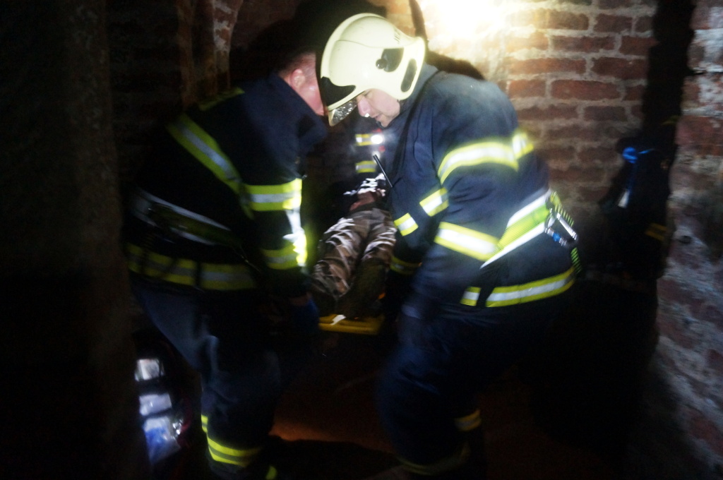 Již po několika metrech v podzemní chodbě ztrácí hasiči signál. Nefungují vysílačky ani mobilní spojení, a o to je samotný zásah těžší. Po pár minutách, kdy hasiče v chodbách doprovází místní průvodce, nalézá první vyslaná záchranná skupina tři pohřešované osoby, jež jsou zraněny. Na místě jim je poskytnuta první předlékařská pomoc a na základě druhů zranění určují hasiči pořadí záchrany osob. Záchrana probíhá postupně, neboť zdravotní stav zraněných ani prostorové podmínky podzemních chodeb neumožňují vysvobození více osob najednou.