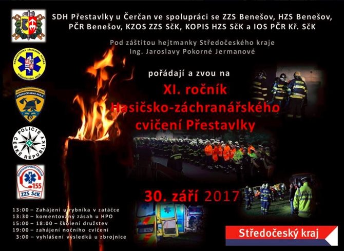 Ve dnech 30. 9. – 1. 10. 2017 proběhla už tradiční společná odborná příprava sborů dobrovolných hasičů, zdravotnické záchranné služby a Policie ČR v Přestavlkách u Čerčan na Benešovsku, nad kterou převzala záštitu hejtmanka Středočeského kraje Jaroslava Pokorná Jermanová.