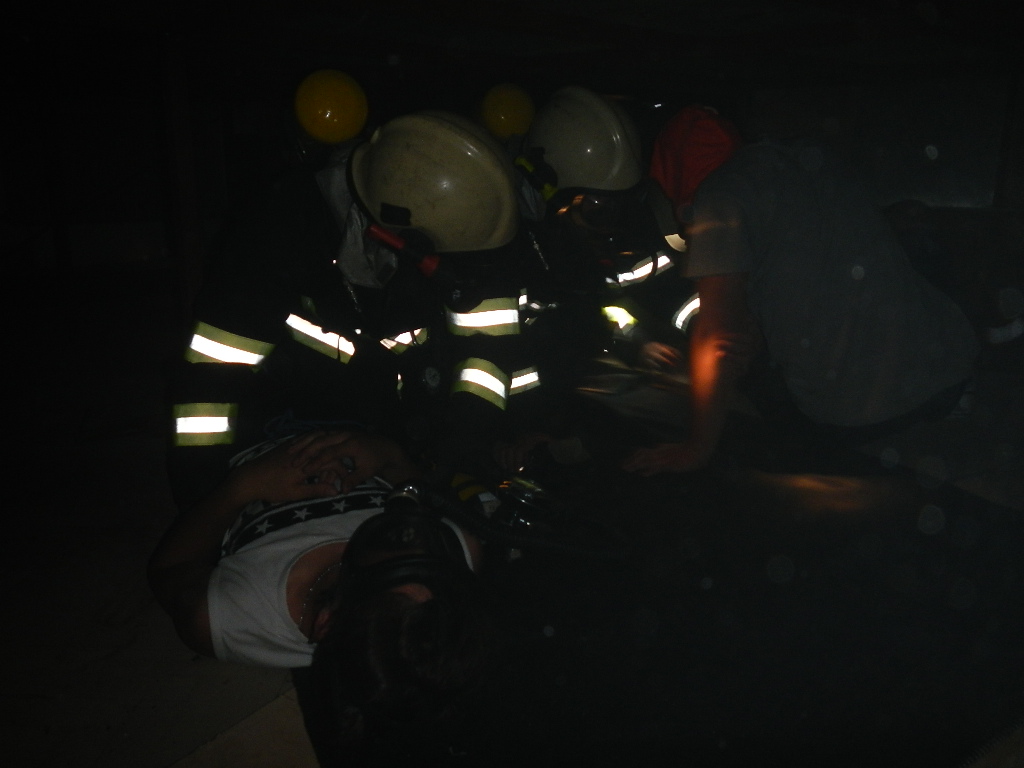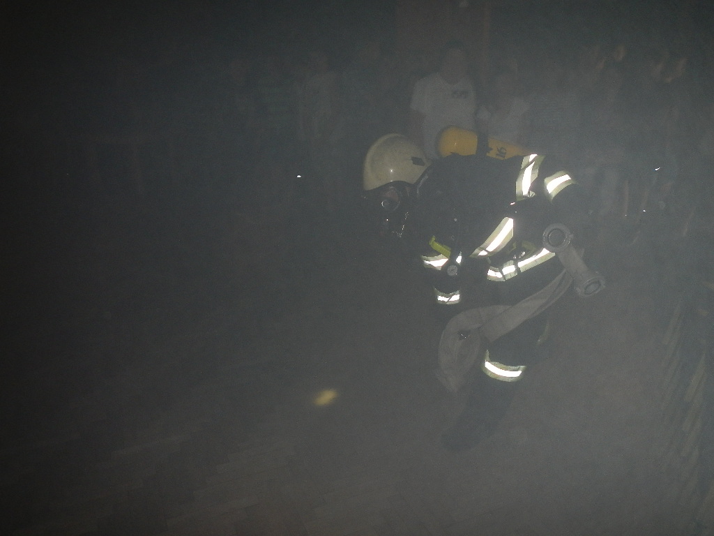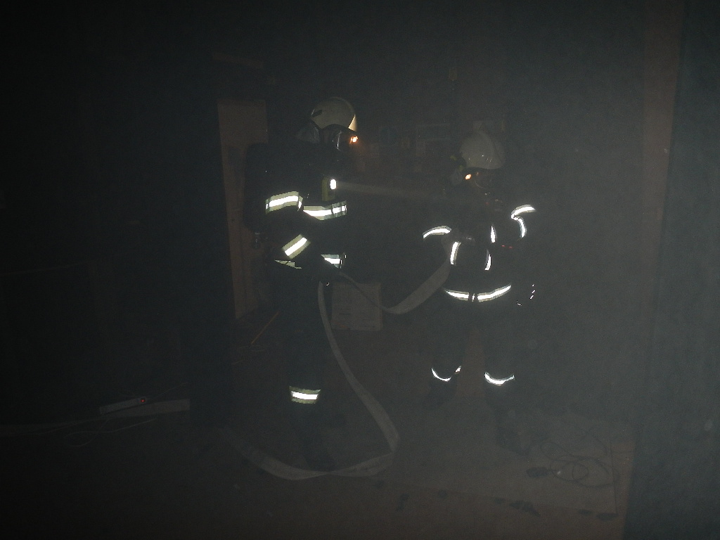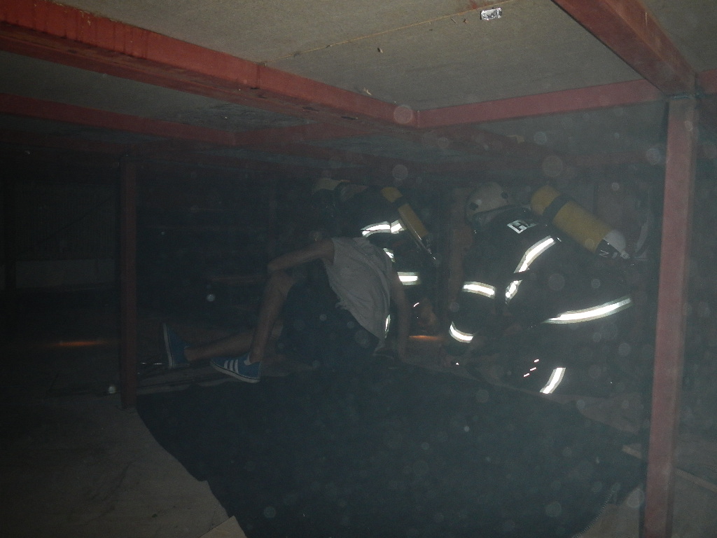 Úkolem kaplických profesionálních hasičů byla především záchrana osob. Někteří účastníci diskotéky, kteří se stihli samoevakuovat, postrádají své kamarády. Pravděpodobně zůstali v hořícím domě. Hasiči zjistili, že jde o pět osob. Velitel zásahu dovnitř vysílá průzkumnou skupinu, která musí celý kulturní dům pečlivě prohledat, všechny najít a bezpečně je evakuovat. Hasiči jsou plně vybaveni dýchací technikou, do zakouřeného domu vstupují stejně tak jako u reálného požáru s proudem C (tentokráte však nezavodněným), pro evakuaci osob mají připravené vyváděcí masky.