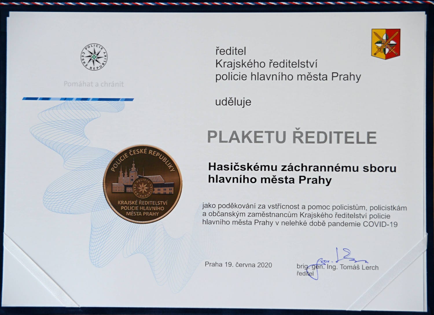 V pátek 19.6.2020 proběhla návštěva krajského ředitele HZS hl. m. Prahy plk. Ing. Luďka Prudila na Krajském ředitelství policie hl. m. Prahy, kde z rukou ředitele brig. gen. Ing. Tomáš Lercha převzal plaketu s poděkováním pražským hasičům za vstřícnost a pomoc policistům, policistkám a občanským zaměstnancům Krajského ředitelství policie hl. m. Prahy v době pandemie COVID-19.