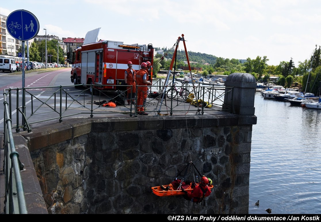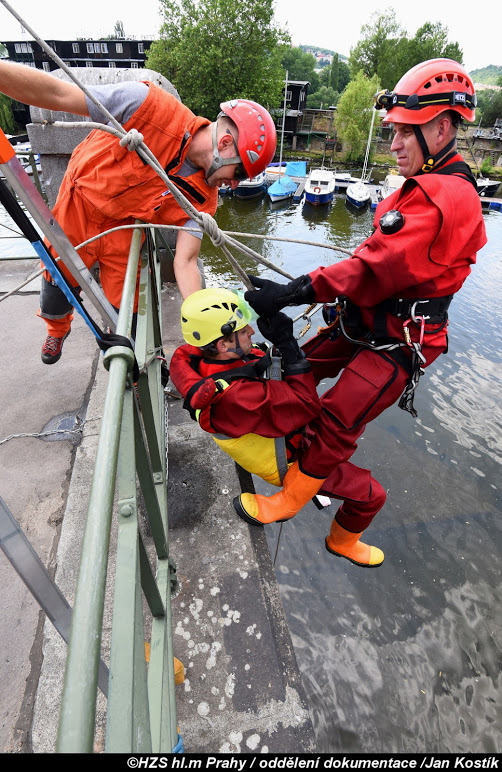 Výcvik lezecké skupiny pražských hasičů z krčské stanice byl zaměřen na zajištění a záchranu osoby nacházející se na vodní hladině. Pod vedením velitele čety směny A Pavla Mošničky si hasiči vyzkoušeli běžné postupy, které používají během podobných záchranných prací. Výcvik probíhal na Podolském nábřeží dne 21.06.2017.