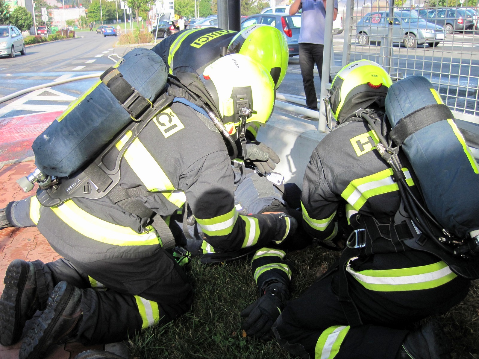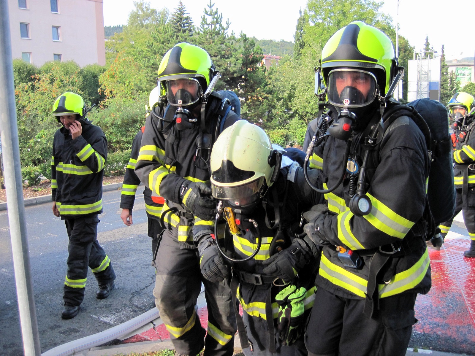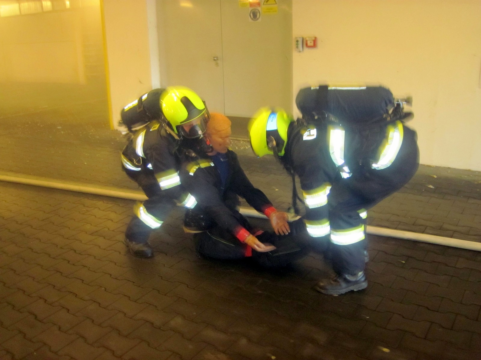 Jednotka profesionálních hasičů byla na místě do tří minut. Po provedení prvotního průzkumu byl v zakouřeném prostředí podzemních garáží proveden požární zásah a vyhledání a záchrana pohřešovaných osob. Jednu osobu, která byla nalezena a vynesena ze zakouřeného prostředí, imitovala tréninková figurína. Nečekaným překvapením byl pro jednotku také simulovaný kolaps jednoho ze zasahujících hasičů.