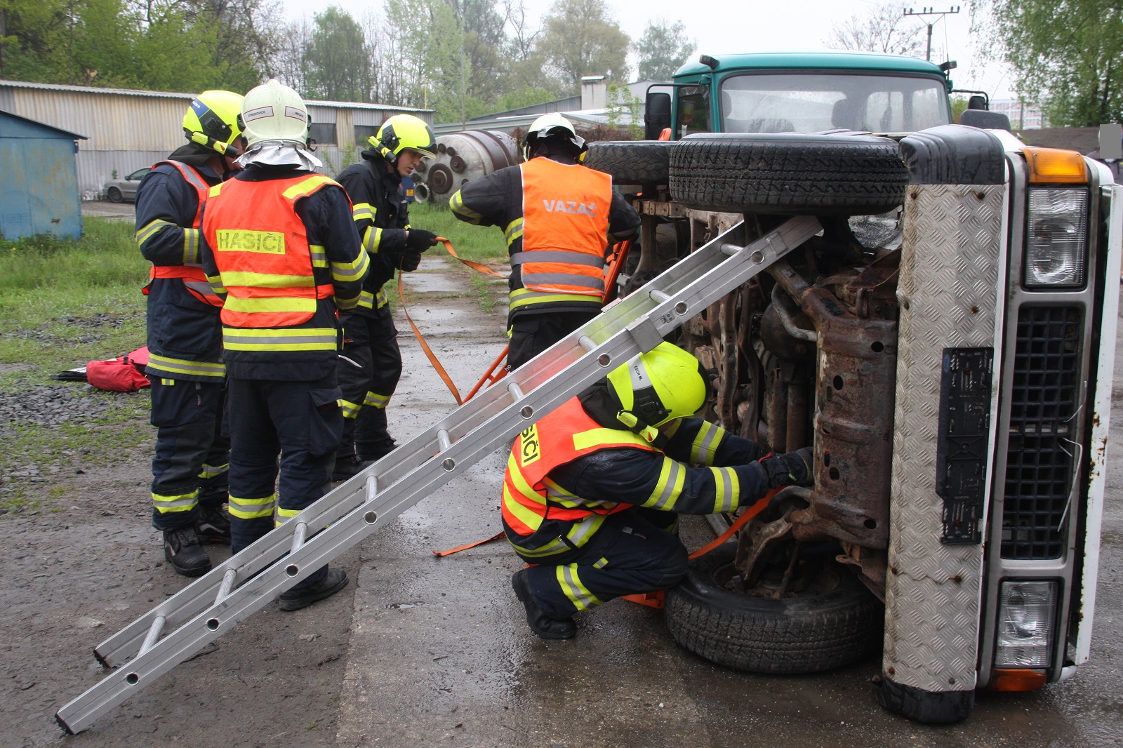 Při příjezdu hasičů stálo na místě fingované nehody jedno terénní vozidlo a jedno nákladní vozidlo. Terénní vozidlo bylo na boku a uvnitř byl zraněný řidič. Hasiči po příjezdu zajistili vozidlo proti převrácení a provedli protipožární opatření. Jeden hasič vnikl do terénního vozu a zajišťoval životní funkce zraněné osoby. Ostatní prováděli rozebírání částí vozidla s pomocí ručních nástrojů a s pomocí hydraulického vyprošťovacího zařízení.