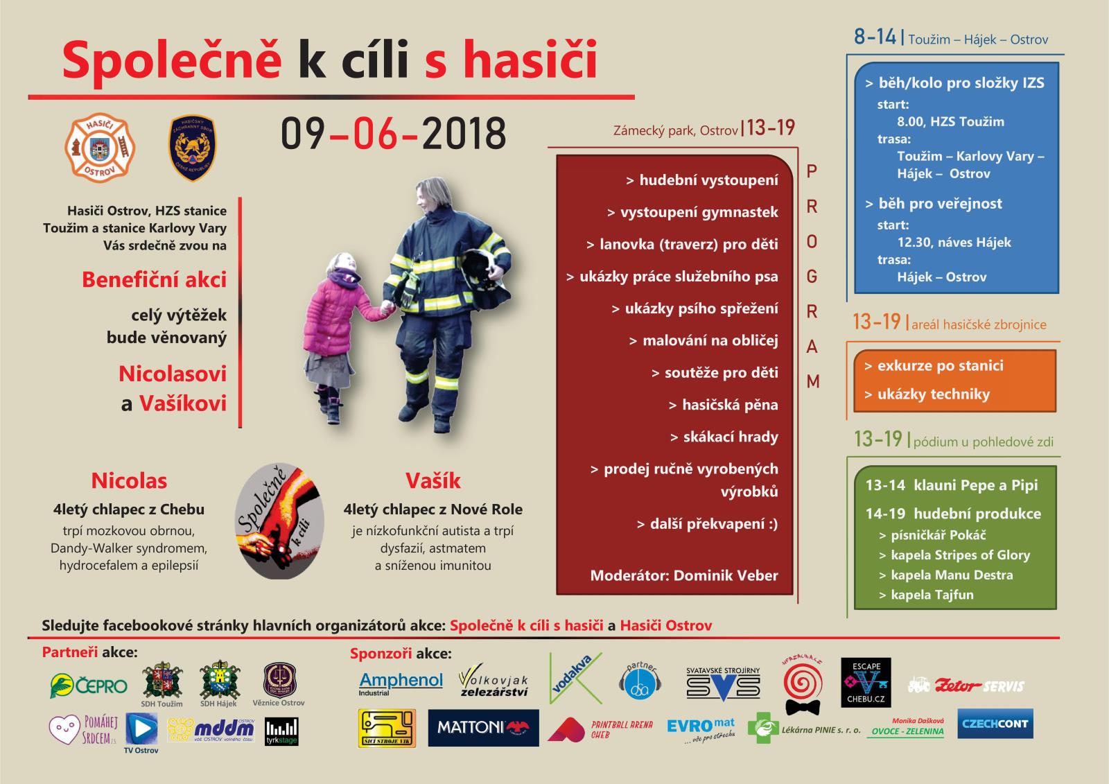 1. ročník akce Společně k cíli s hasiči se uskuteční 9. června 2018. Jedná se o benefiční štafetový běh či jízdu na kole v celkové délce 48,5 km a to ze stanice HZS Toužim, přes stanici HZS Karlovy Vary až na hasičskou zbrojnici v Ostrově. Na hasičské zbrojnici v Ostrově bude v den akce probíhat den otevřených dveří, prodej ručně vyrobených výrobků a doprovodný program pro děti i dospělé (malování na obličej, hudební vystoupení, ukázky techniky, hasičská pěna). Návštěvníci budou moci během dne také libovolně přispět do připravených pokladniček.