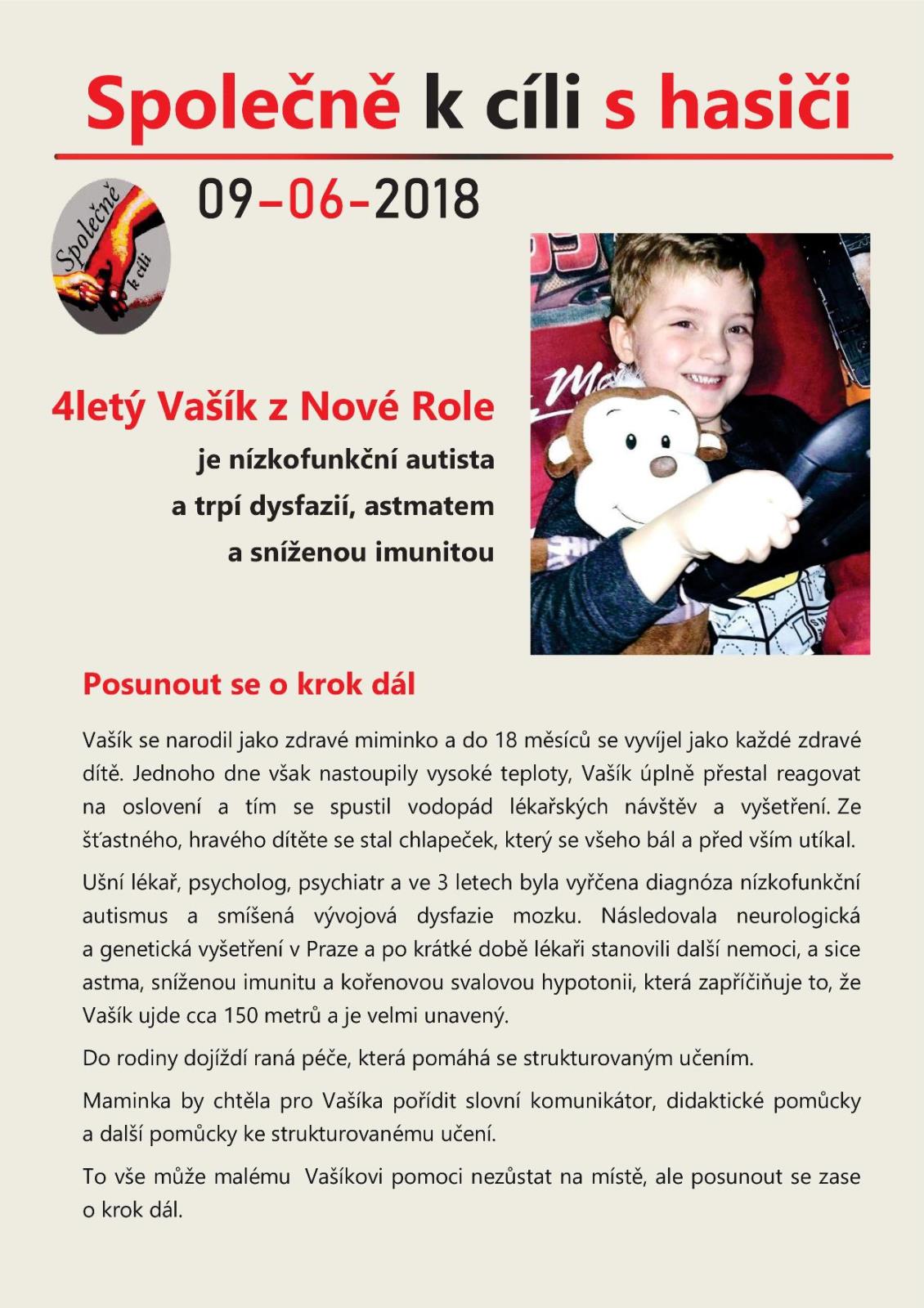 "Dětiček i dospělých, kteří potřebují naši pomoc, je stále mnoho a my chceme pomáhat dál, nejen jako hasiči při požárech nebo dopravních nehodách, ale hlavně jako lidé. Cílem letošní akce je pomoci a malinko ulehčit život alespoň 2 dětem. V tuto dobu již máme vybrané dva malé čtyřleté chlapce Nicolase z Chebu a Vašíka Z Nové Role," uvádí k akci pořadatelé, dobrovolní hasiči z Ostrova na Karlovarsku.