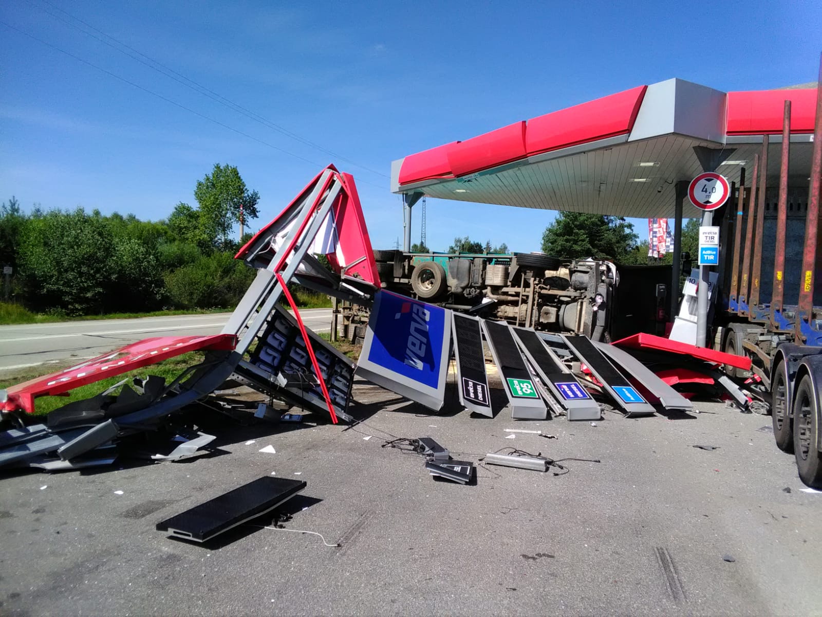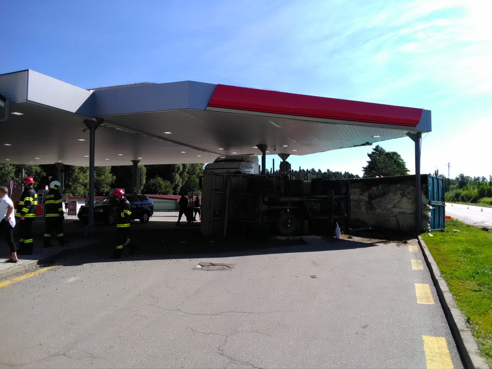 Při nehodě došlo k přeražení čerpacích stojanů, obsluha vypnula okamžitě motory k přívodu, byl odpojen přívod elektrického proudu. Jeden z vozů převážel skelnou vatu, druhý sypaný beton. V kabině jednoho z aut zůstal zaklíněný řidič. Zasahující profesionální hasiči ze stanice Jindřichův Hradec ho museli ven vyprošťovat. Po několika minutách byl předán zdravotníkům. Do nemocnice ho transportovala letecká záchranná služba. Hasiči dále zajistili obě auta protipožárním opatřením odpojením akumulátorů, byly zajištěny nádrže proti úniku provozních kapalin. Po dobu šetření nehody Policií ČR hasiči odčerpávali z nádrží naftu.