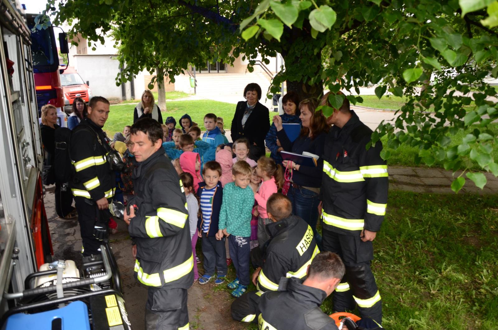 Hasiči „cvičný“ požár ve školce uhasili a dětem poté ukázali nejen svou výstroj, ale i zásahová vozidla.
