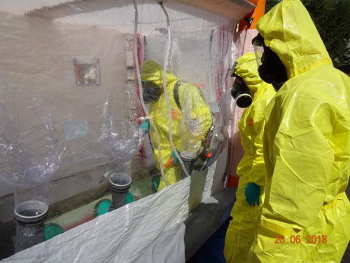 Před konečným oplachem vodou byla kontaminovaná místa neutralizovaná a byly z nich provedeny kontrolní stěry pro vyhodnocení účinnosti dekontaminace.
