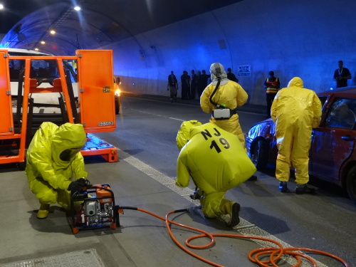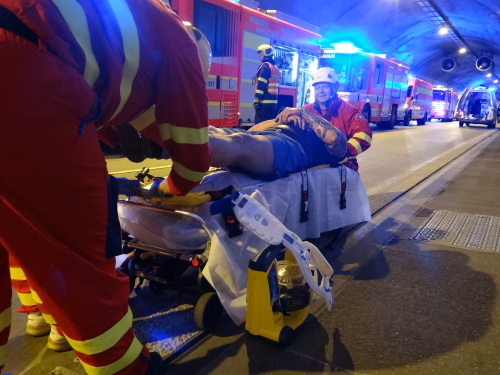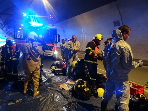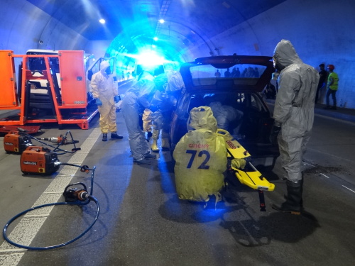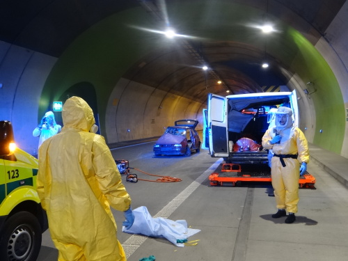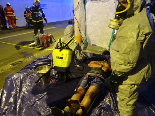 Hasiči si do tunelu přivezli speciální chemické vybavení, na začátku zásahu se několik z nich obléklo do klasických, nebo lehčích ochranných protichemických obleků jako ochrana proti nákazám. Z osobního auta v nich vyprostili zraněného řidiče, kterého po dekontaminaci před a uvnitř dekontaminační sprchy předali týmu ZZS MSK. Pacient, ležící v bioboxu v sanitce, nehodu nepřežil.
