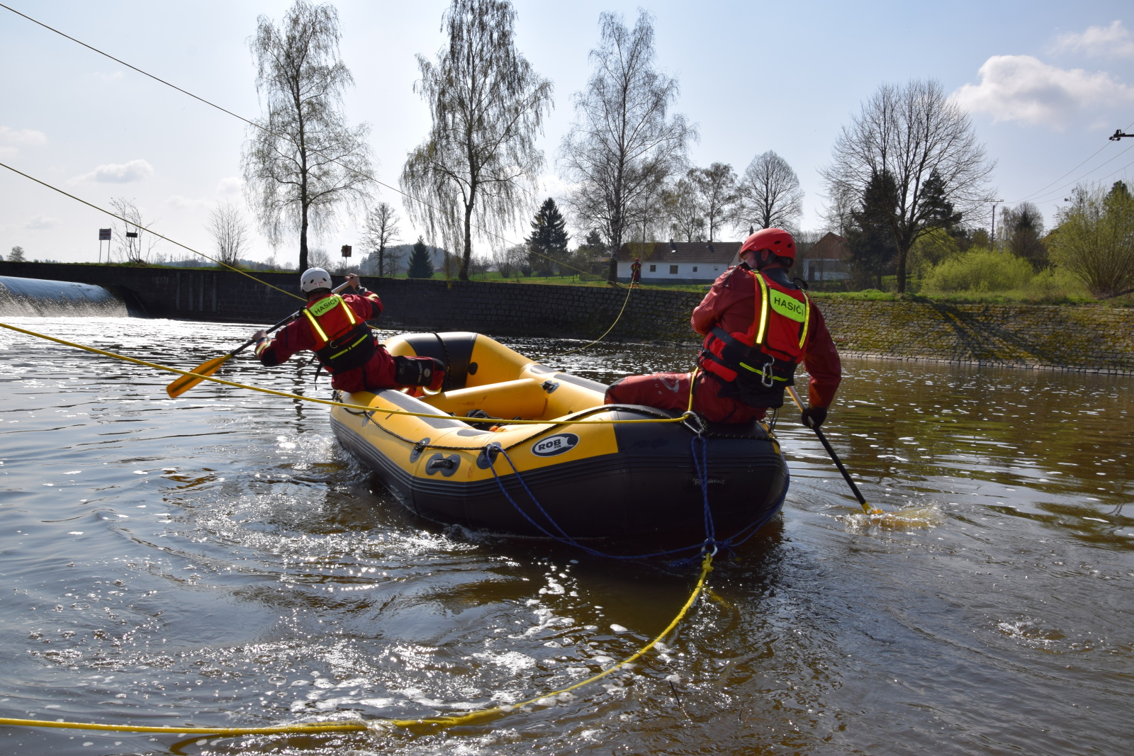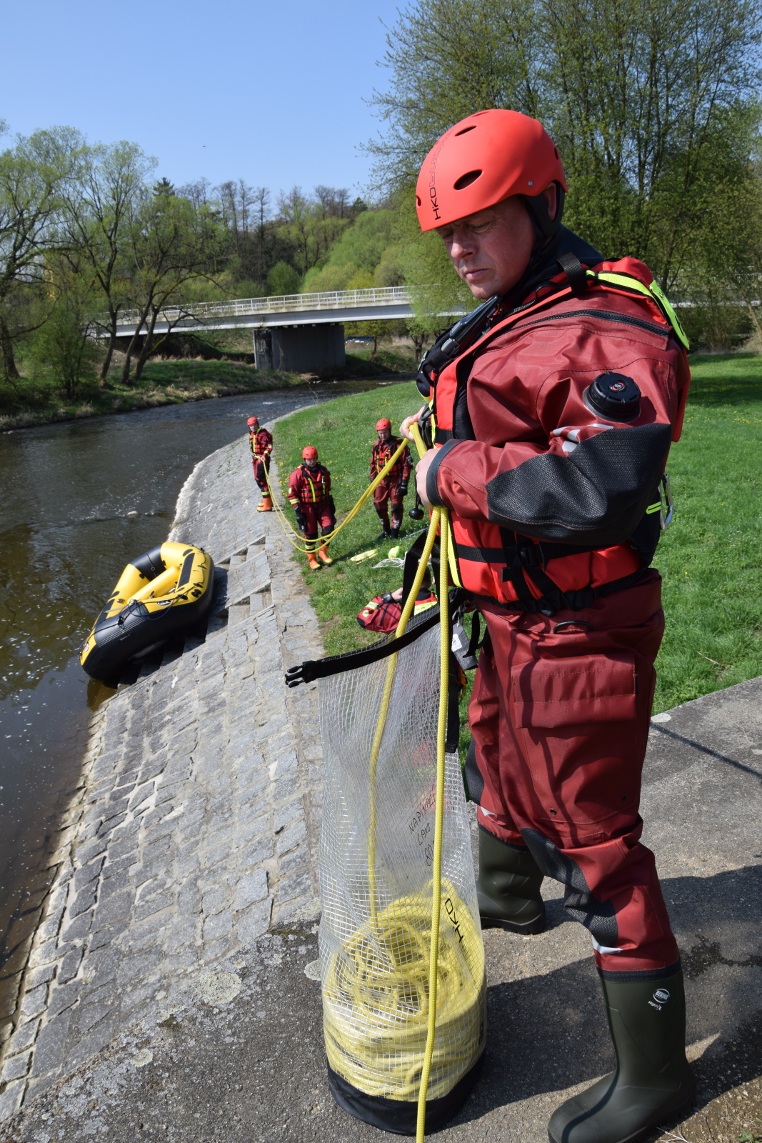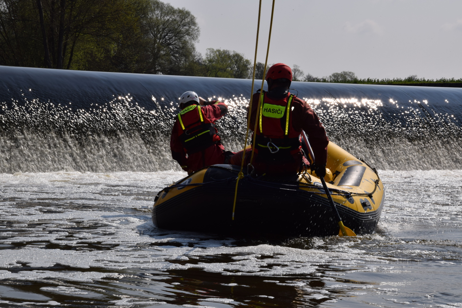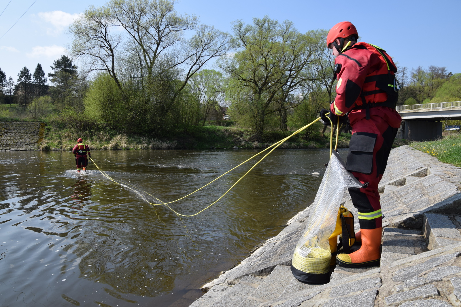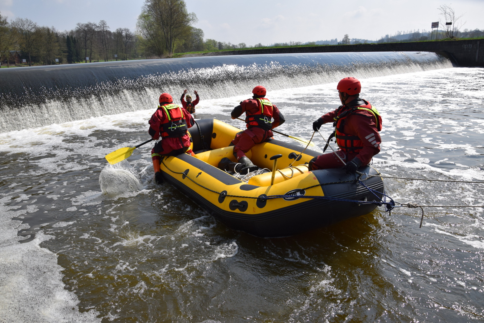 Prakticky si pak vyzkoušeli záchranu pomocí házecího vaku, postup při upoutaném zachránci a záchranu za použití raftu a lanovky. Instruktoři kurzu hasiče také seznámili s organizací záchrany a použitím věcných prostředků a požární techniky.