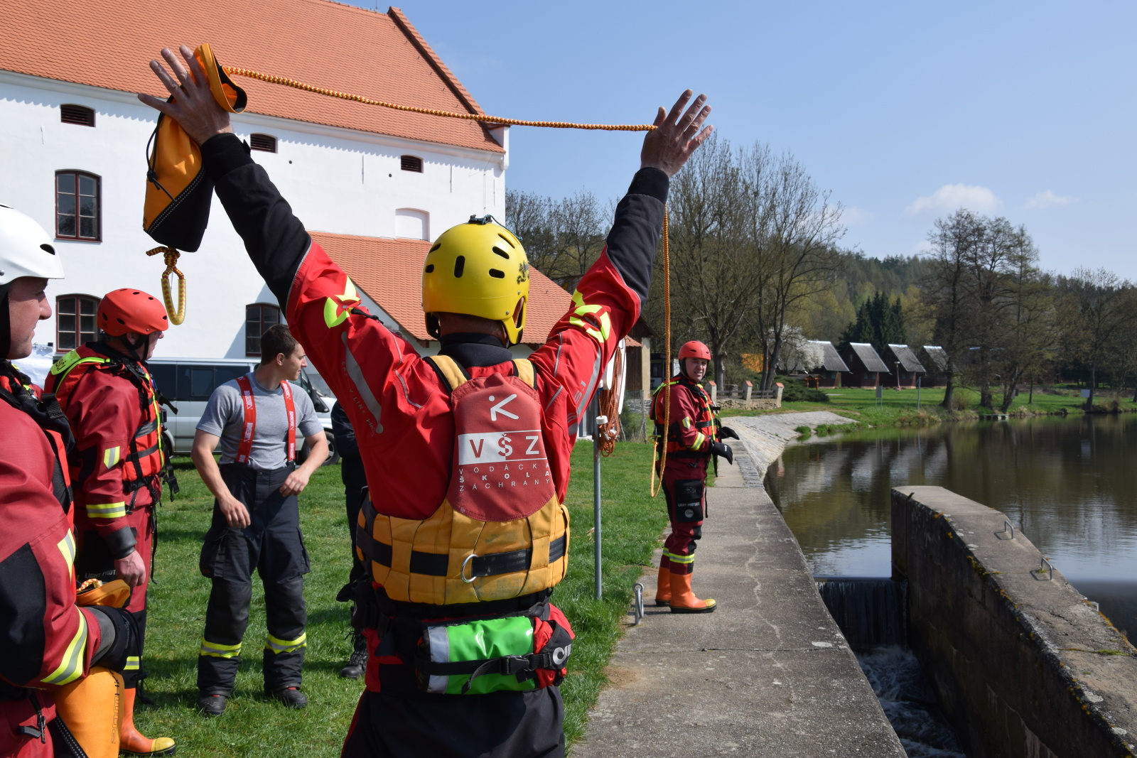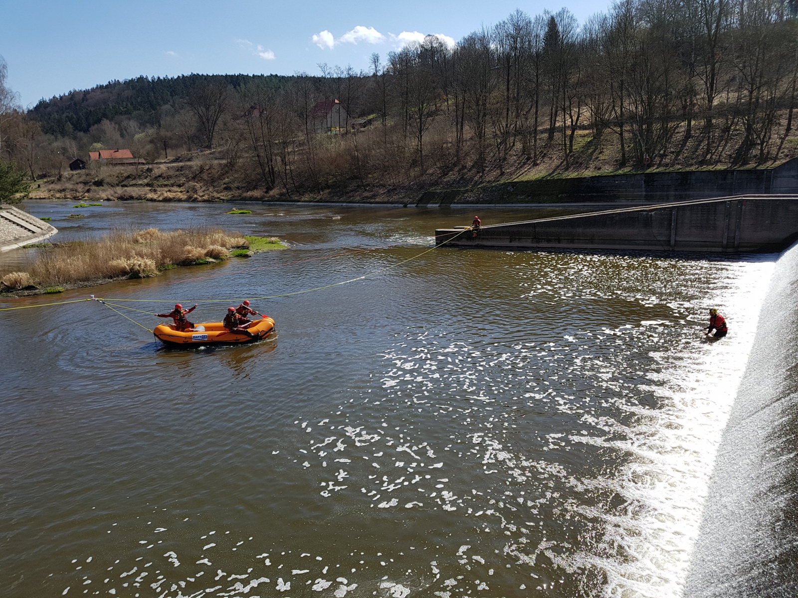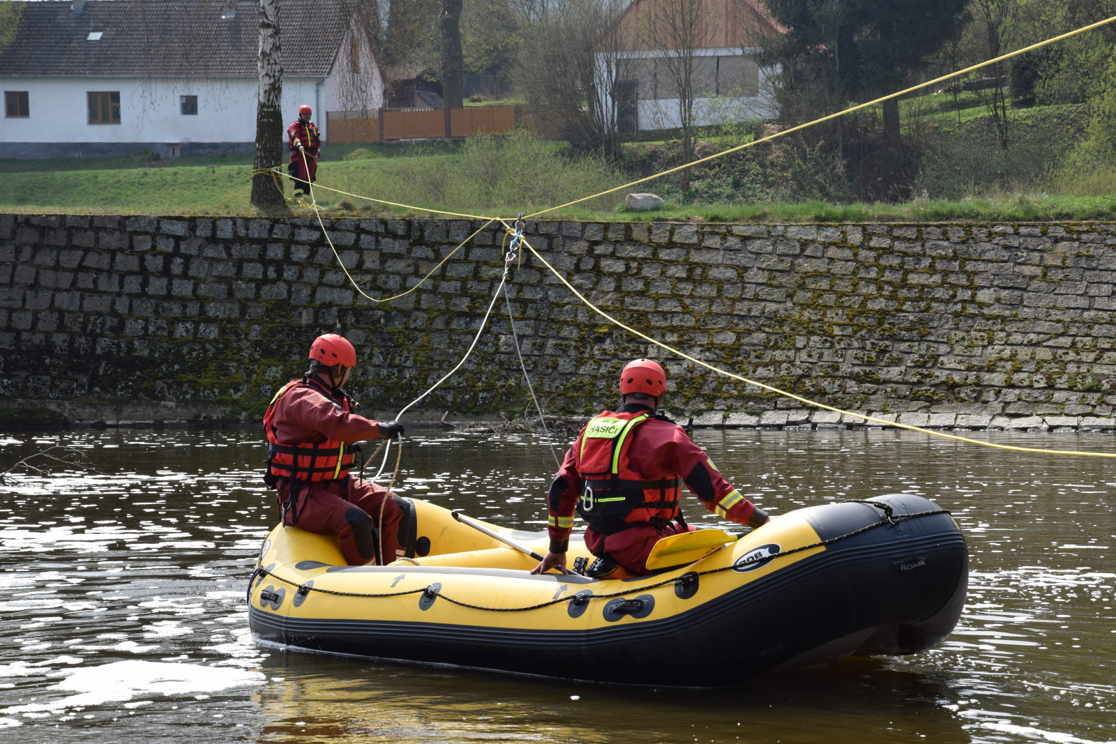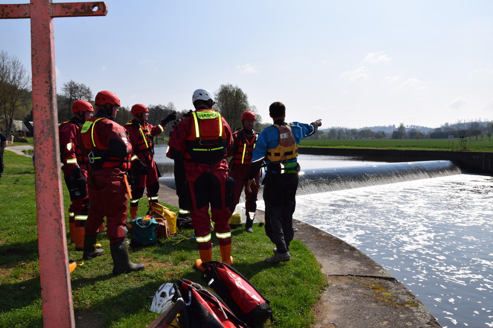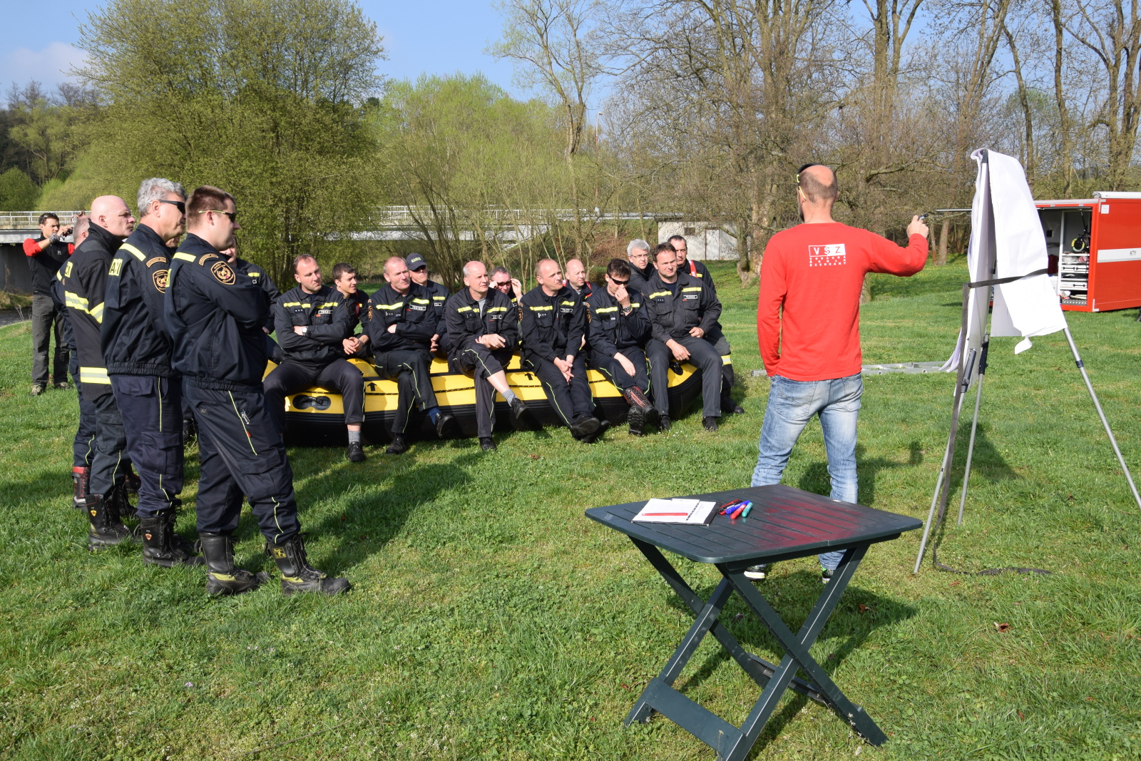 Prakticky si pak vyzkoušeli záchranu pomocí házecího vaku, postup při upoutaném zachránci a záchranu za použití raftu a lanovky. Instruktoři kurzu hasiče také seznámili s organizací záchrany a použitím věcných prostředků a požární techniky.
