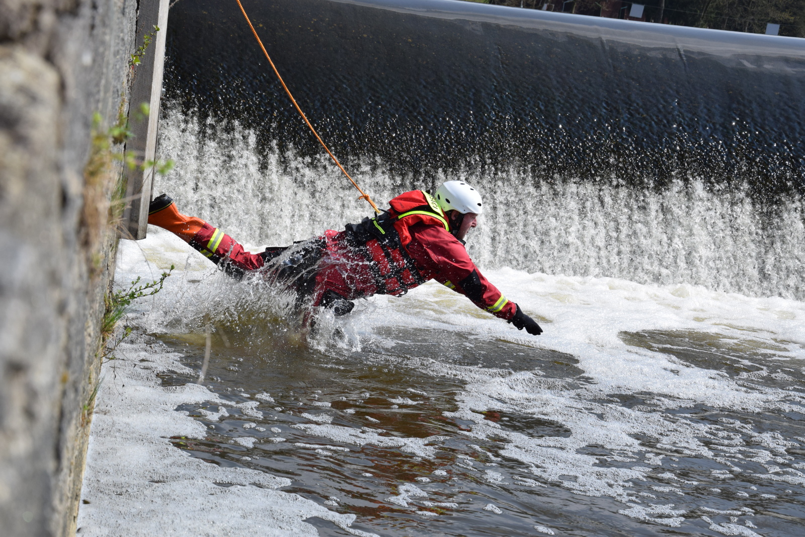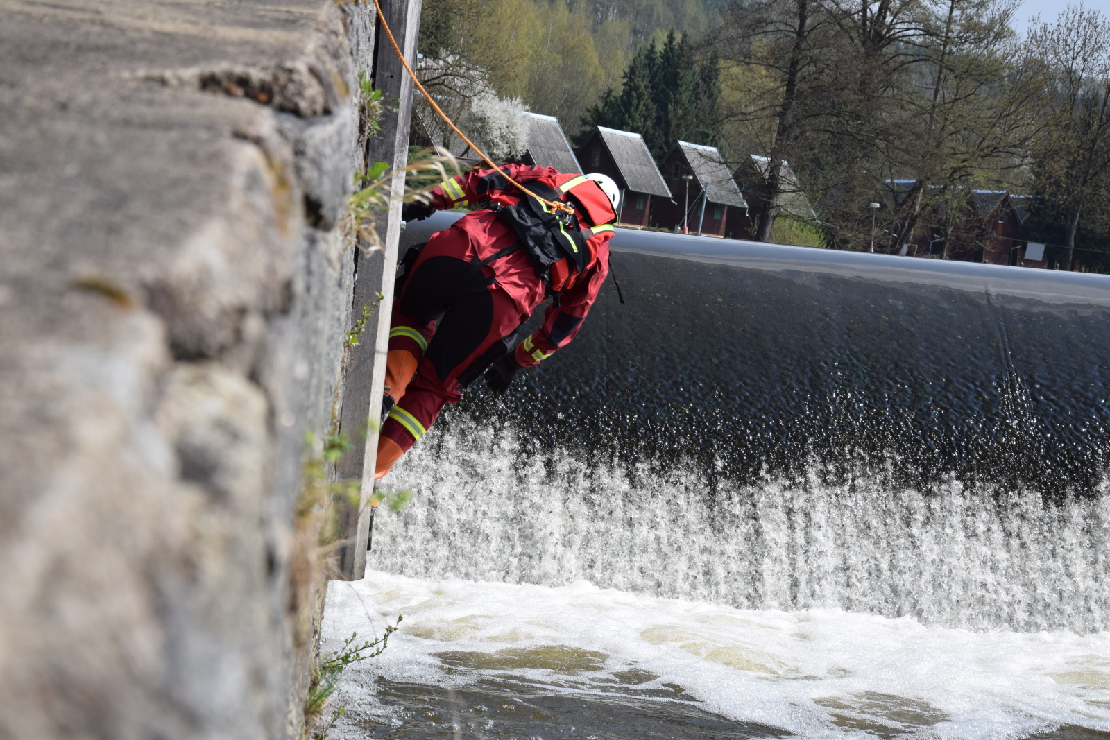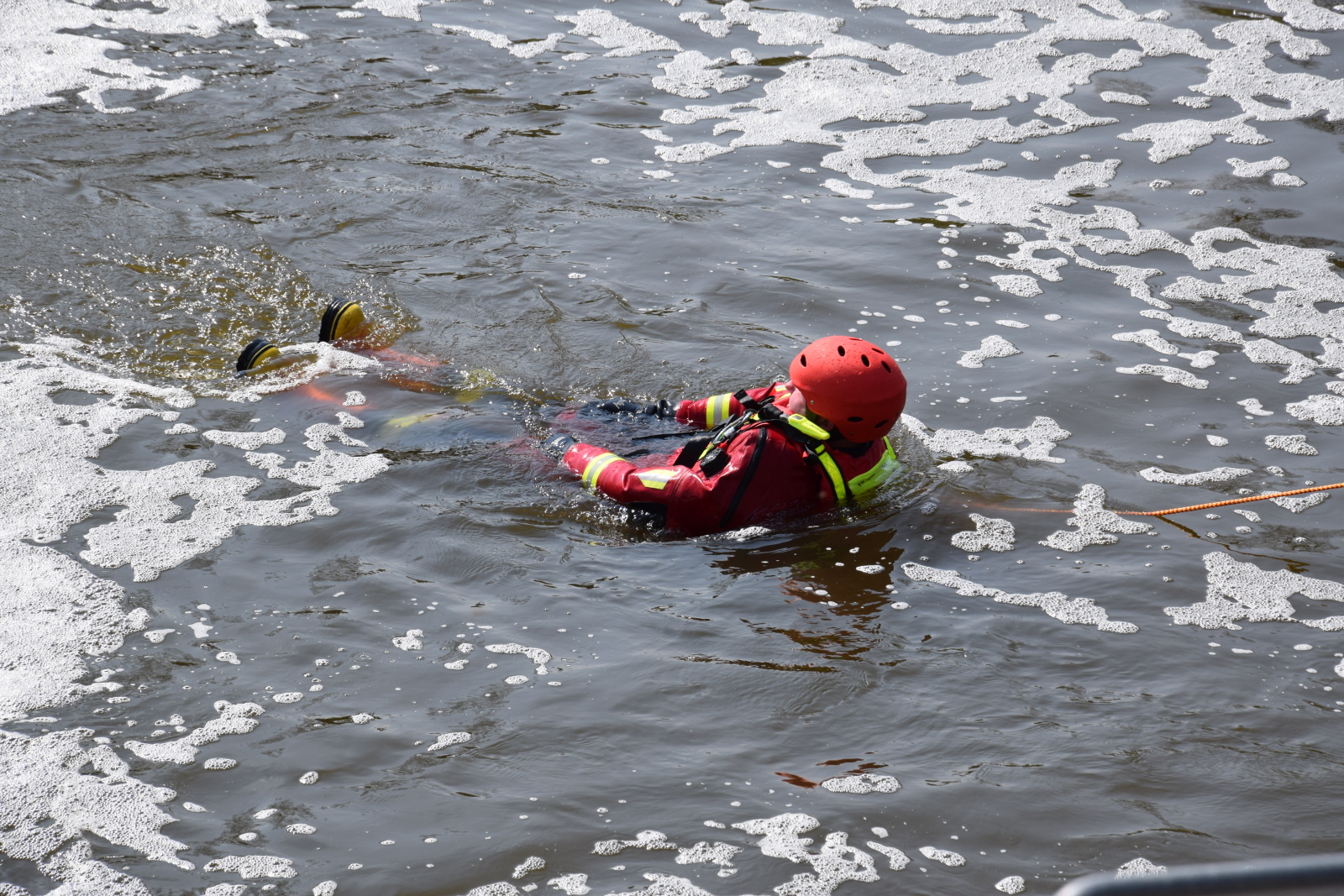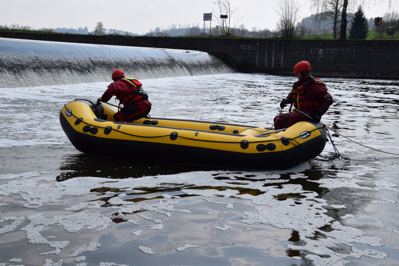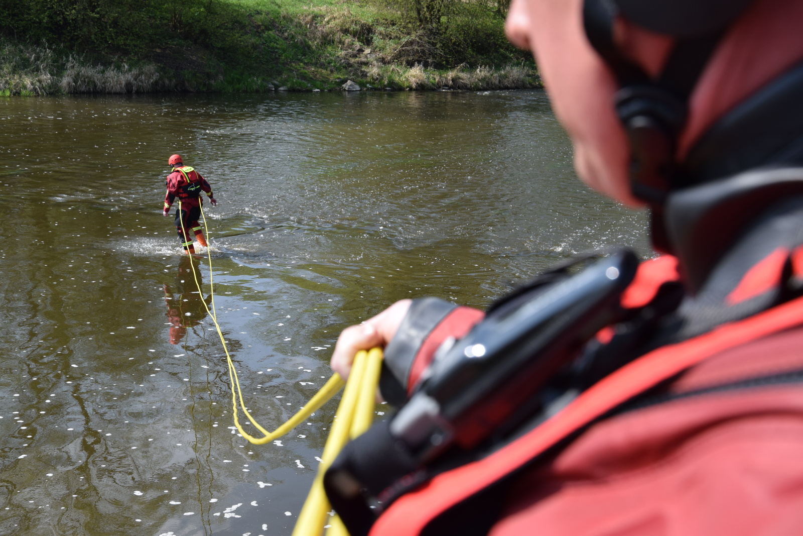 Prakticky si pak vyzkoušeli záchranu pomocí házecího vaku, postup při upoutaném zachránci a záchranu za použití raftu a lanovky. Instruktoři kurzu hasiče také seznámili s organizací záchrany a použitím věcných prostředků a požární techniky.