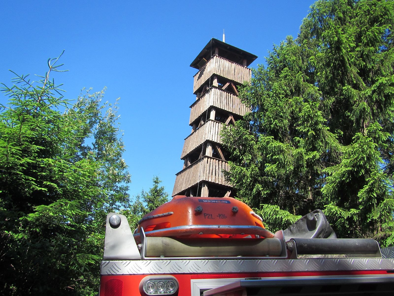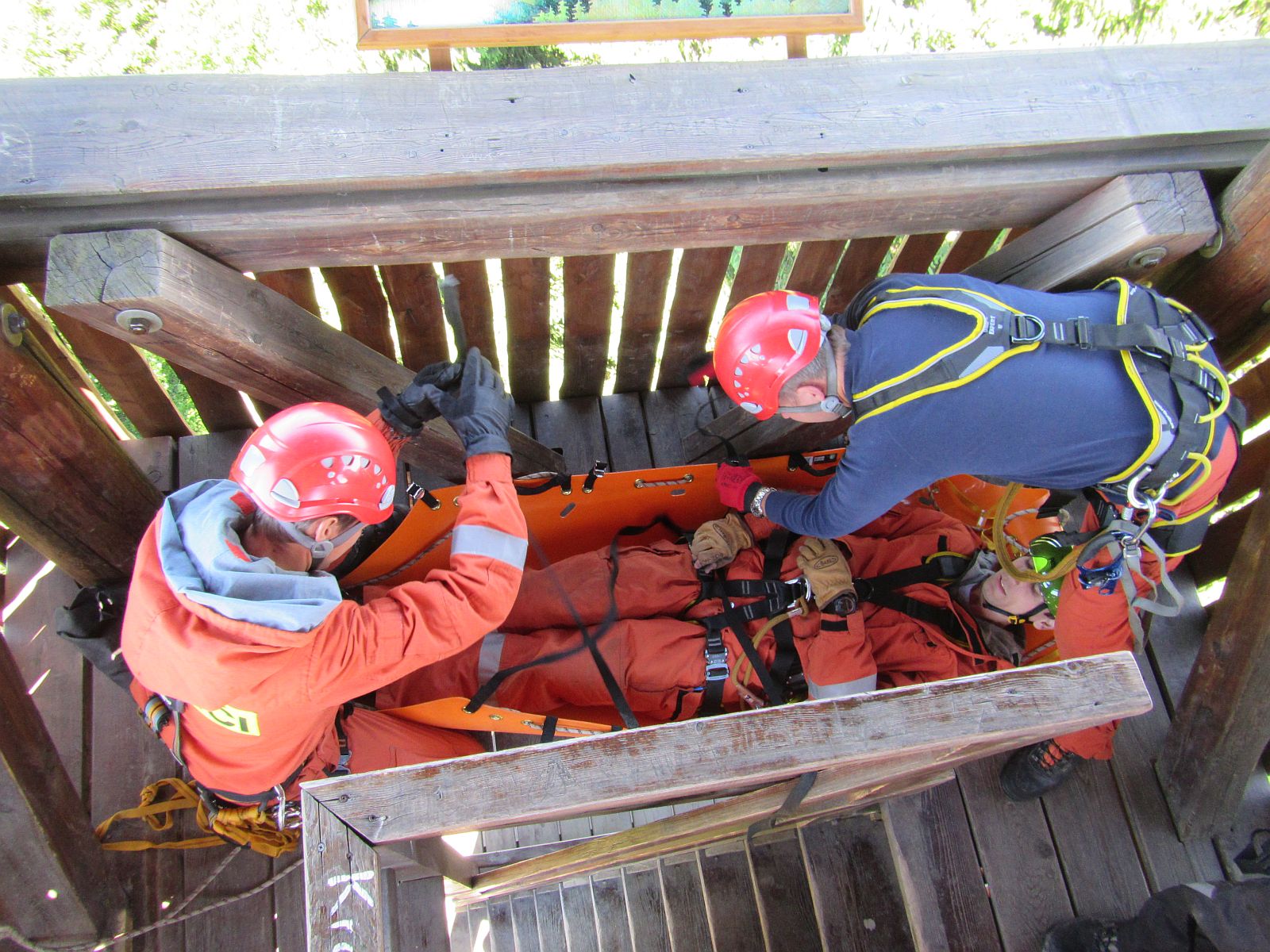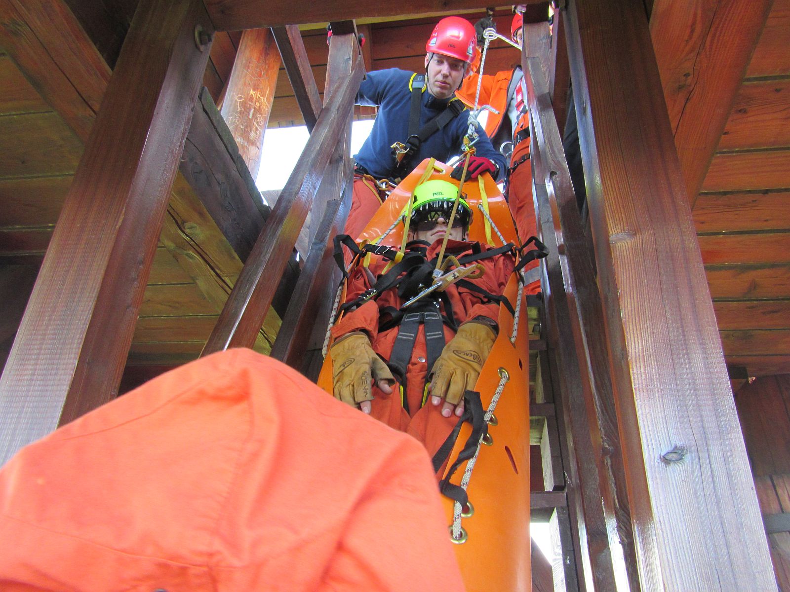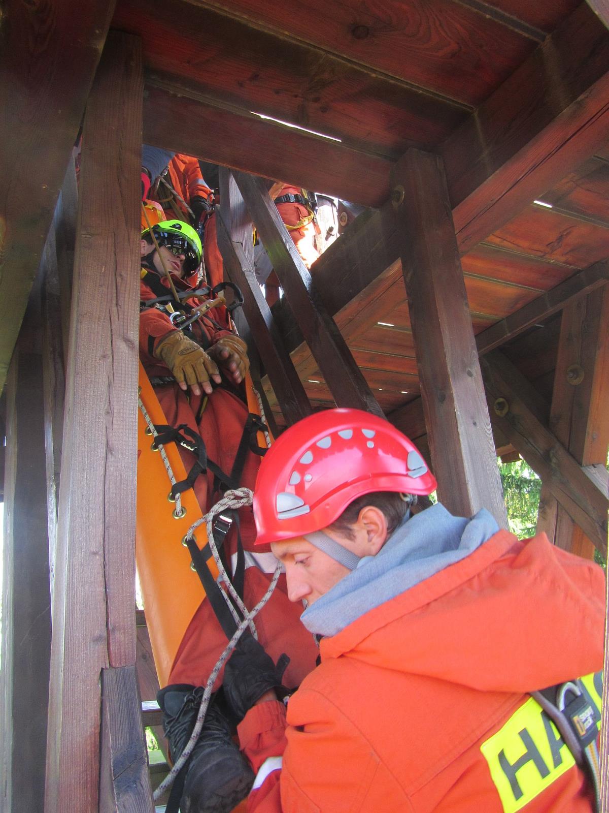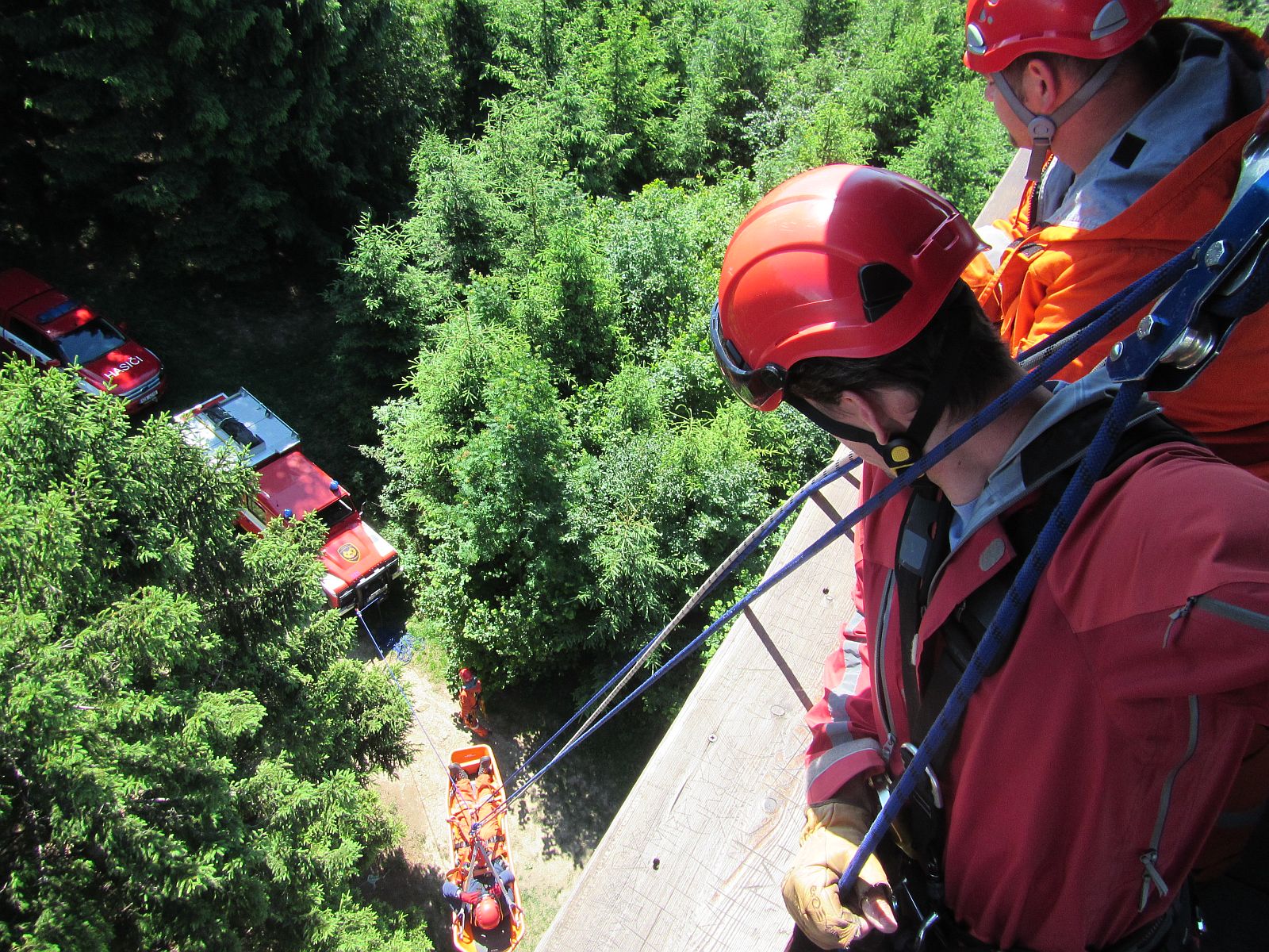 První část výcviku byla zaměřena na záchranu zraněných osob z vyhlídkového ochozu rozhledny. Hasiči si vyzkoušeli možnosti záchrany spuštěním zraněného ve vanových nosítkách pomocí lezeckého vybavení i snesením po vnitřním schodišti rozhledny.
