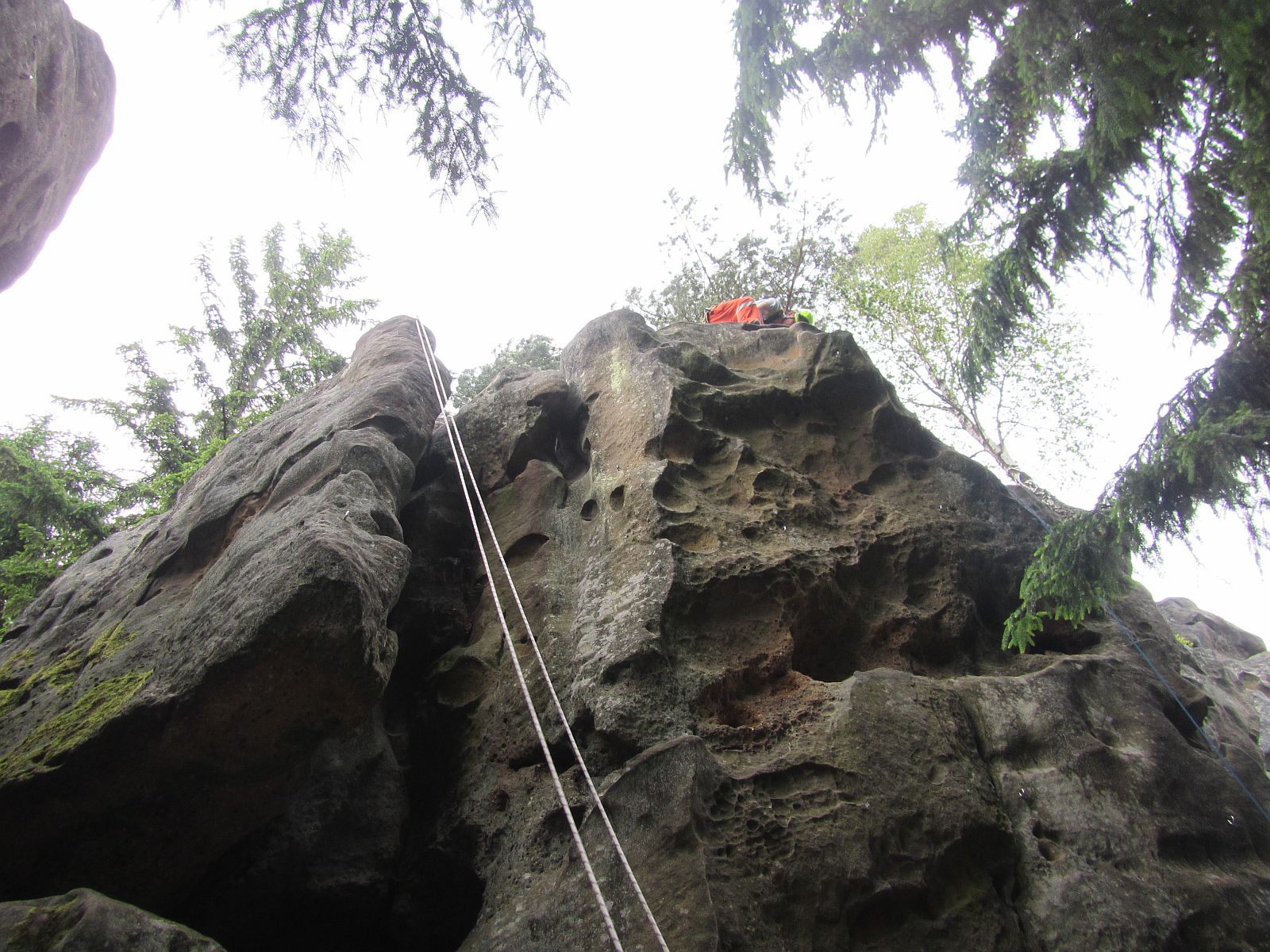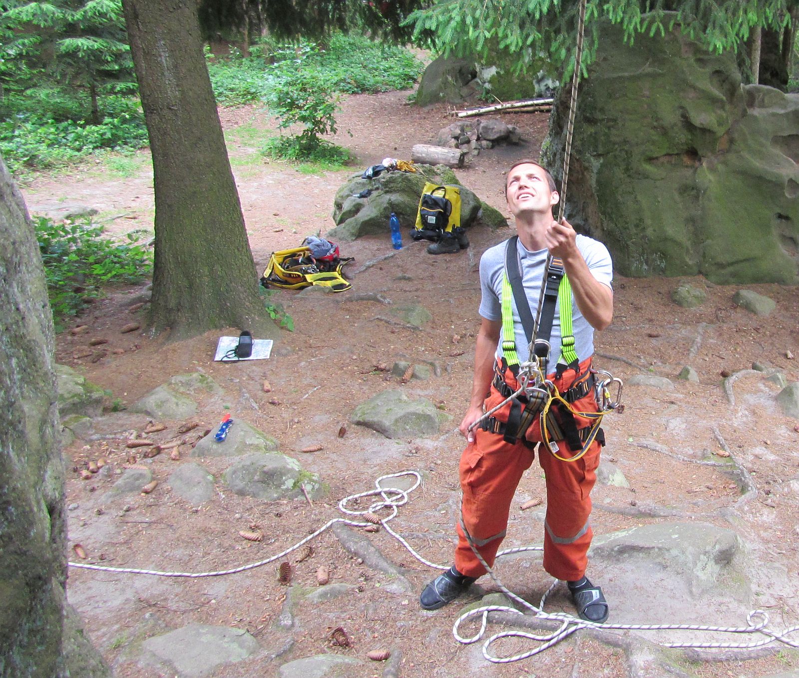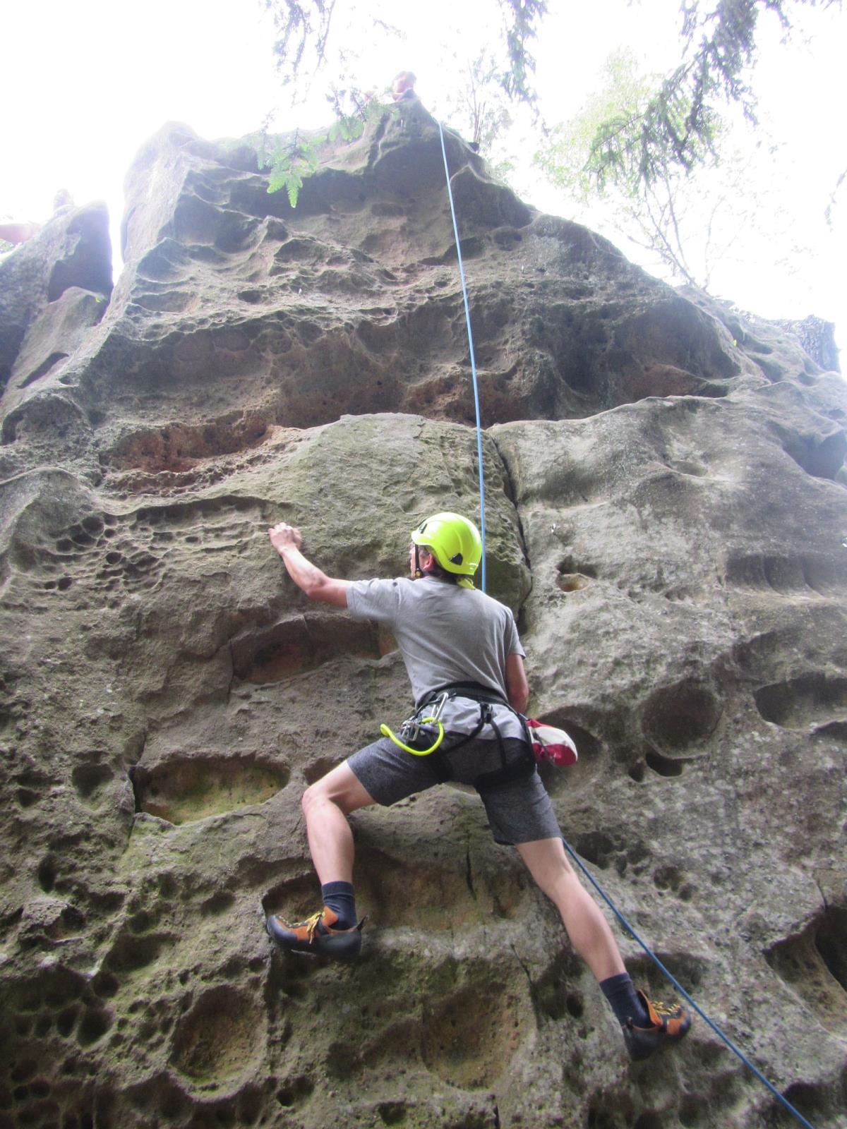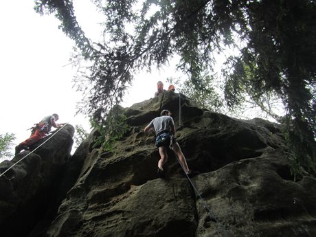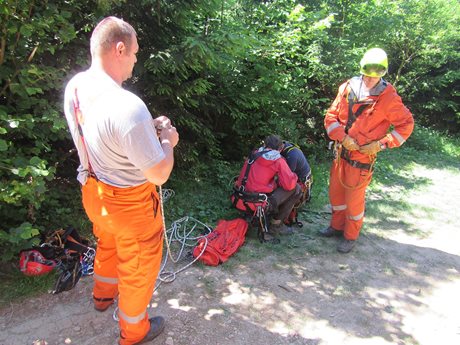 Další část zaměstnání byla zaměřena na výcvik ve zdolávání skalního terénu v lokalitě Lačnovské skály. Výcvik lezení a slaňování s využitím horolezeckého materiálu, který je ve výbavě profesionálních hasičů – lezců, byl také prověrkou fyzické kondice hasičů.