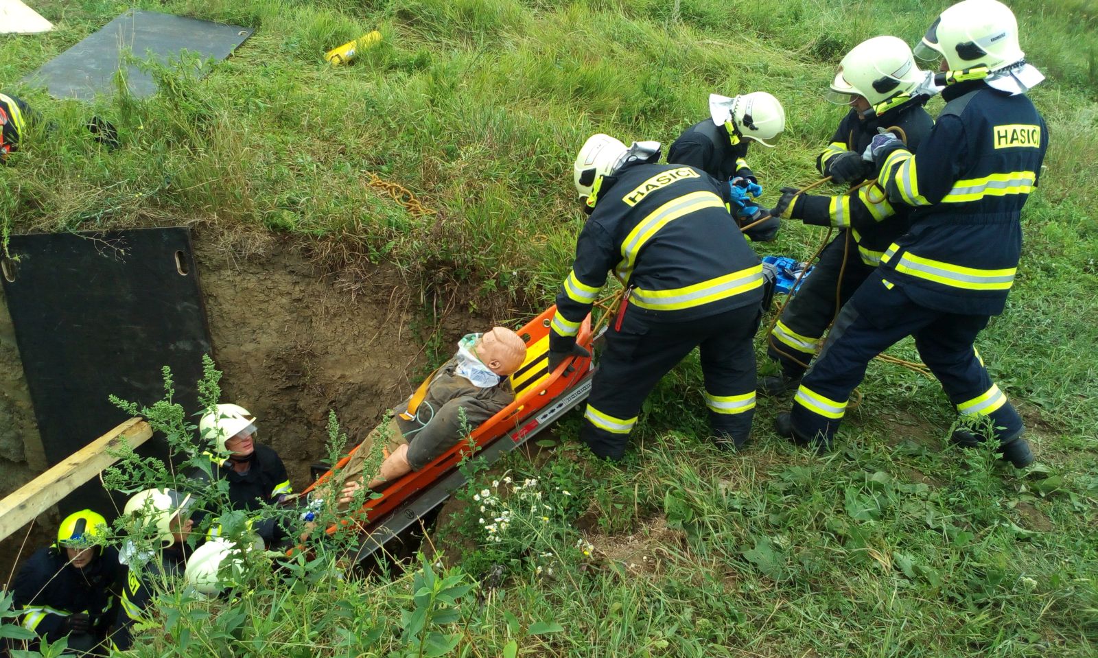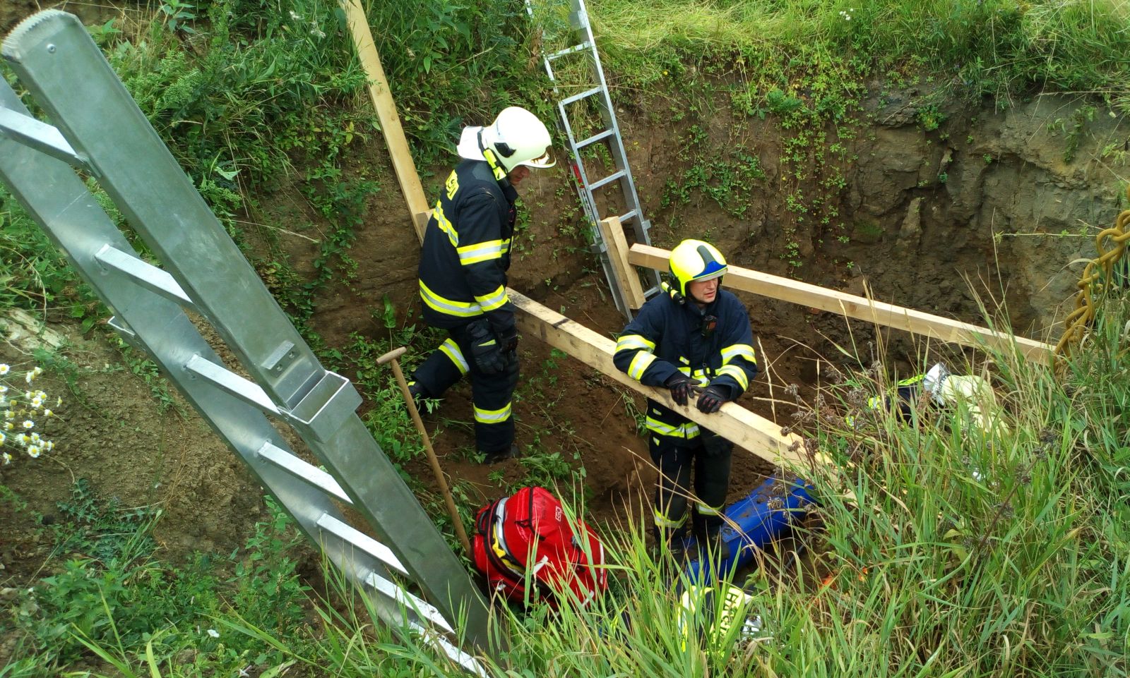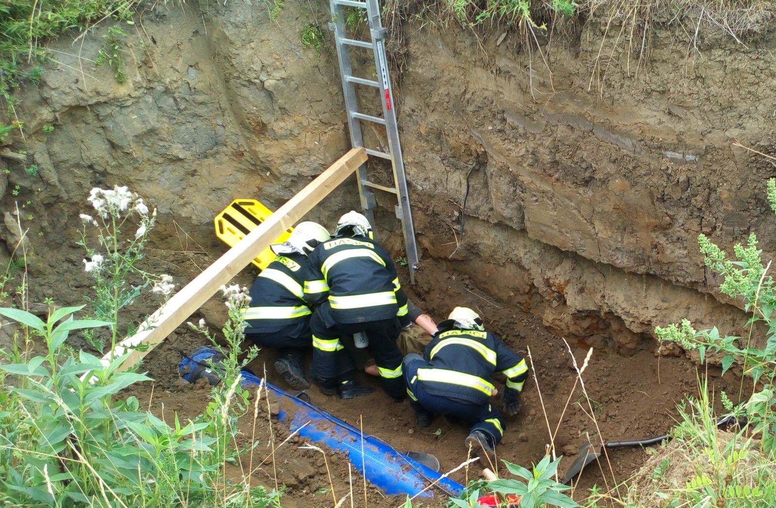 Po přivezení dalšího materiálu k zajištění stěn hasiči muže vyprostili a pomocí páteřové desky a lan vytáhli z výkopu.