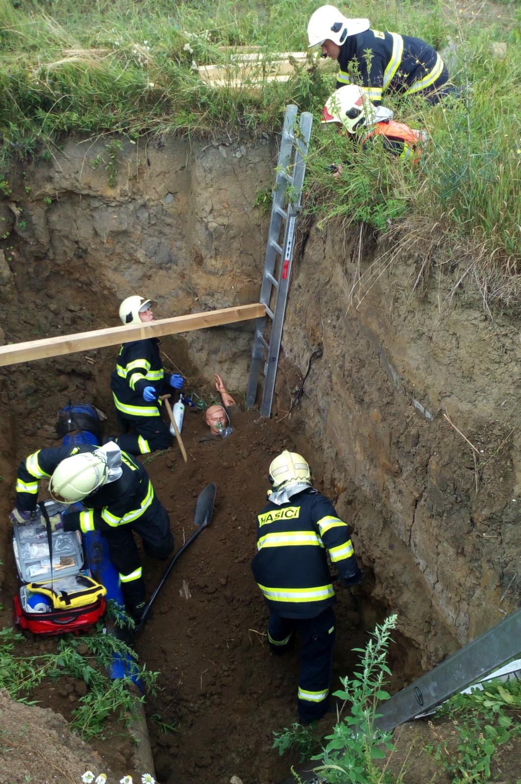 Rychlým průzkumem bylo zjištěno, že zasypaná osoba je při vědomí a komunikuje. Nacházela se v asi tři metry hlubokém výkopu u jehož vodou nasáklých hliněných stěn hrozil další sesuv. Velitel zásahu proto musel rychle vyhodnotit všechna rizika a stanovit takový postup záchranných prací, při kterém by nedošlo k ohrožení zasahujících hasičů a ze zachránců by se nestali zachraňovaní.
