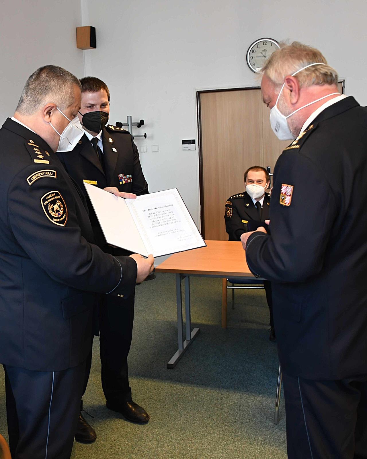 Během posledního dne služby se s Martinem Rosinou přišlo rozloučit a popřát mu mnoho dalších úspěchů vedení HZS Libereckého kraje v čele s ředitelem plk. Ing. Janem Hadrbolcem, který mu poděkoval za dlouholetou službu a zároveň mu udělil medaili HZS Libereckého kraje.