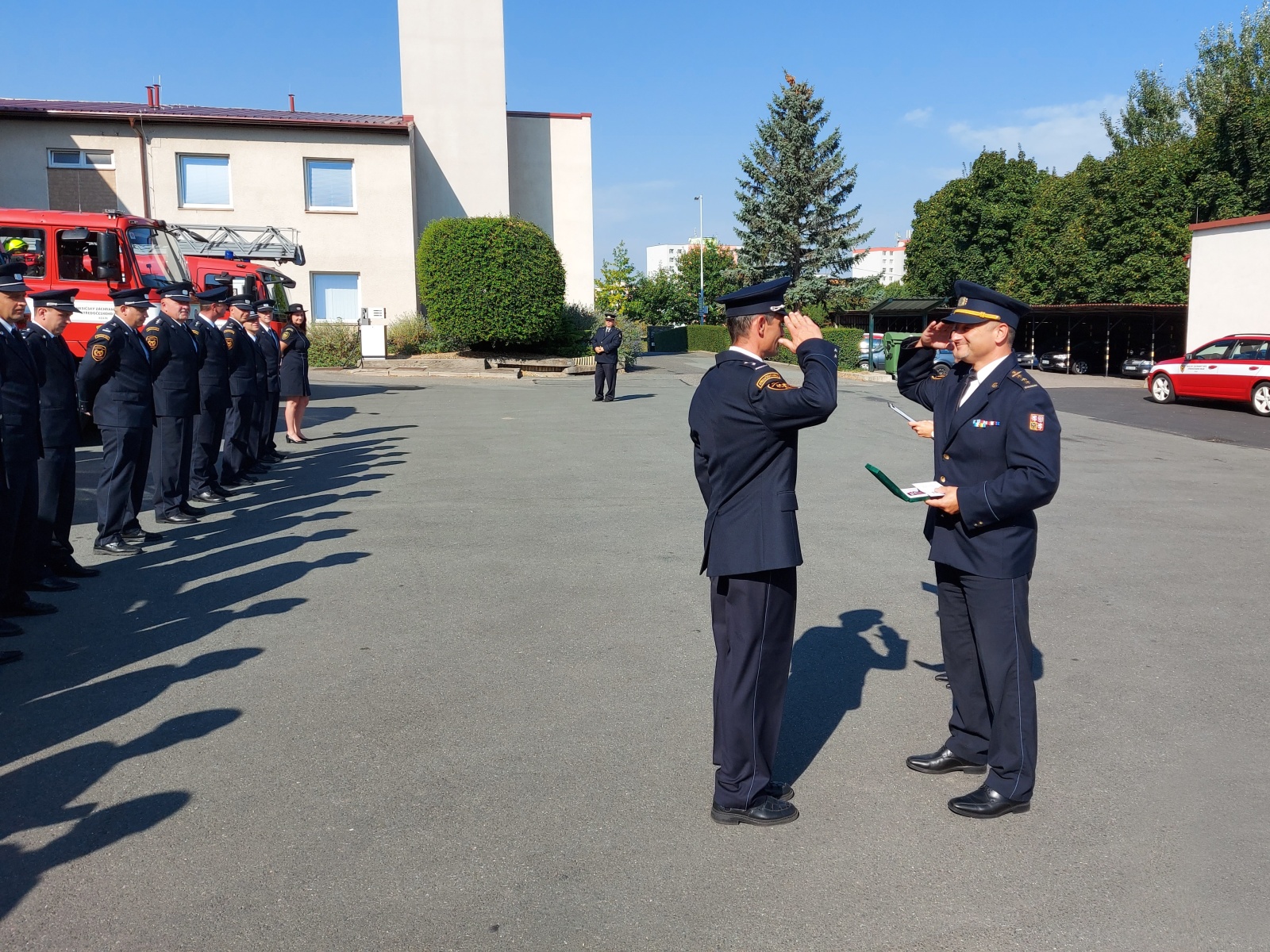 Medaili Za věrnost II. stupně převzal z rukou ředitele územního odboru Kolín HZS Středočeského kraje plk. Mgr. Bc. Dalibora Zemana velitel stanice HZS Říčany npor. Ing. Roman Hejzlar.