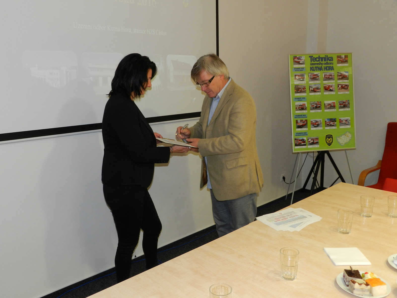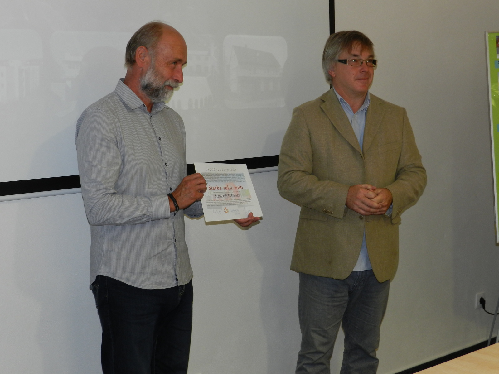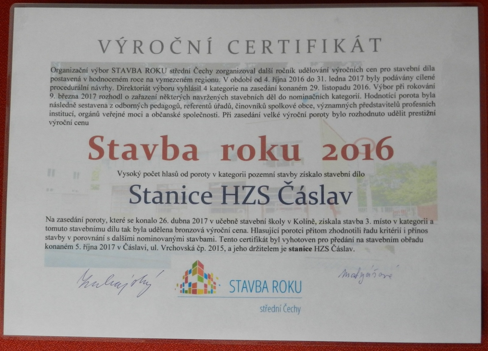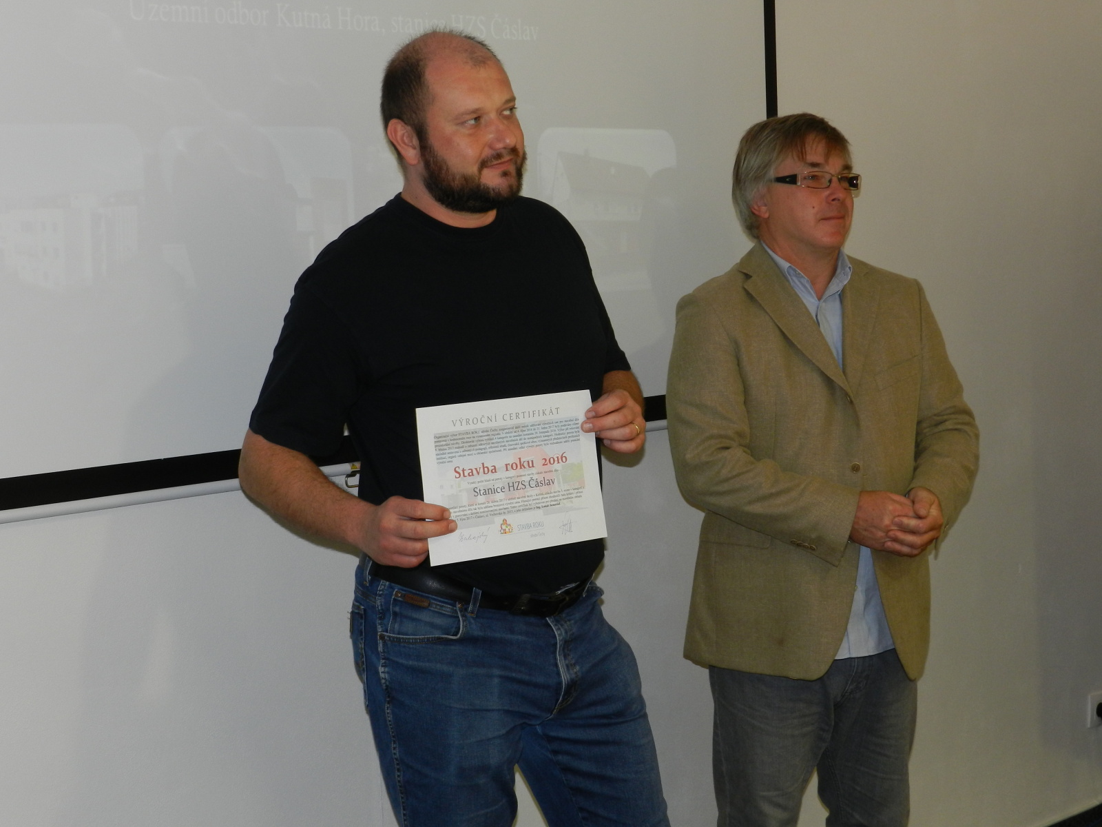 Výroční certifikát osobně převzali představitelé Města Čáslavi, starosta Ing. Jaromír Strnad a tajemník městského úřadu Ing. Antonín Hejzlar, za generálního dodavatele stavby společnost Bursík Holding, a.s., pan Lukáš Jeřábek, dále zástupce projekční kanceláře a autorského dozoru společnosti Arplan s.r.o. Ing. Lukáš Semerád a také zástupci HZS Středočeského kraje, Mgr. Kateřina Cibulková (nyní HZS Karlovarského kraje), Michal Čížek, DiS., plk. Ing. Jiří Pokorný, mjr. Ing. Pavel Říha a npor. Bc. Petr Klatovský.