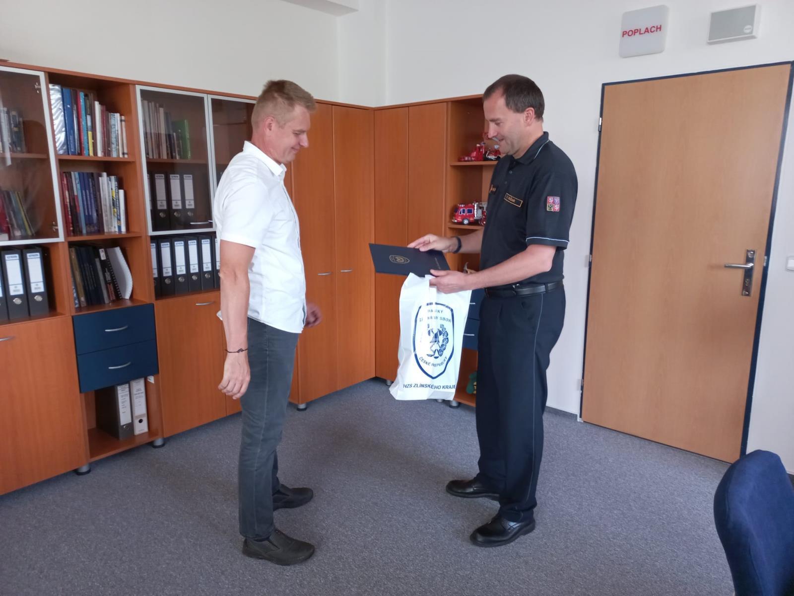 Na přátelském setkání s ředitelem HZS Zlínského kraje plk. Ing. Vítem Rušarem zavzpomínal na své hasičské začátky a velké události. Za dlouholetou obětavou práci a službu občanům mu krajský ředitel poděkoval a předal písemné poděkování a několik darů.