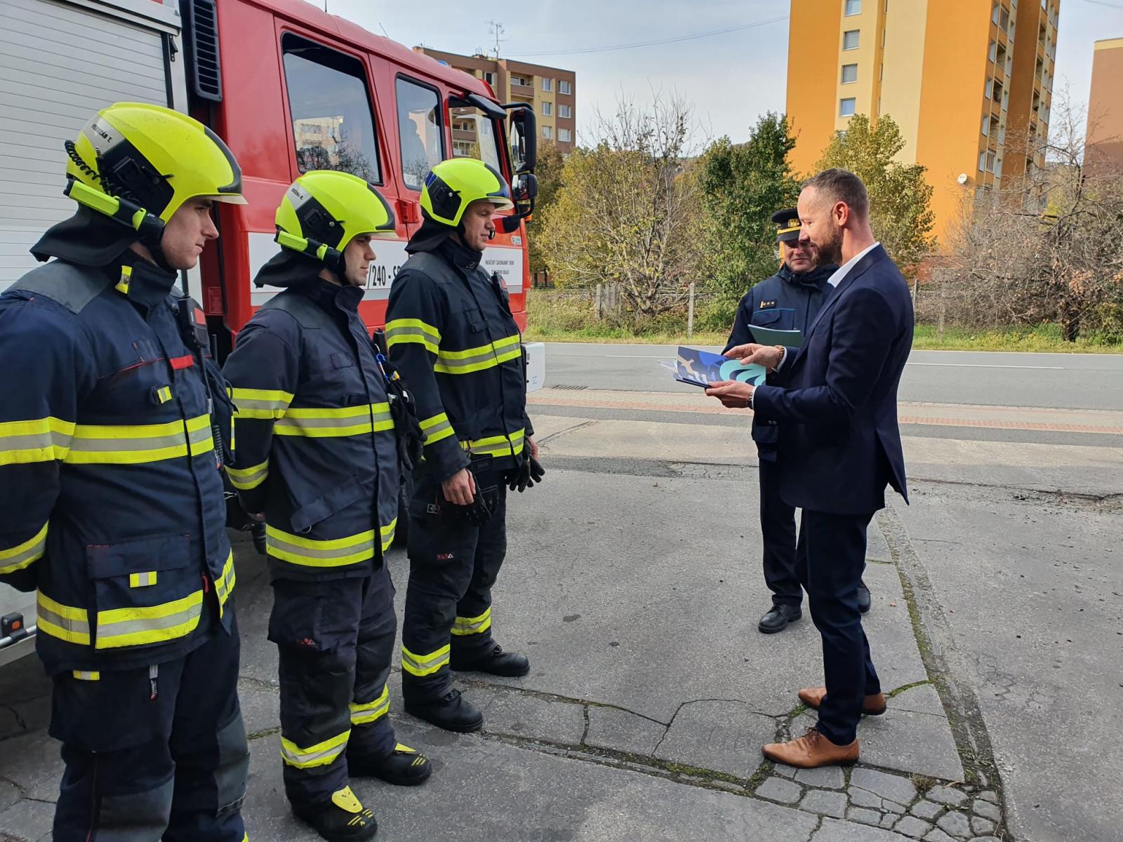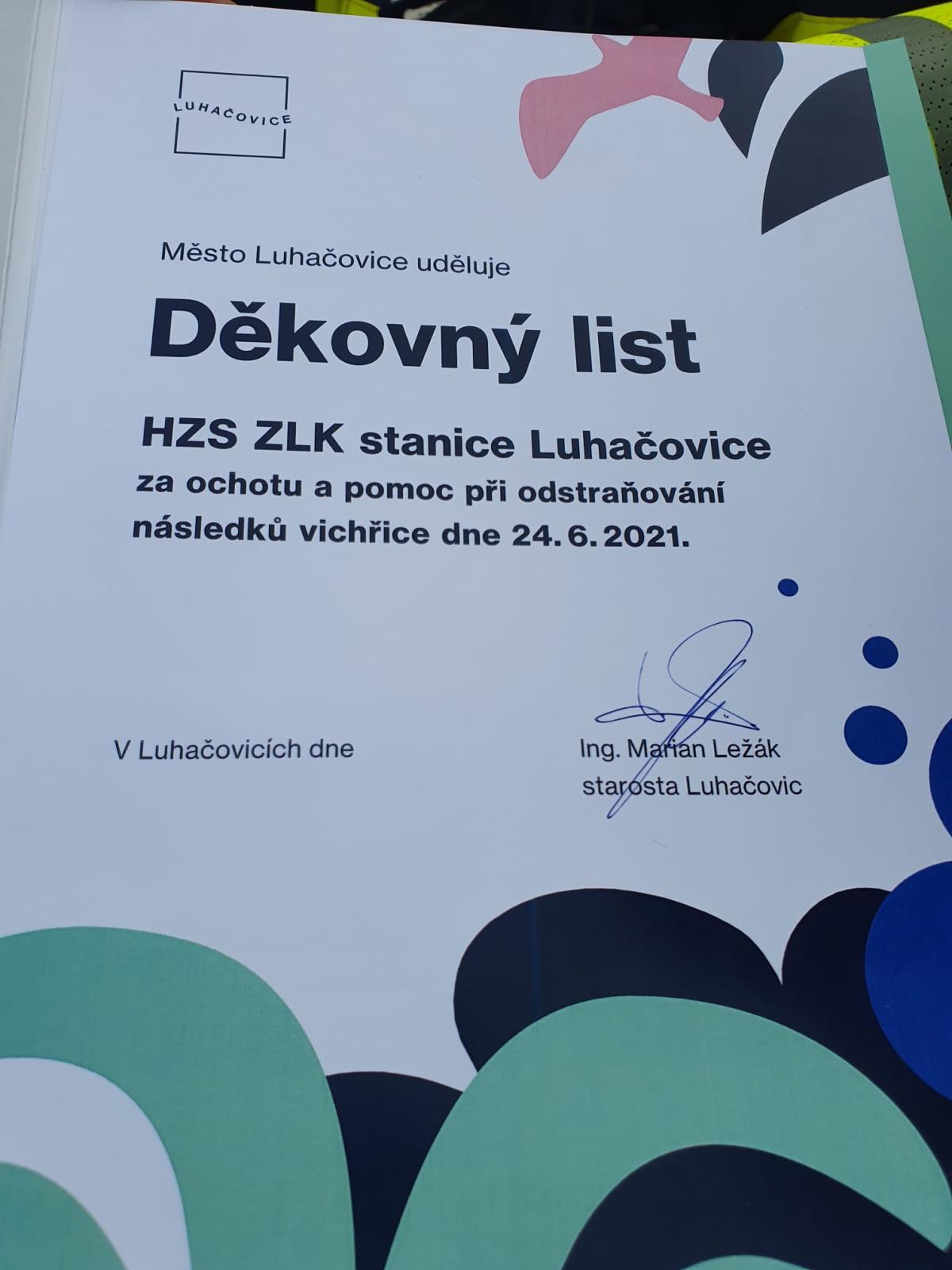 Děkovný list hasiči obdrželi z rukou starosty města Luhačovice Mariana Ležáka, který hasičům osobně poděkoval za jejich pomoc při nelehkých chvílích, kdy silný vítr potrápil obyvatele lázeňského města.
