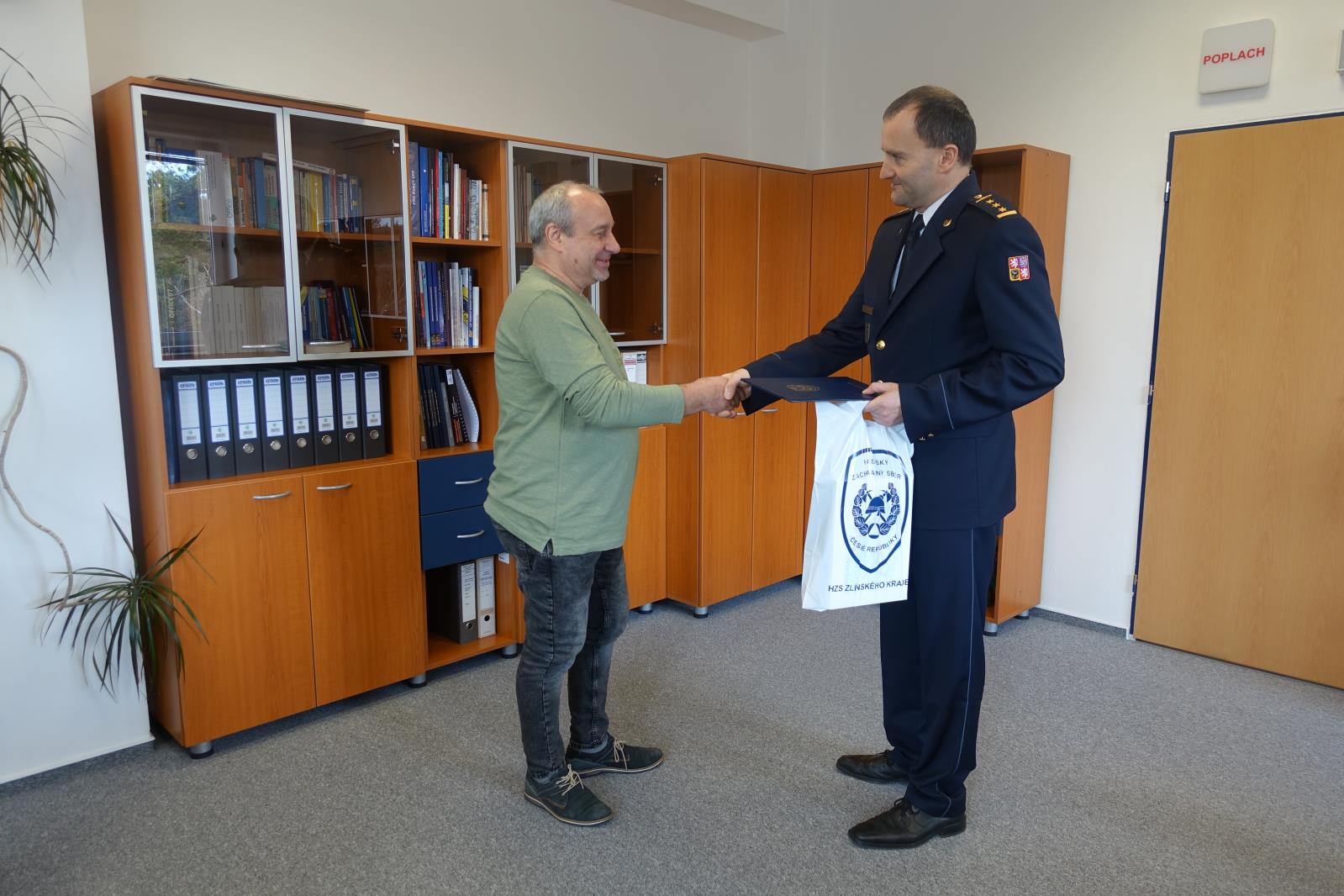 Na přátelském setkání s ředitelem HZS Zlínského kraje plk. Ing. Vítem Rušarem zavzpomínal na své hasičské začátky a velké události. Za dlouholetou obětavou práci a službu občanům mu krajský ředitel poděkoval a předal písemné poděkování a několik darů.