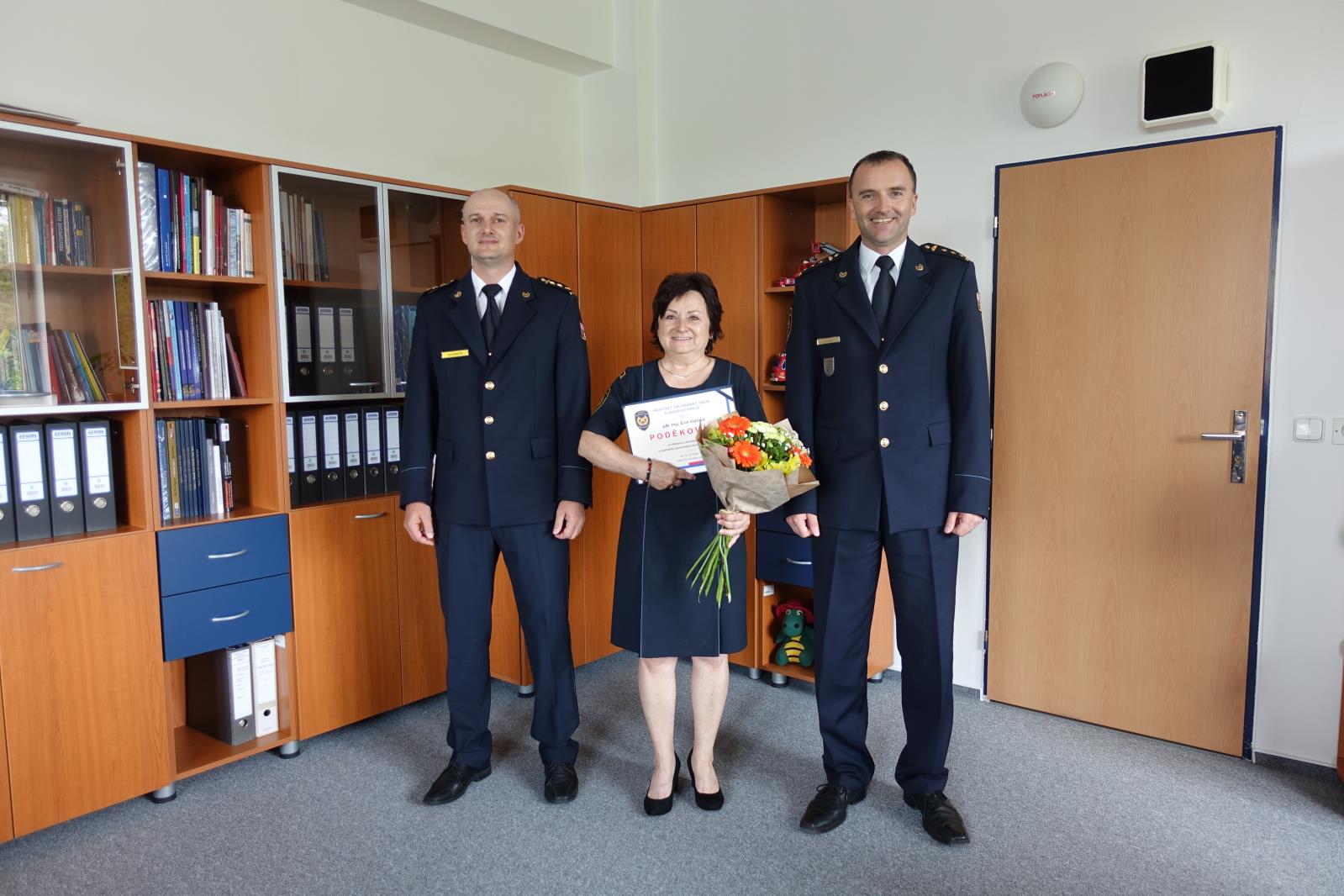 Na přátelském setkání u ředitele HZS Zlínského kraje plk. Ing. Víta Rušara společně s ekonomickým náměstkem plk. Mgr. at Mgr. Petrem Bobčíkem zavzpomínali na hasičské začátky a následně ji pánové předali písemné poděkování a několik darů včetně velké kytice.