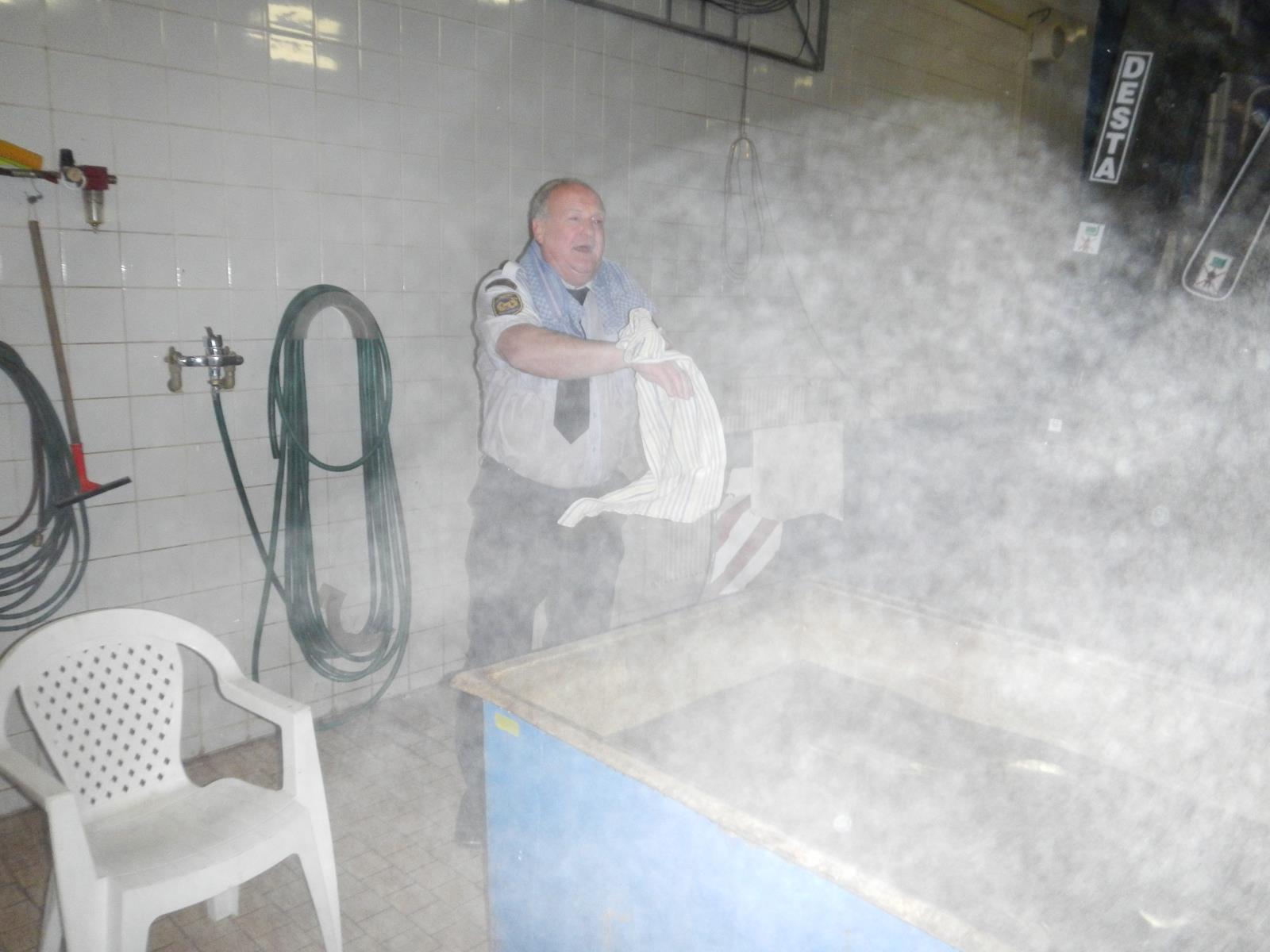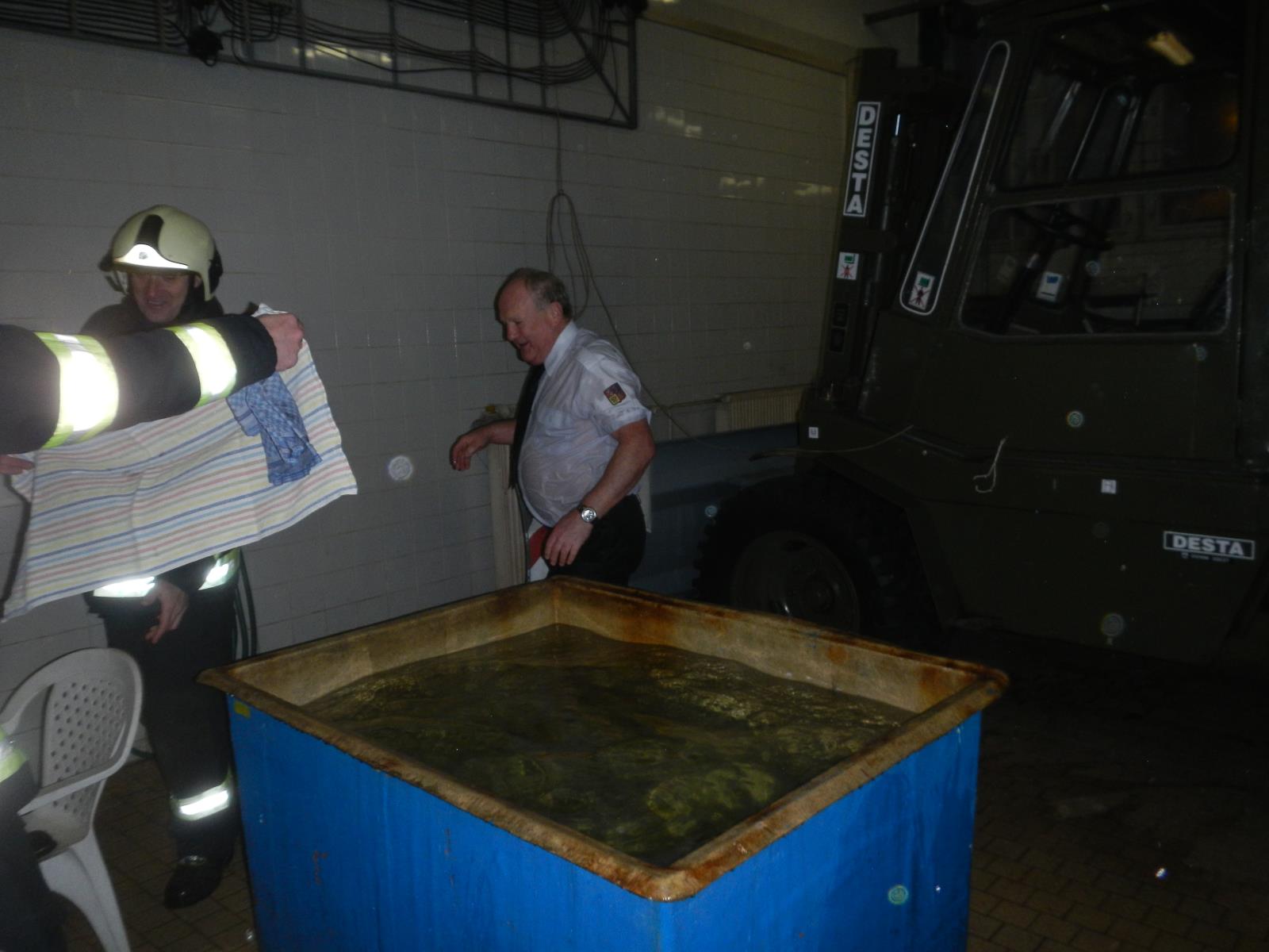 Dnešní ranní předání směn bylo pro Karla Žahoura poslední. Jeho hasiči se mu "odvděčili" tak, jak bývá u hasičů zvykem, a vykoupali ho v kádi s vodou.