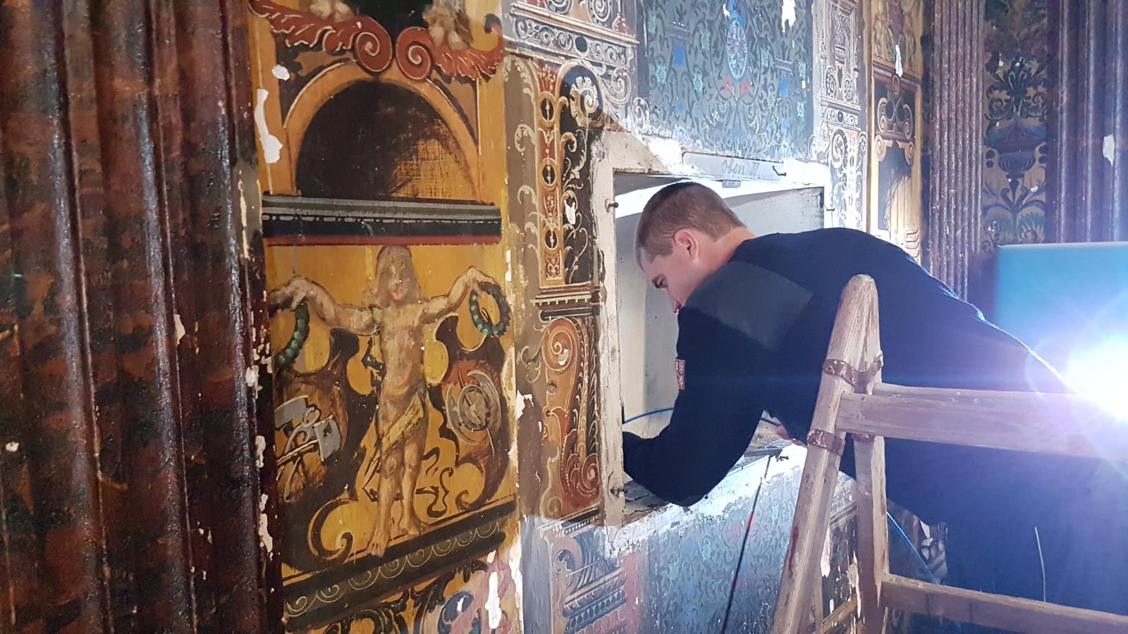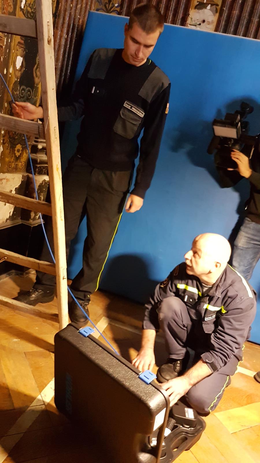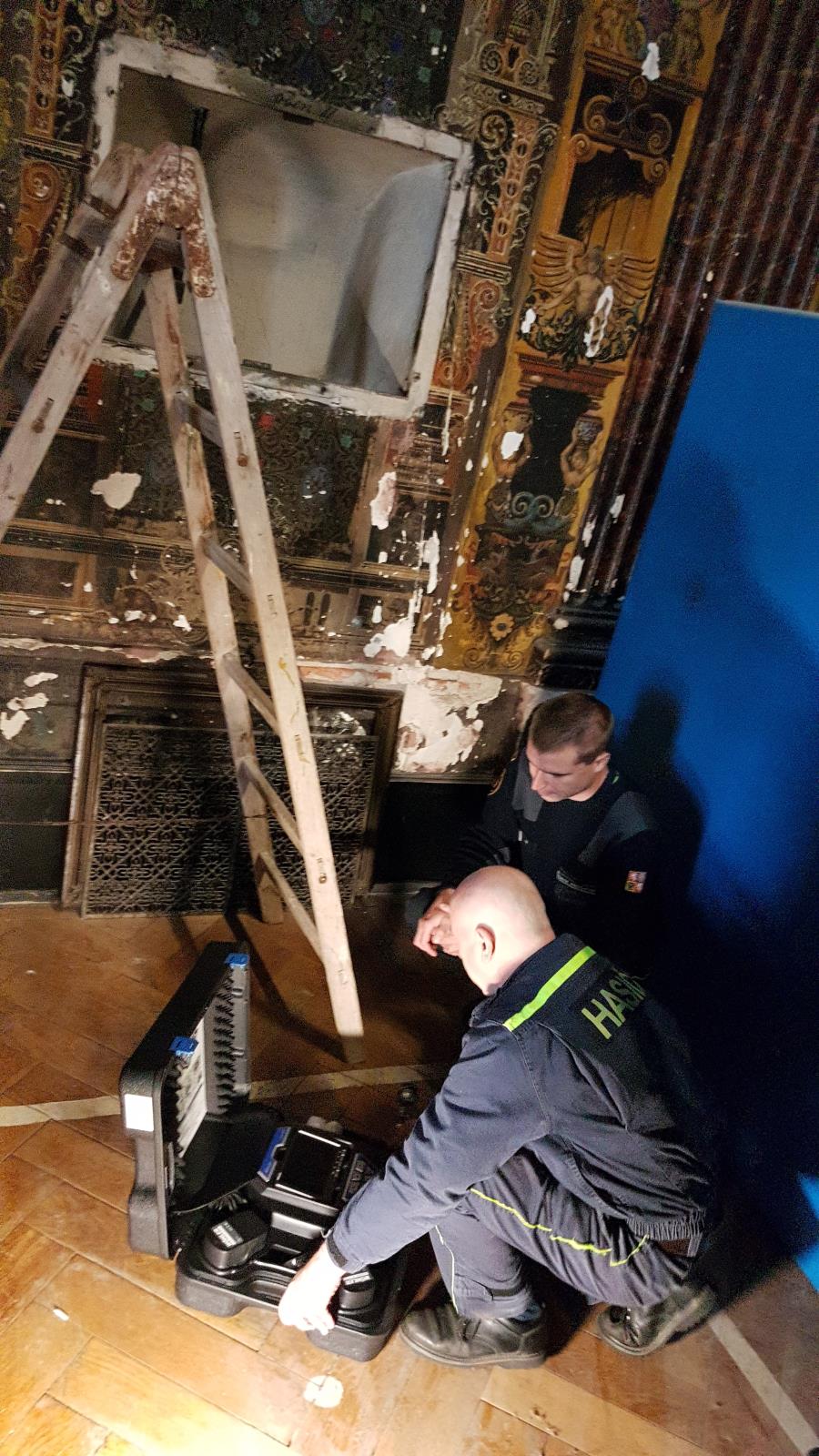 Stavební otvor, který pod zdobenou zinkovou litinovou mříží v jedné ze stěn sálu našel restaurátor Radomír Surma, je velmi pravděpodobně výstupem původní dobového horkovzdušného topení, které vzniklo už při stavbě školní budovy. Prostý pohled do otvoru ovšem mnoho neprozrazoval, protože se jedná o úzkou a zřejmě velmi hlubokou šachtu. „Napadlo mě, že by v této situaci bylo možné požádat hasiče o pomoc, protože teď disponují technikou, která se i do takto úzkých prostor dokáže dostat,“ vysvětlil primátor Antonín Staněk. Hasiči se tedy v úterý 24. října dopoledne pustili do průzkumu otvoru pomocí štěrbinové kamery.