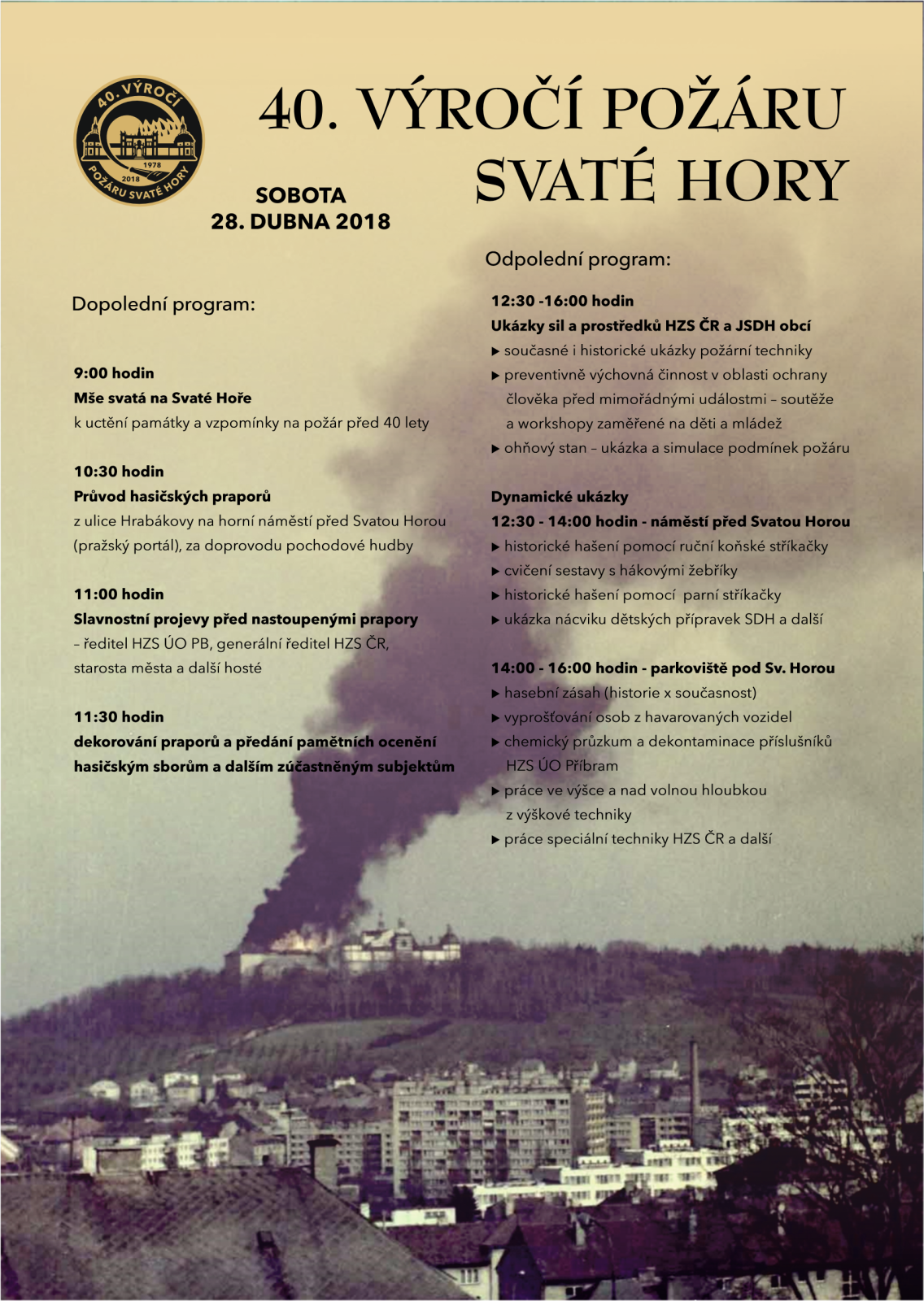 Sobotní program však není připraven jen pro hasiče a jejich příznivce. Vzpomínková akce začne v devět hodin Mší svatou. Následně vyjde z parkoviště pod svatohorským areálem průvod sborů, které zde při ničivém požáru zasahovaly. Jejich cílem bude prostranství před Pražskou bránou, kde jim budou za účasti vedení Hasičského záchranného sboru ČR, Sdružení hasičů Čech, Moravy a Slezska a představitelů Města Příbrami i regionu předána pamětní ocenění a zároveň budou dekorovány prapory nastoupených sborů.